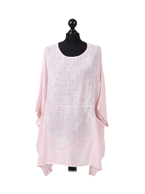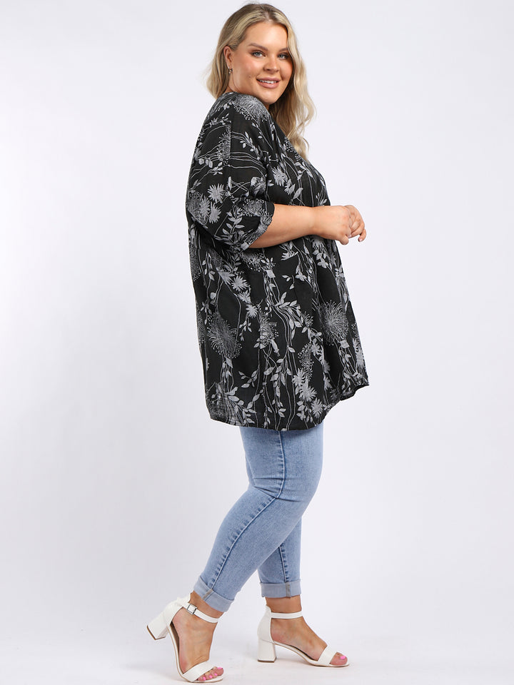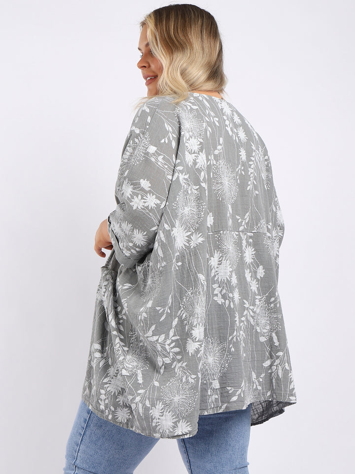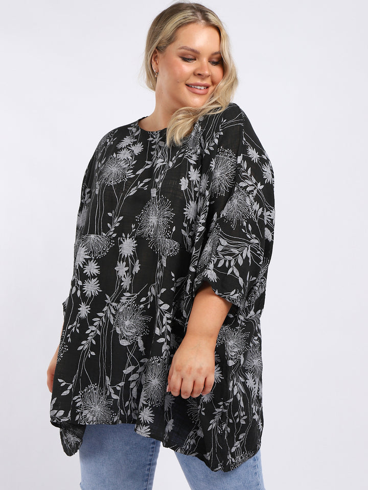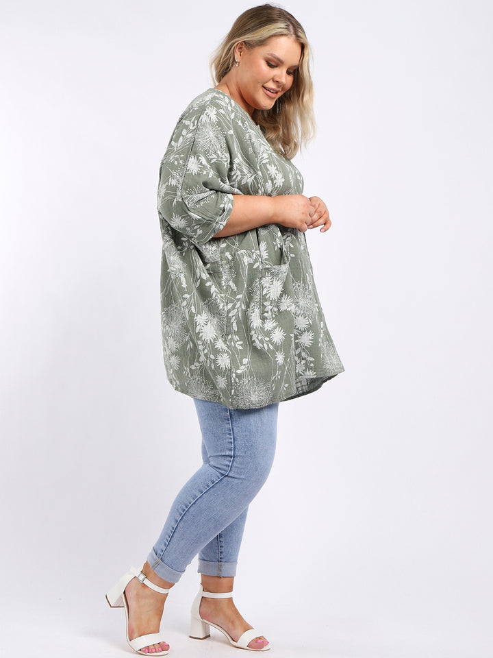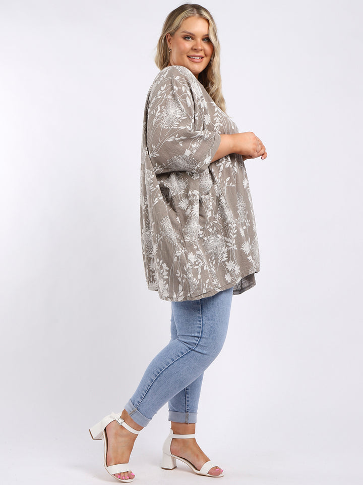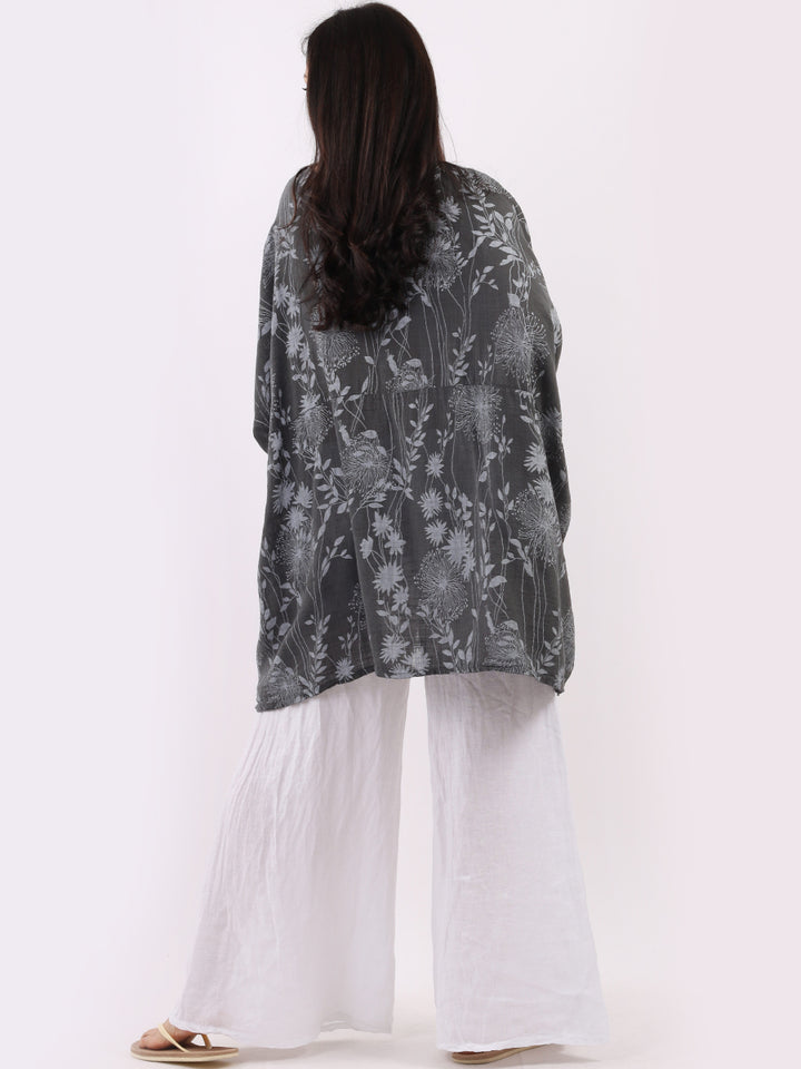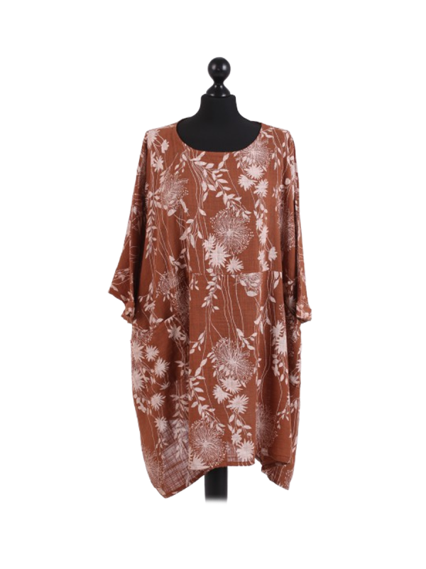 A carefree summer blowing dandelions away is a fantasy that stays young forever! Inspired by childhood fantasies and fun days fashion boutique crafted floral print with vine style tropical leaves in backdrop with oversized dandelions up front. Made in cotton and stitched in Italy the top is batwing style with drappy sides and hem perfect for curvy bodies and seek alike, comfort round neckline and tunic hem makes it unique and adorable. Dress it with white capris and sandals with ankle straps and make a mark of beauty