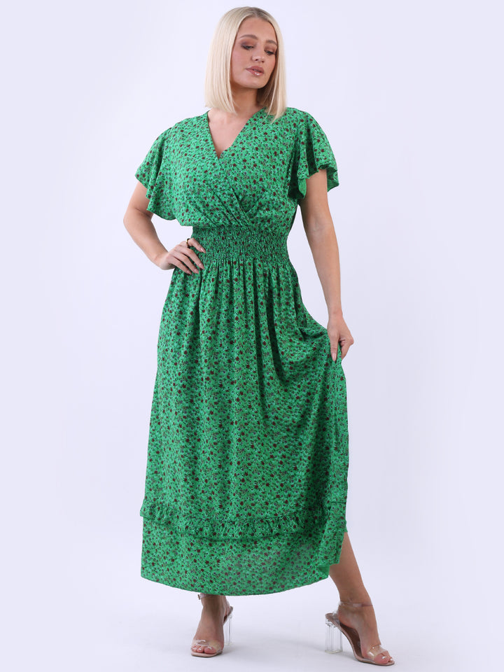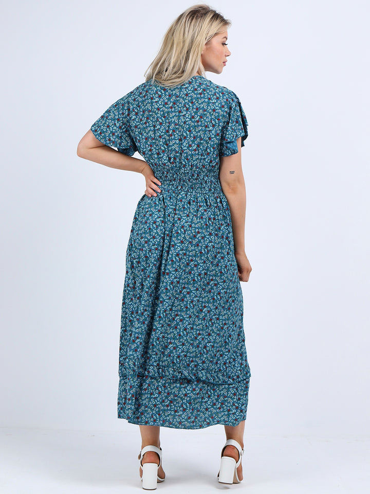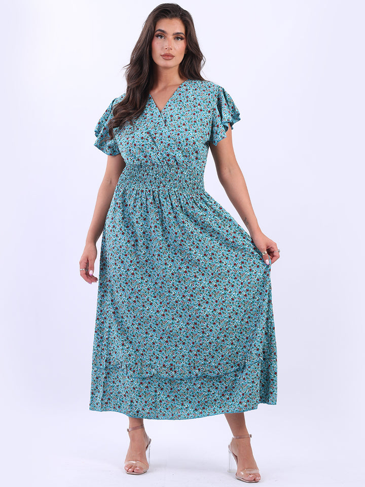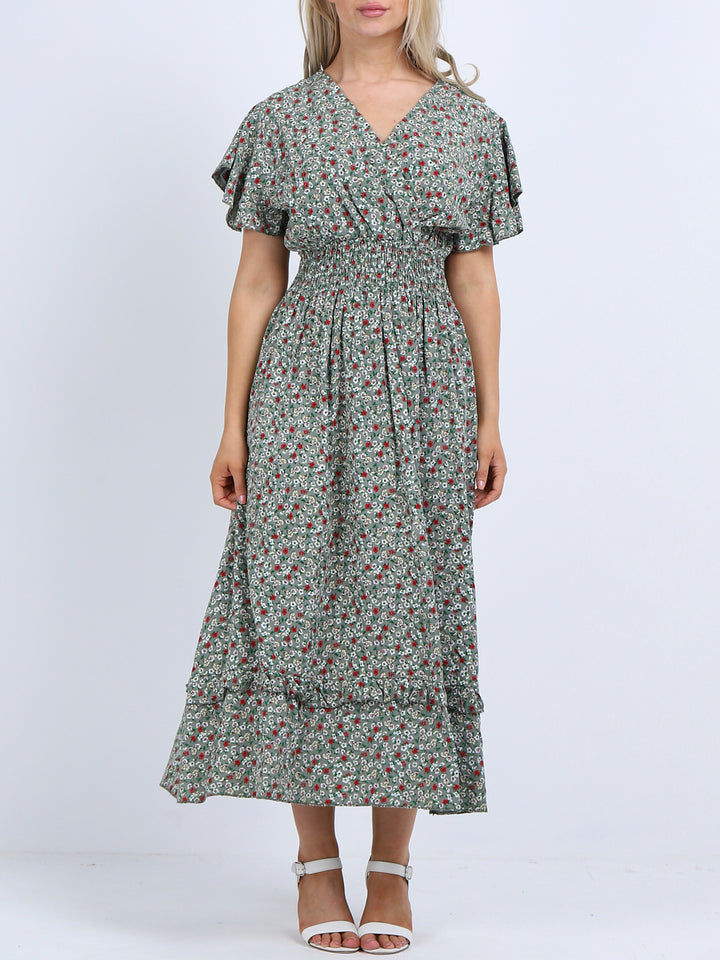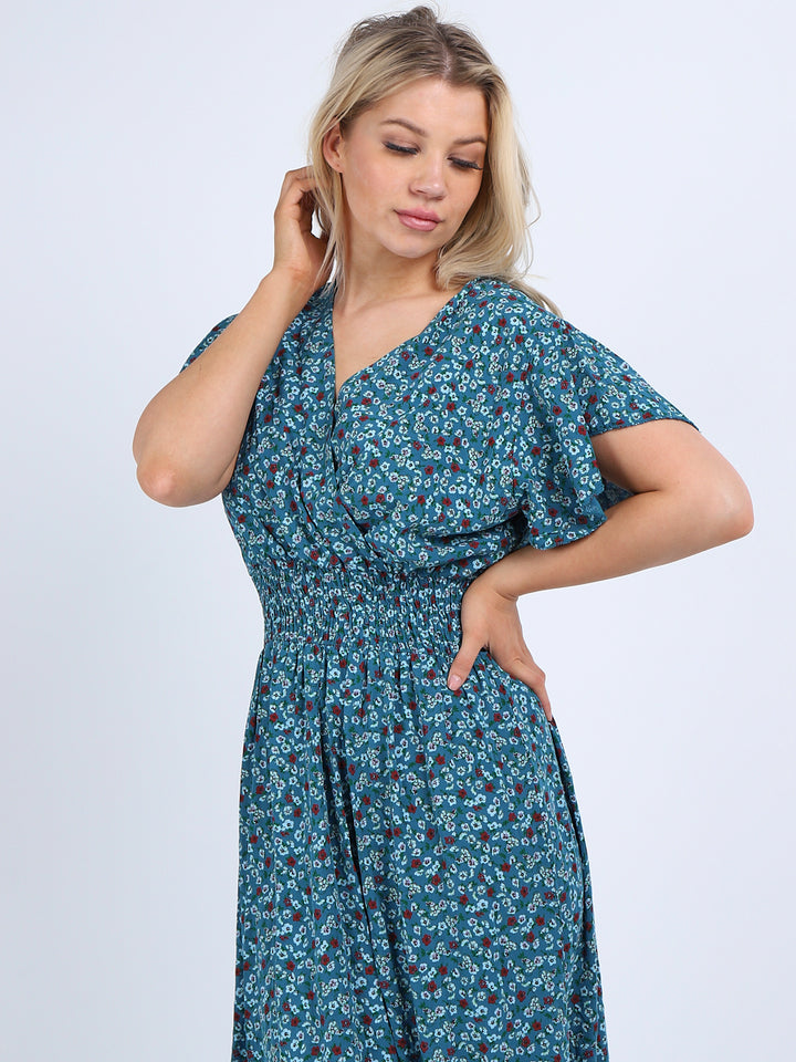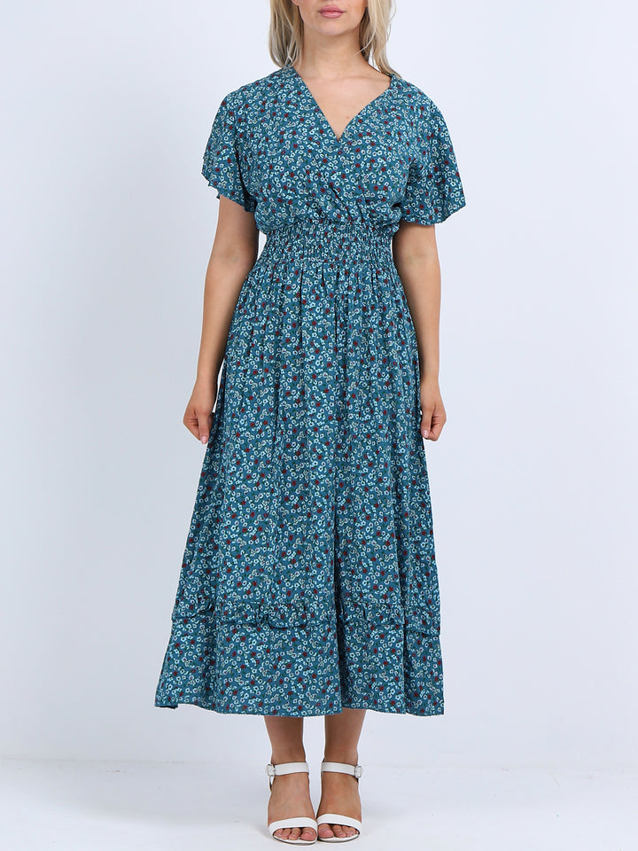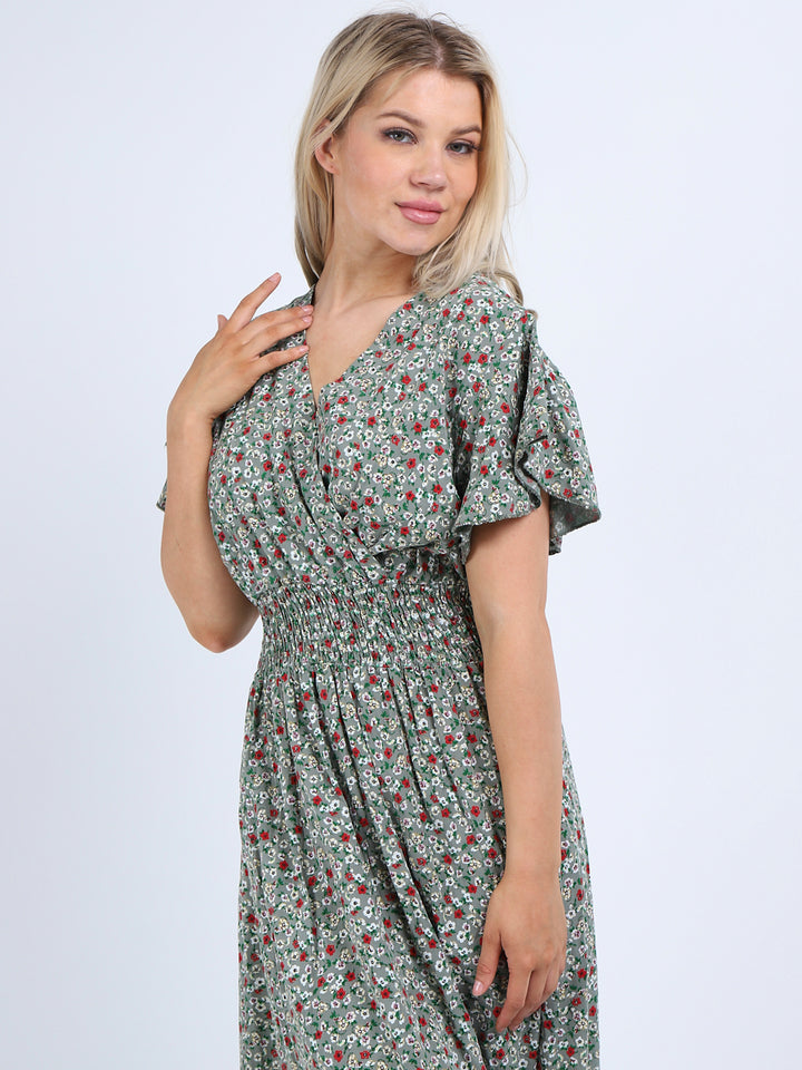 Buzzing with blooming floral print, classic and personalized, ideal to start a brand new season with a bang! Just what women wearer would love to add to their everyday go-to wardrobe collection with features that are comfort and style combined? Plunging V-neckline that over laps for voluminous look, smocked waist for a sleek finish look flutter sleeves that make summer wearing cool and comfy with over size lagenlook fit. This is made in Italy for promising quality. Team it with high heel sandals and tassel straw bohemian tote.