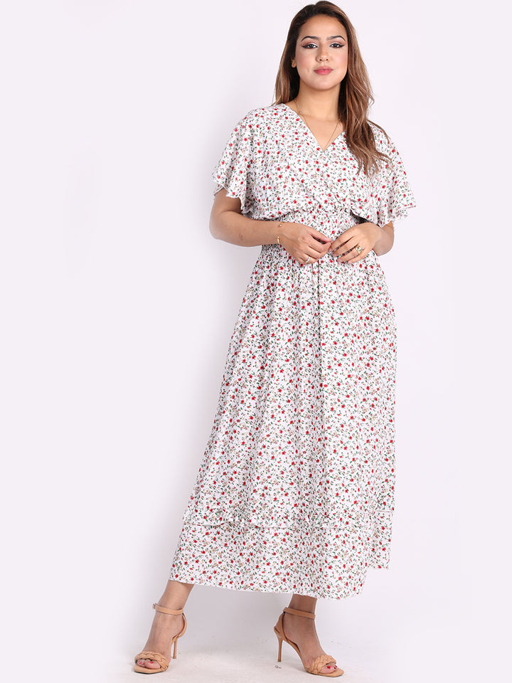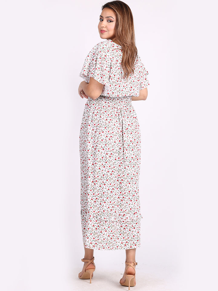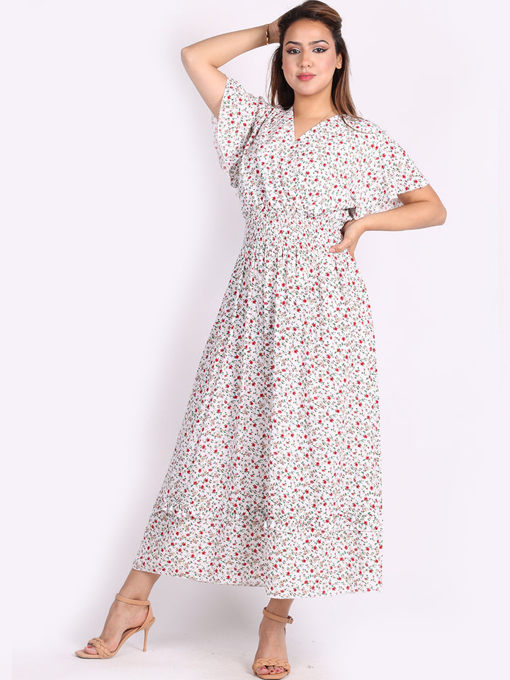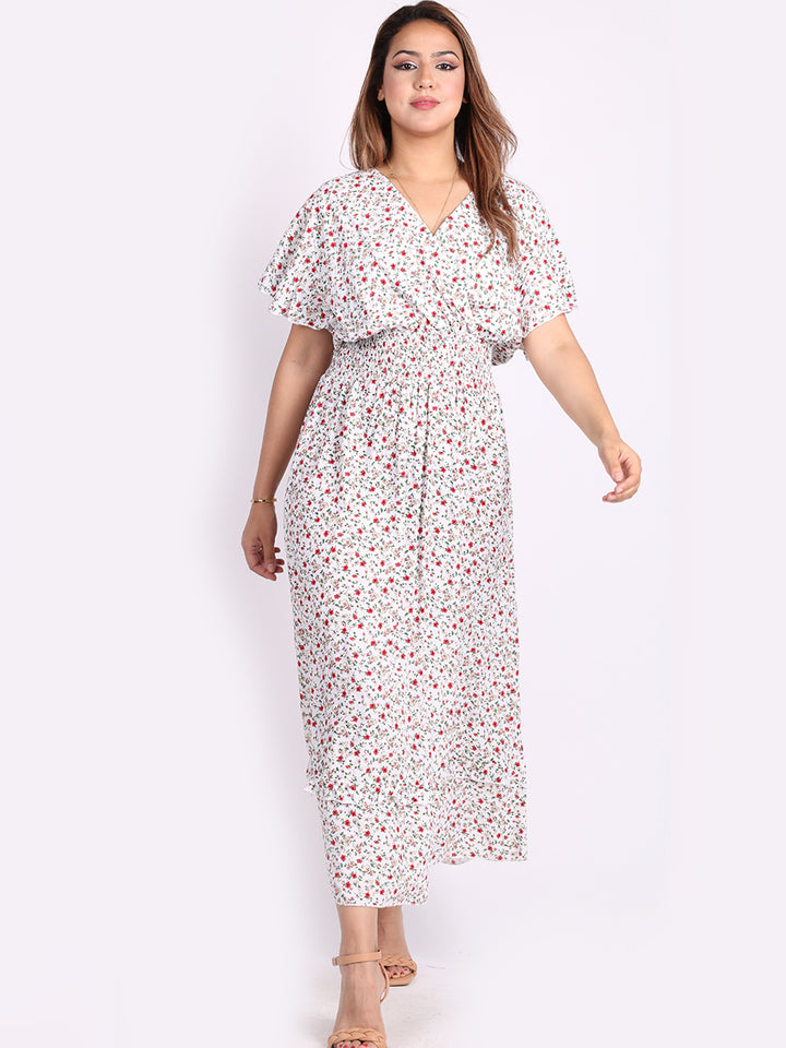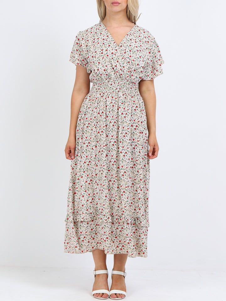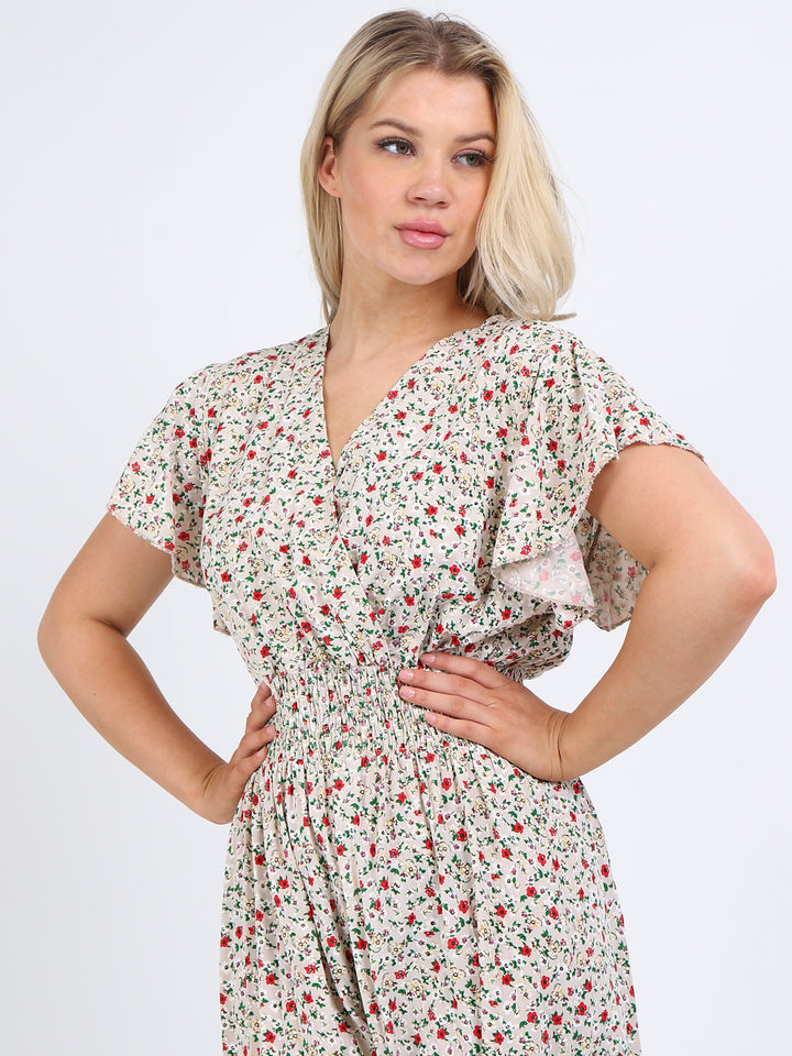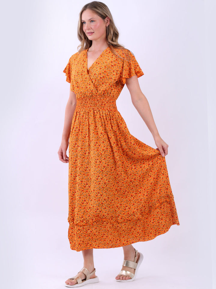 Buzzing with blooming floral print, classic and personalized, ideal to start a brand new season with a bang! Just what women wearer would love to add to their everyday go-to wardrobe collection with features that are comfort and style combined? Plunging V-neckline that over laps for voluminous look, smocked waist for a sleek finish look flutter sleeves that make summer wearing cool and comfy with over size lagenlook fit. This is made in Italy for promising quality. Team it with high heel sandals and tassel straw bohemian tote.