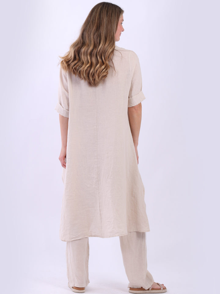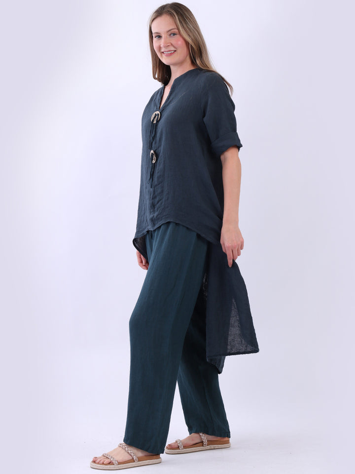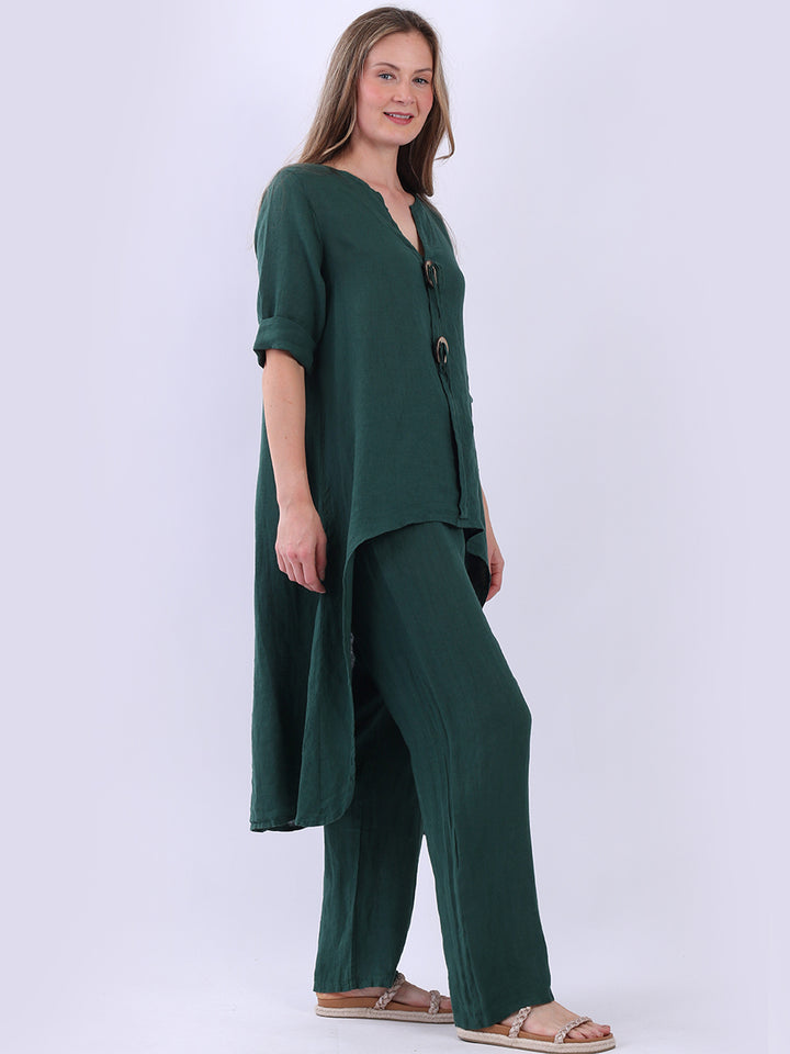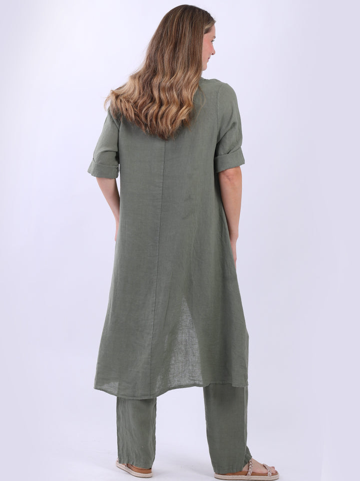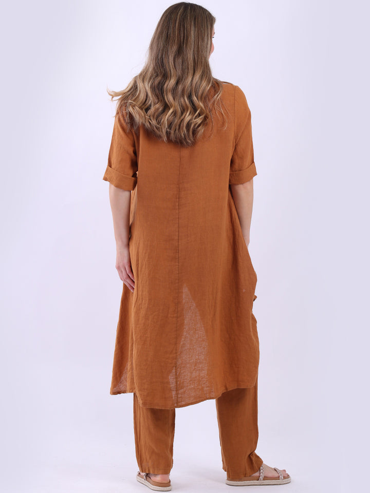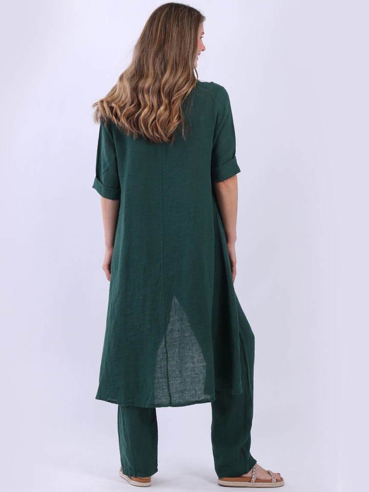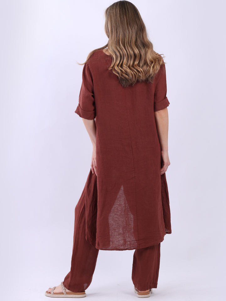 Red Wholesale fashion boutique presents this solid linen lagenlook dress which is going to become women's favourite wardrobe piece offering a perfect blend of style and comfort featuring front decorative buttons, notch neck, rolled-up sleeves and hi-low hem making it a standalone piece. Made in Italy this dress can go perfectly with a matching wide-leg trouser and block heels.