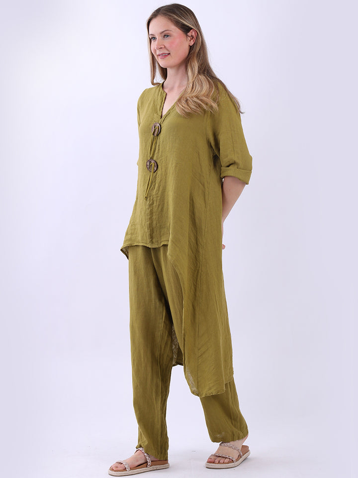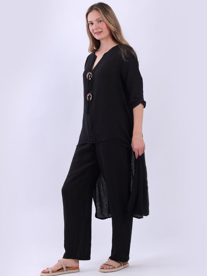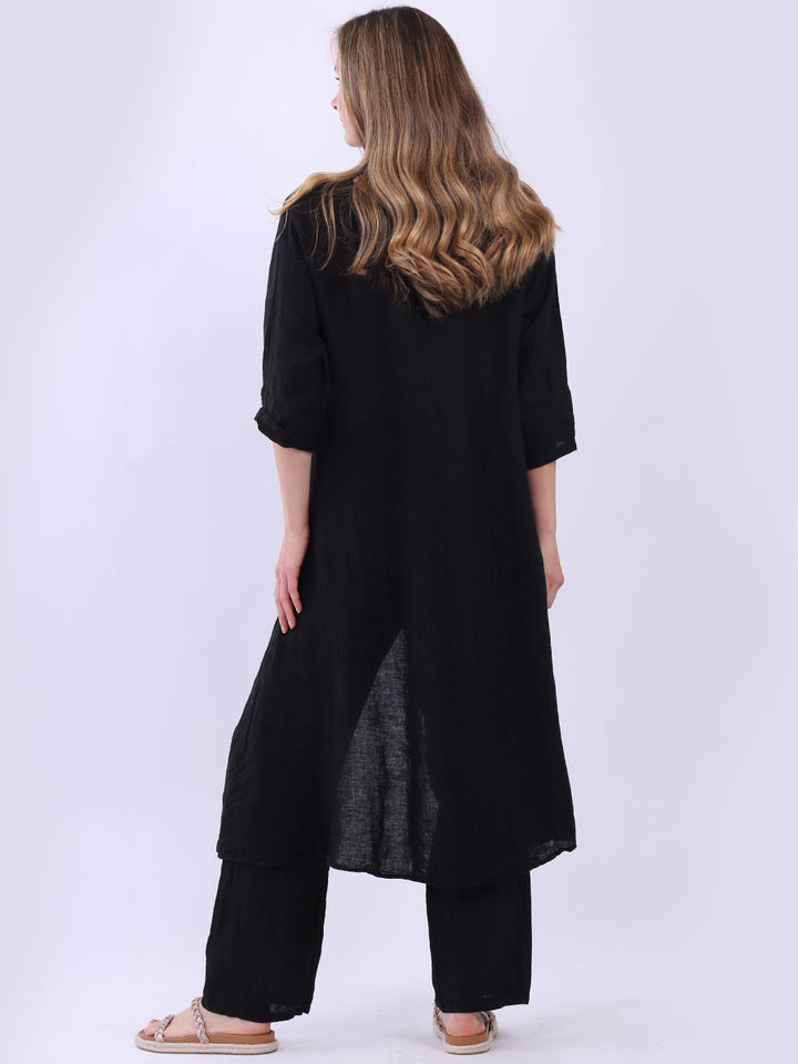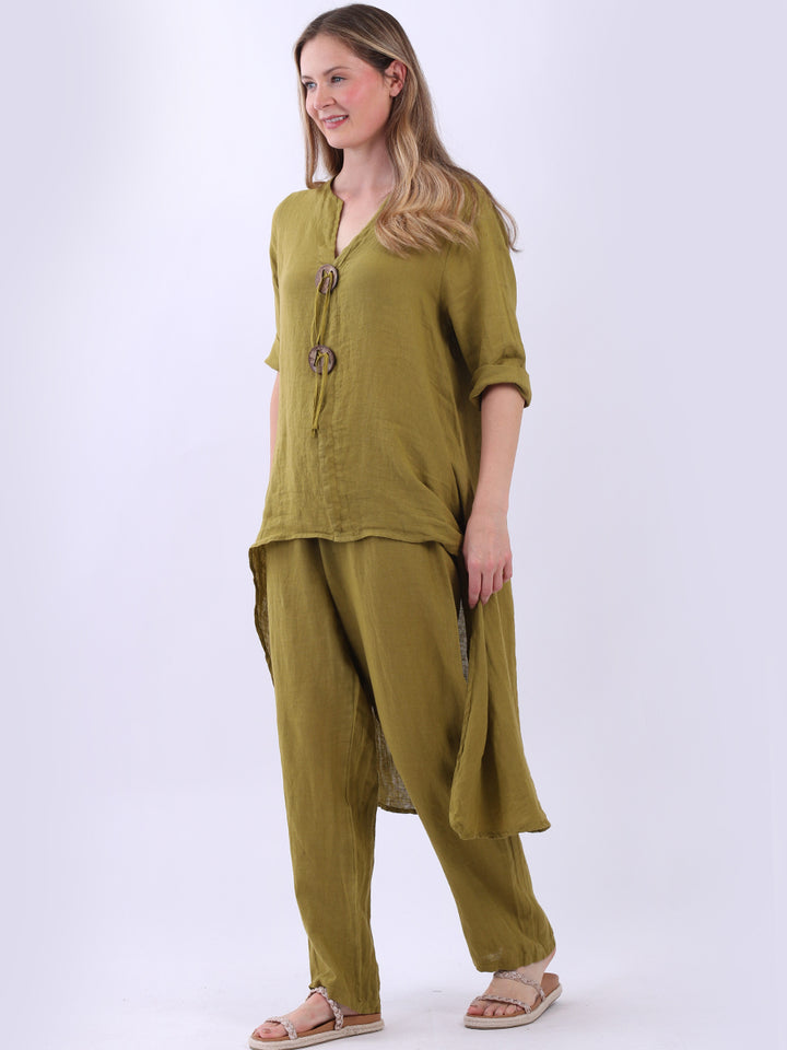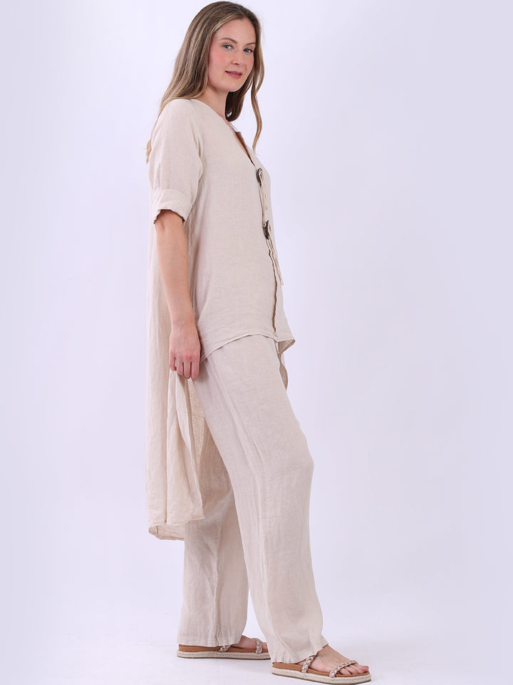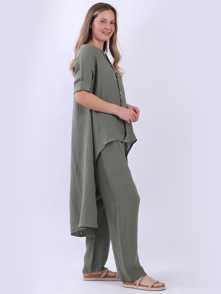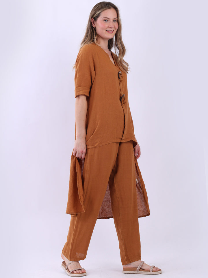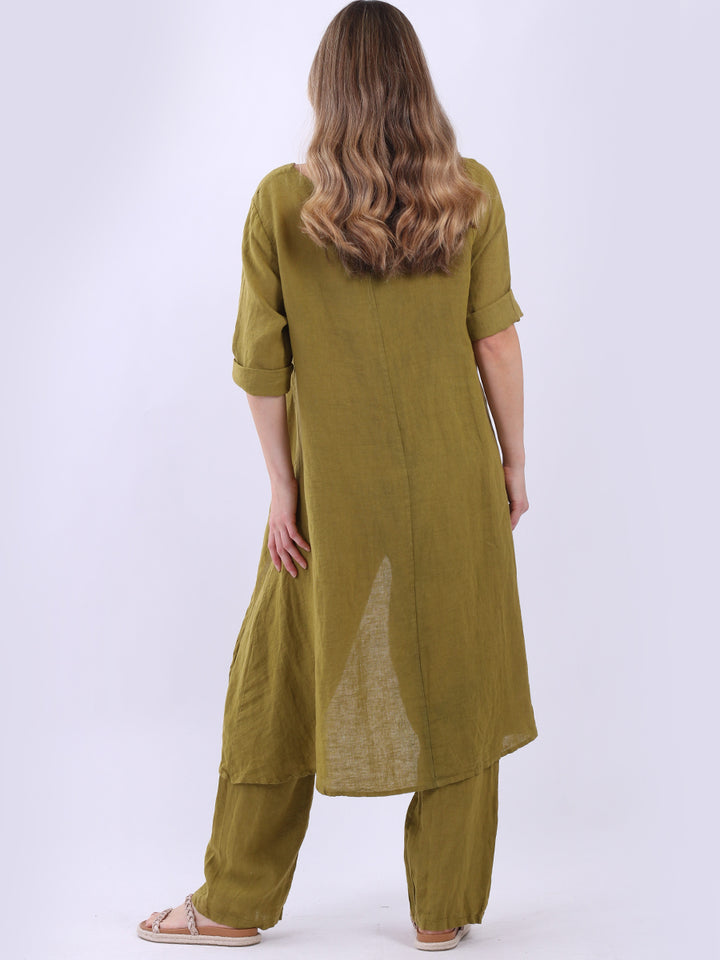Red Wholesale fashion boutique presents this solid linen lagenlook dress which is going to become women's favourite wardrobe piece offering a perfect blend of style and comfort featuring front decorative buttons, notch neck, rolled-up sleeves and hi-low hem making it a standalone piece. Made in Italy this dress can go perfectly with a matching wide-leg trouser and block heels.