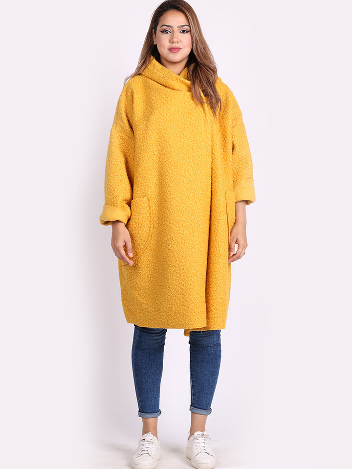 Adding a final layer to an out-and-about look is made easy for women wearers with this fashion boutique London Italian made jacket. The jacket fancies a cowl neckline, front double breasted enclosure, long rolled up sleeves and functional front pockets. This lagenlook woolen jacket can be worn over jeans and a tee of dress.
