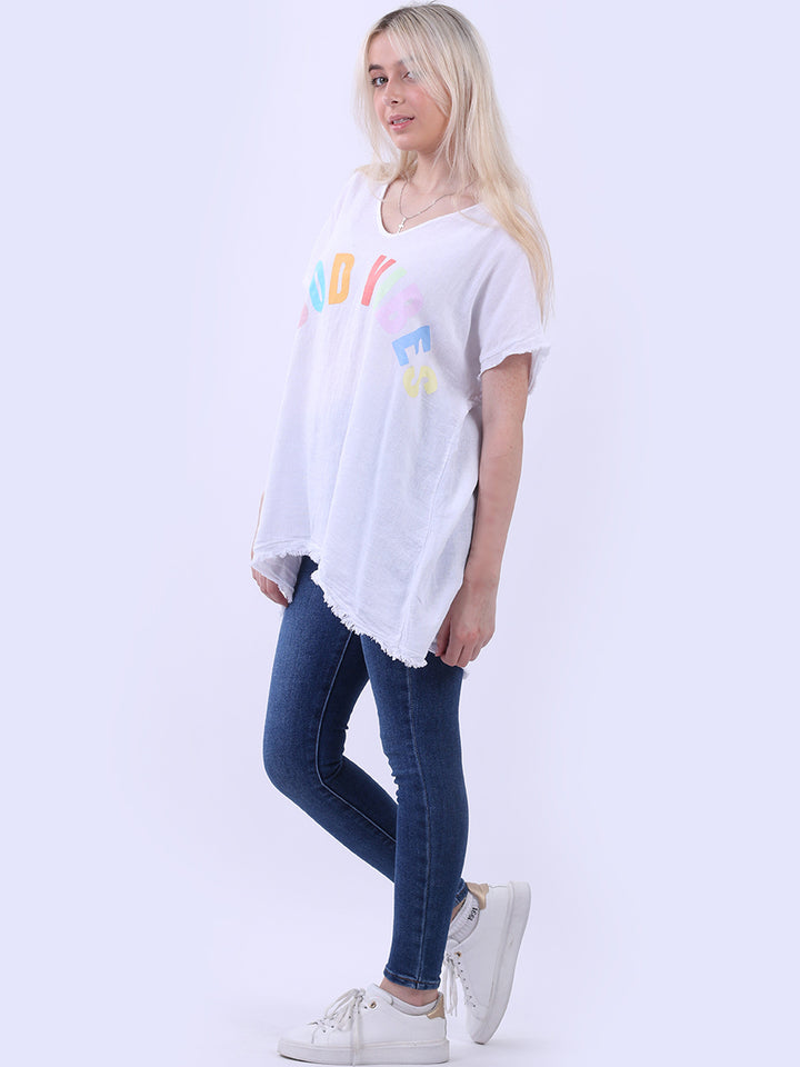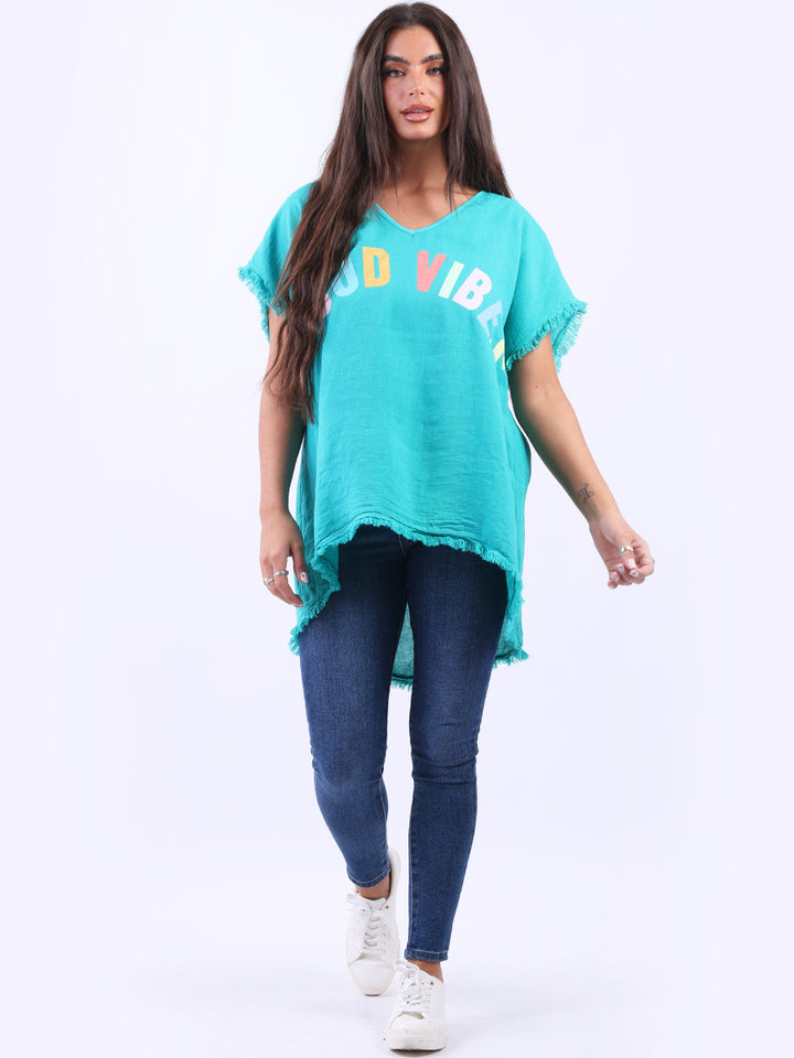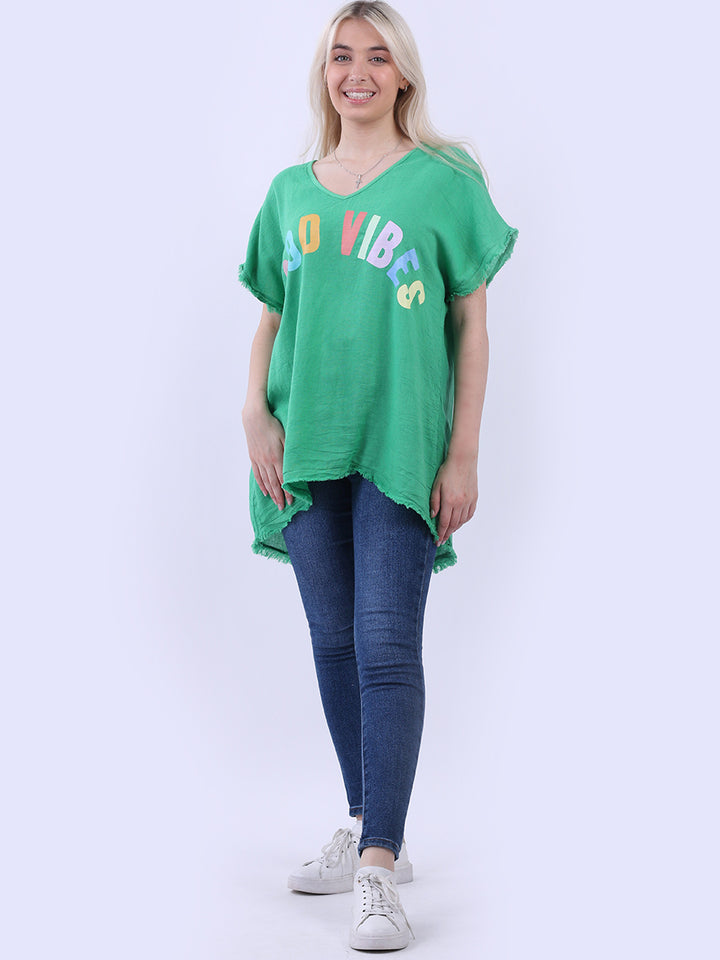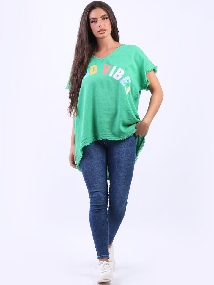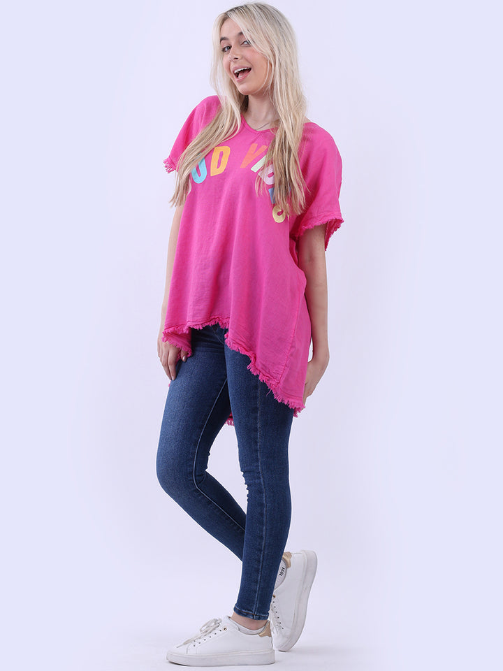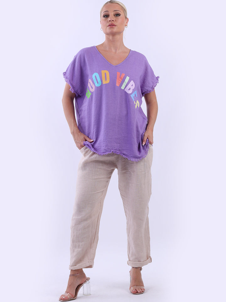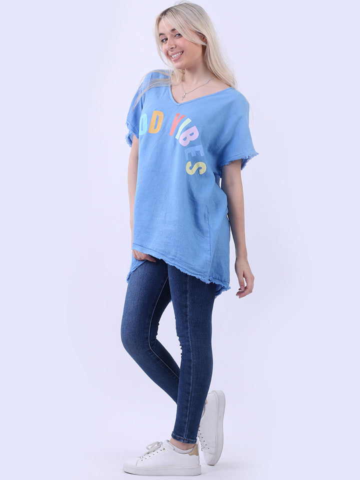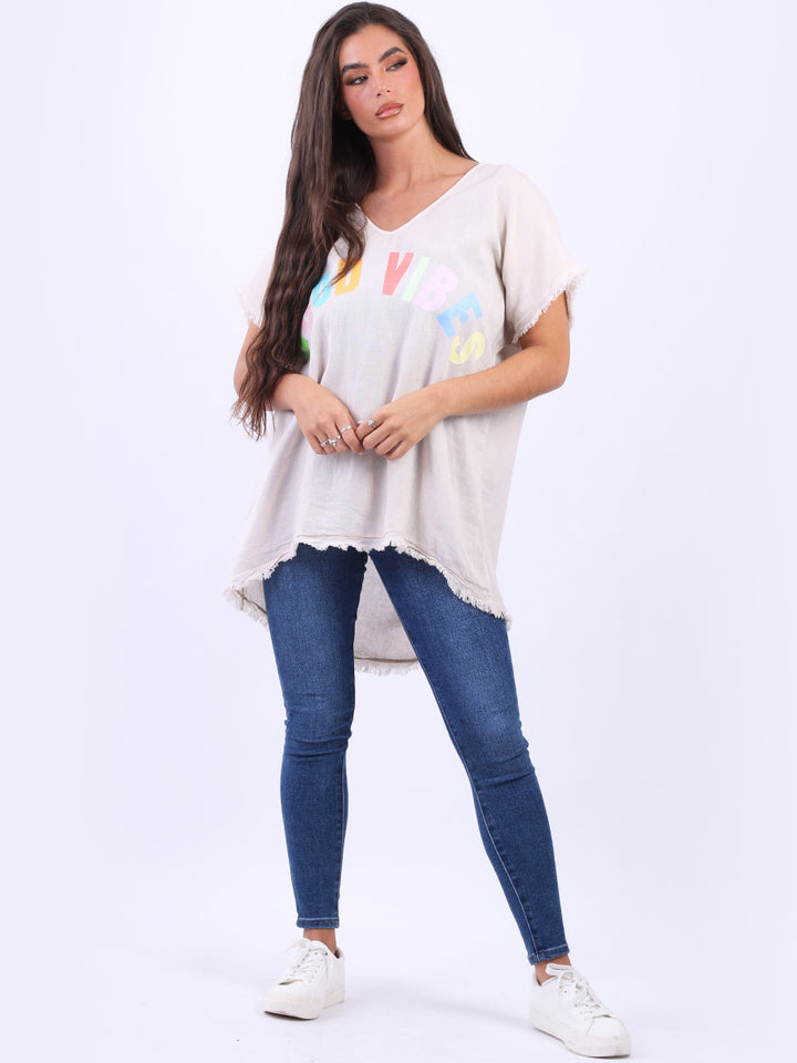 Ideal for summer with all the coolness of soft linen and features of smart finish. Made in Italy with plunging V-neckline, baggy plus size fit and rainbow colored “good vibes” slogan on the front to make the final finish trendy and terrific.