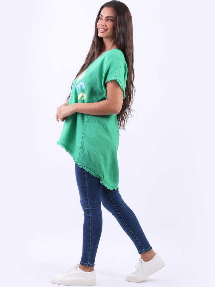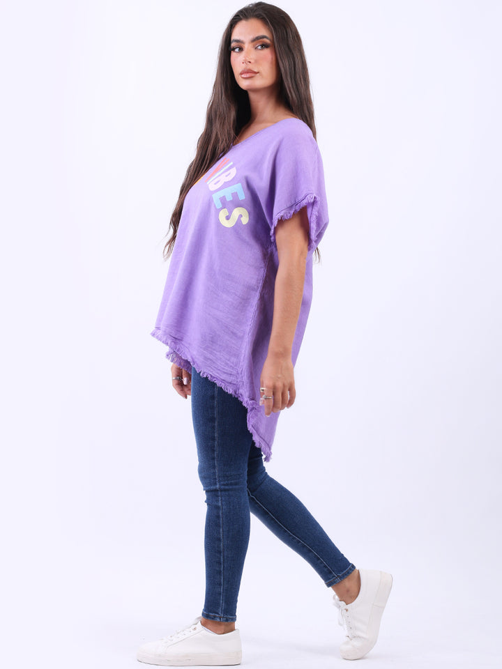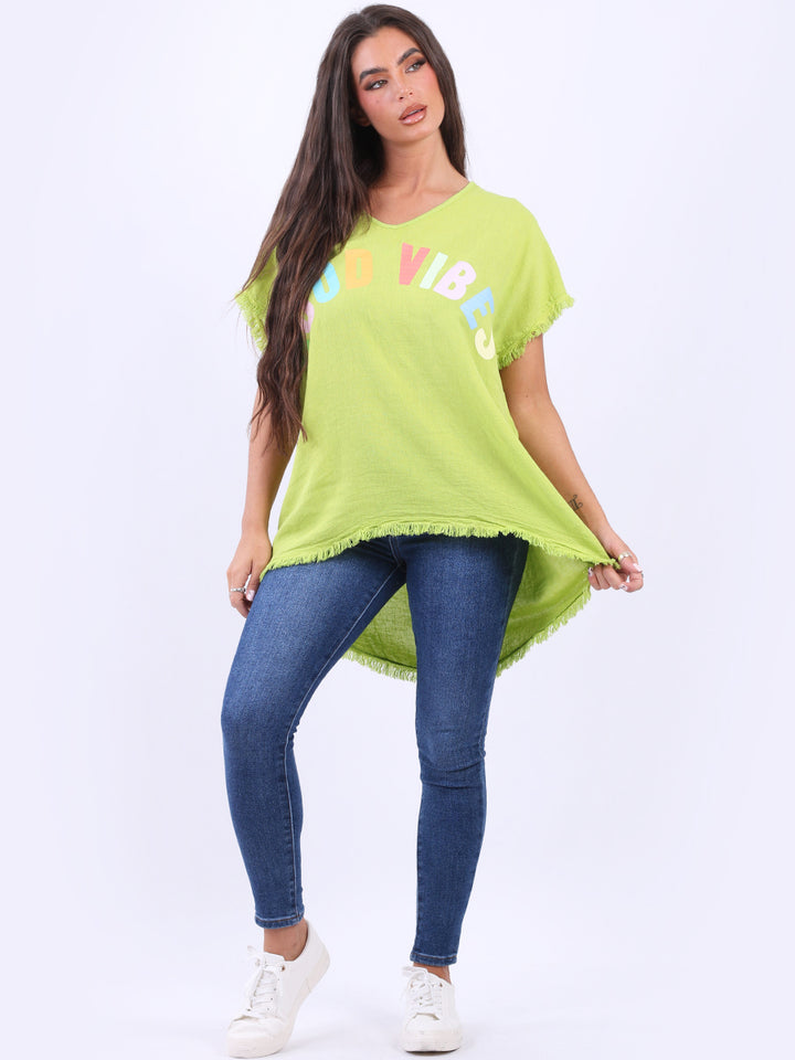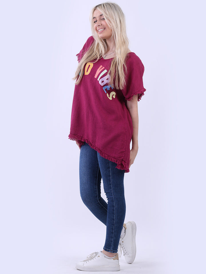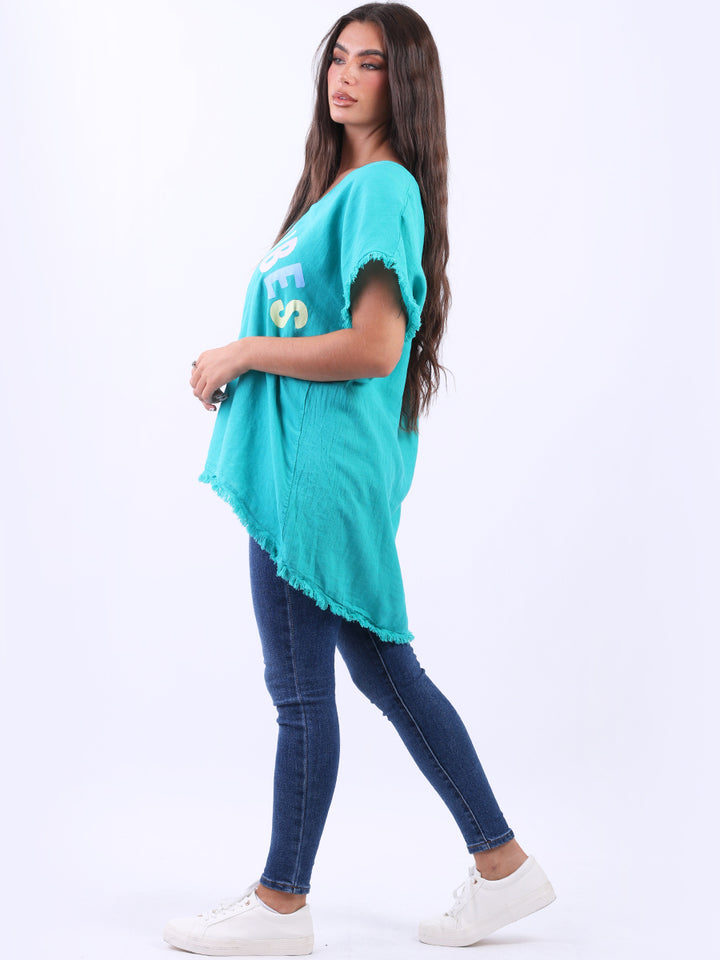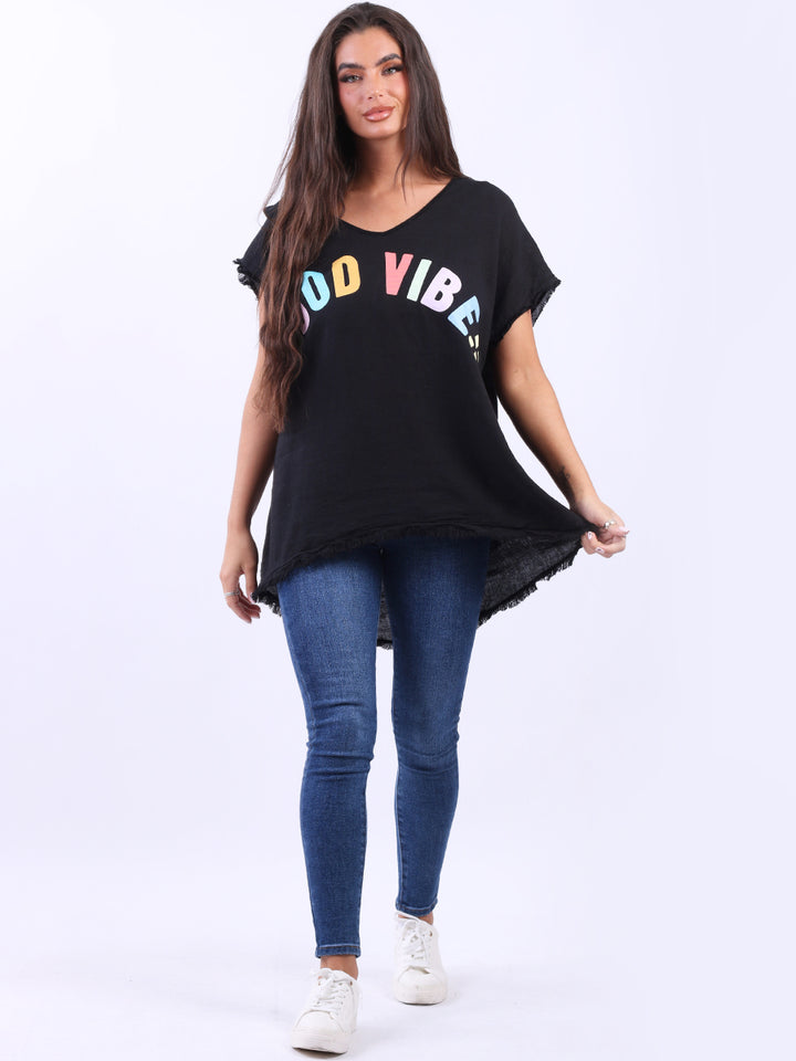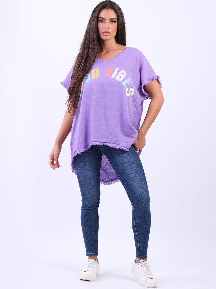 Ideal for summer with all the coolness of soft linen and features of smart finish. Made in Italy with plunging V-neckline, baggy plus size fit and rainbow colored “good vibes” slogan on the front to make the final finish trendy and terrific.