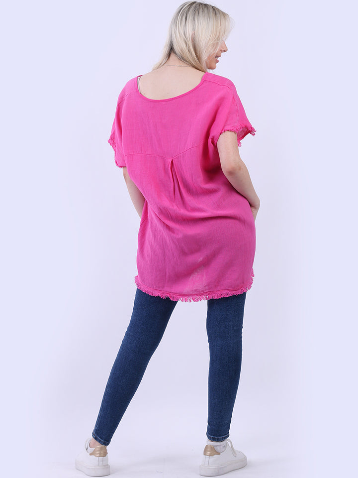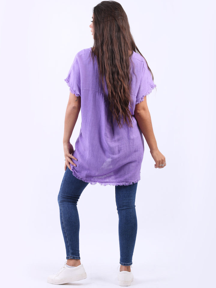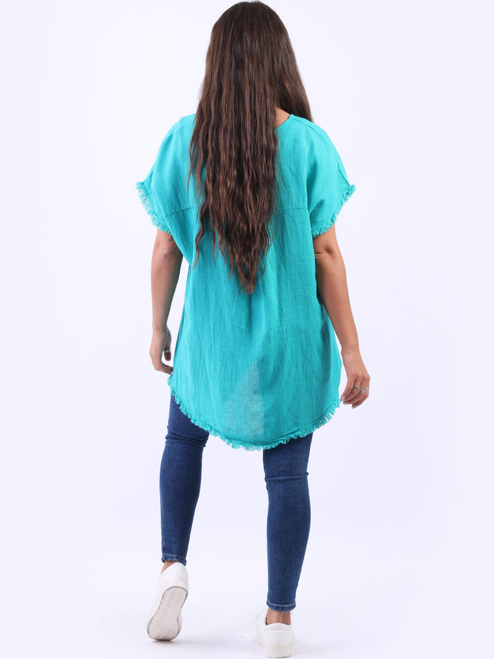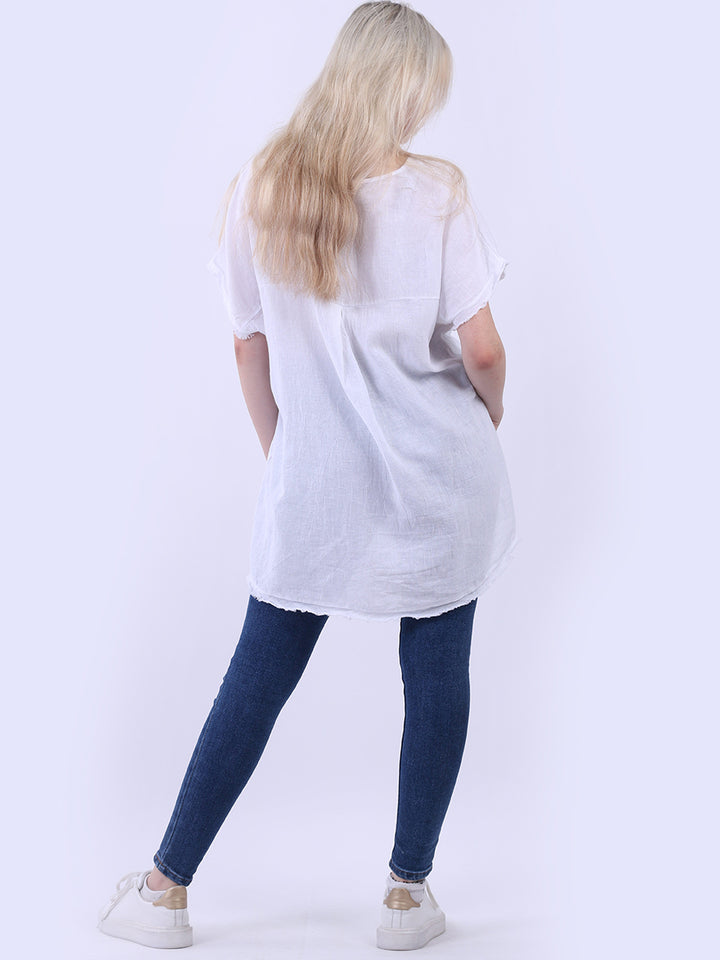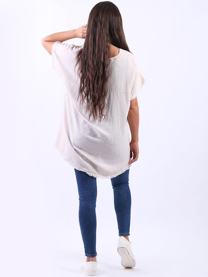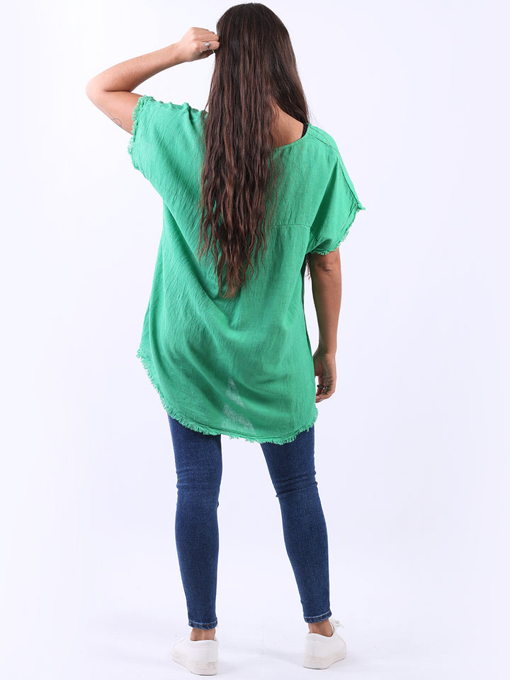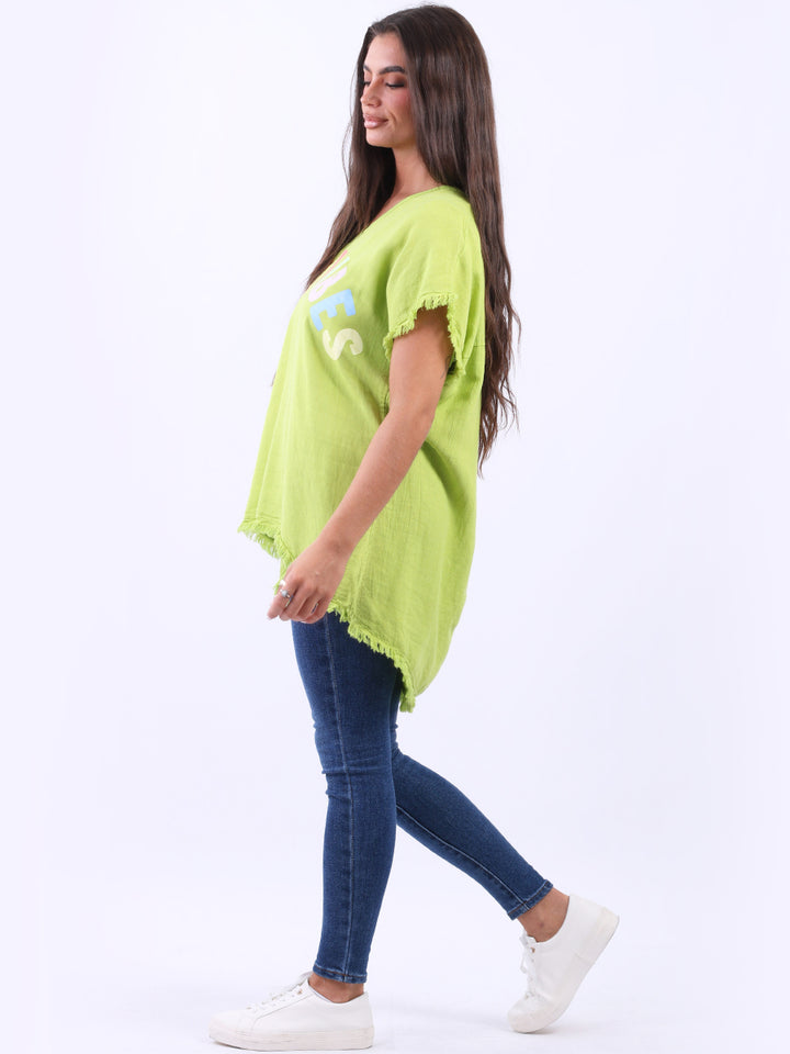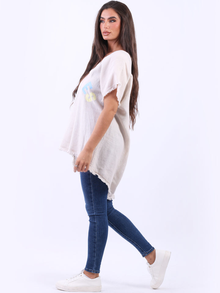 Ideal for summer with all the coolness of soft linen and features of smart finish. Made in Italy with plunging V-neckline, baggy plus size fit and rainbow colored “good vibes” slogan on the front to make the final finish trendy and terrific.