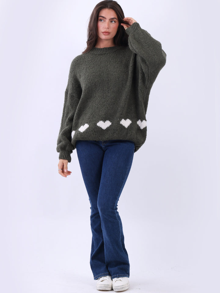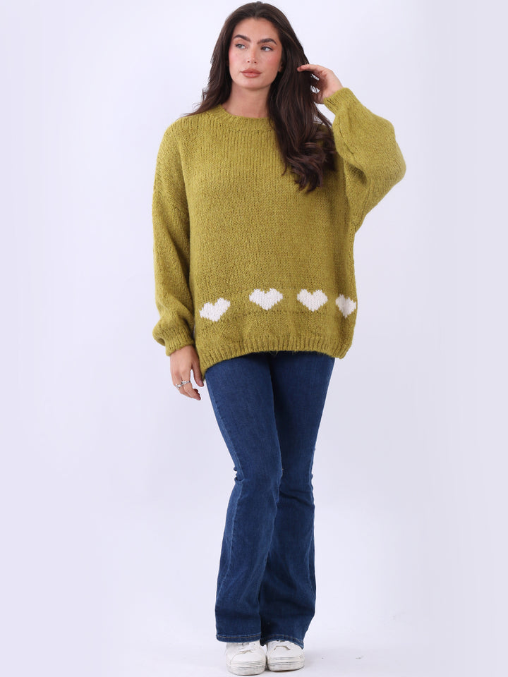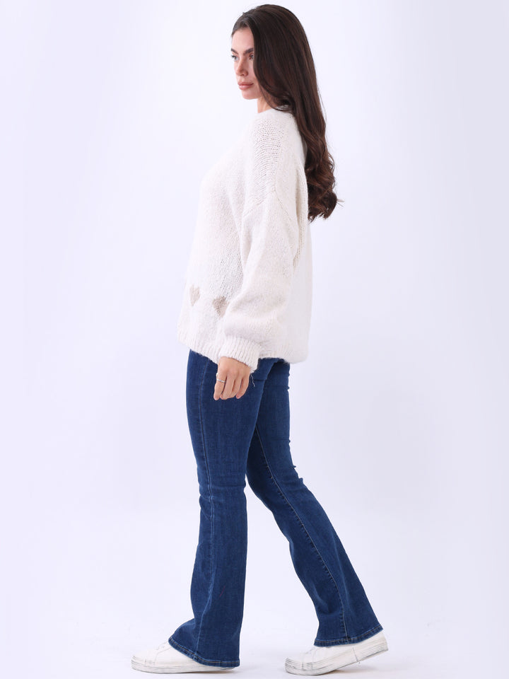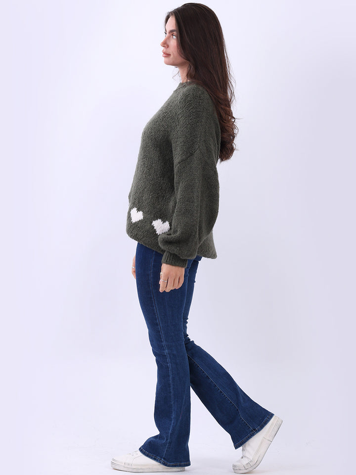 To elevate the ladies' winter fashion collection, this wool jumper with beautiful hearts knitted on hem is a showstopper. Exuding elegance and grace, it features a delicate design with the crew neck, drop shoulders and baggy sleeves. Perfect for days when women wearers want to feel cozy yet stylish.