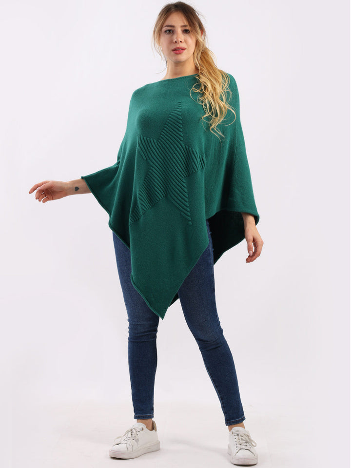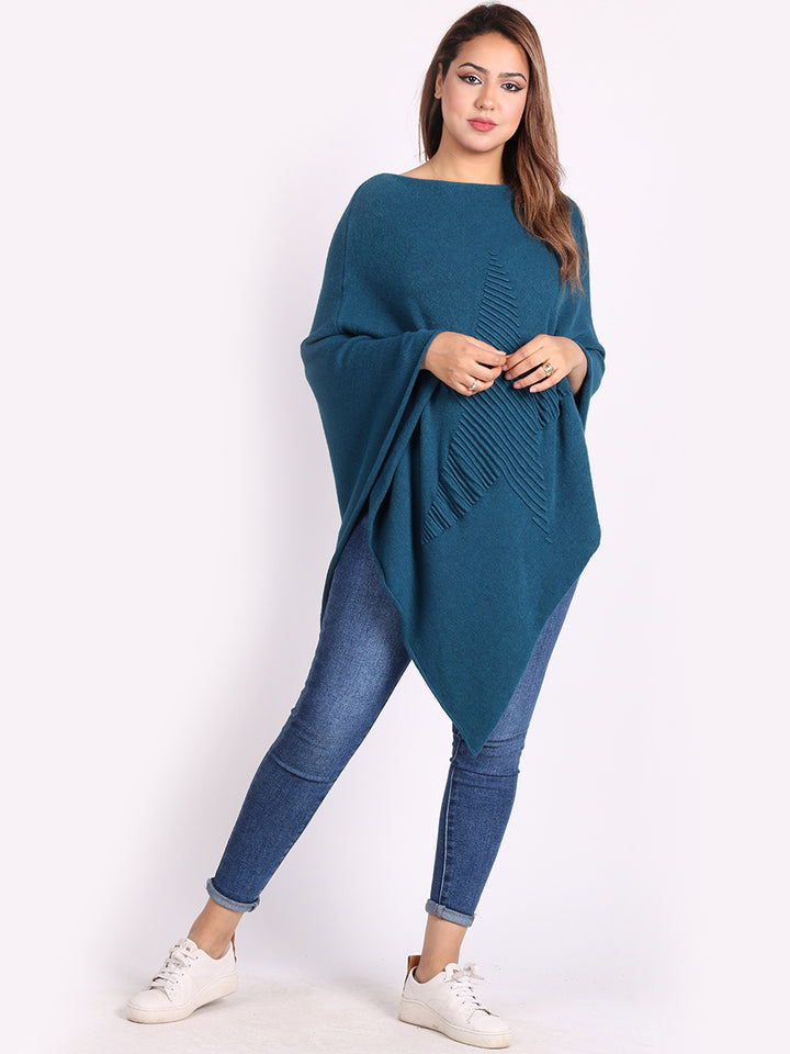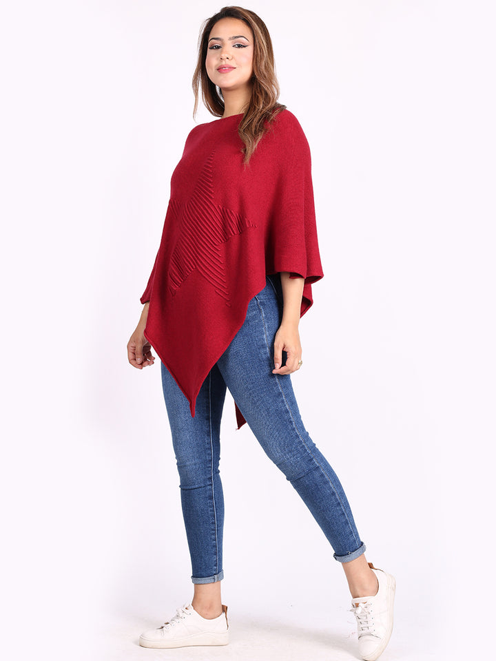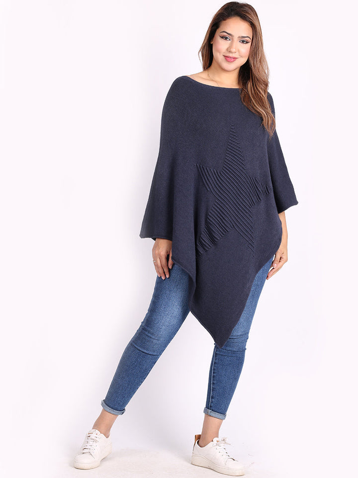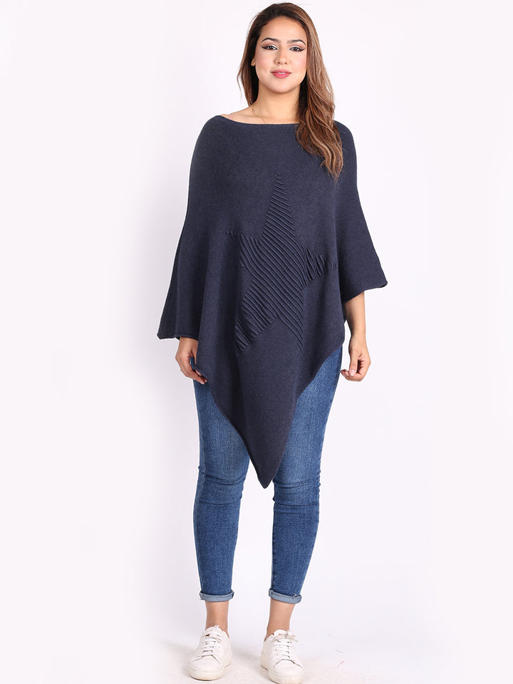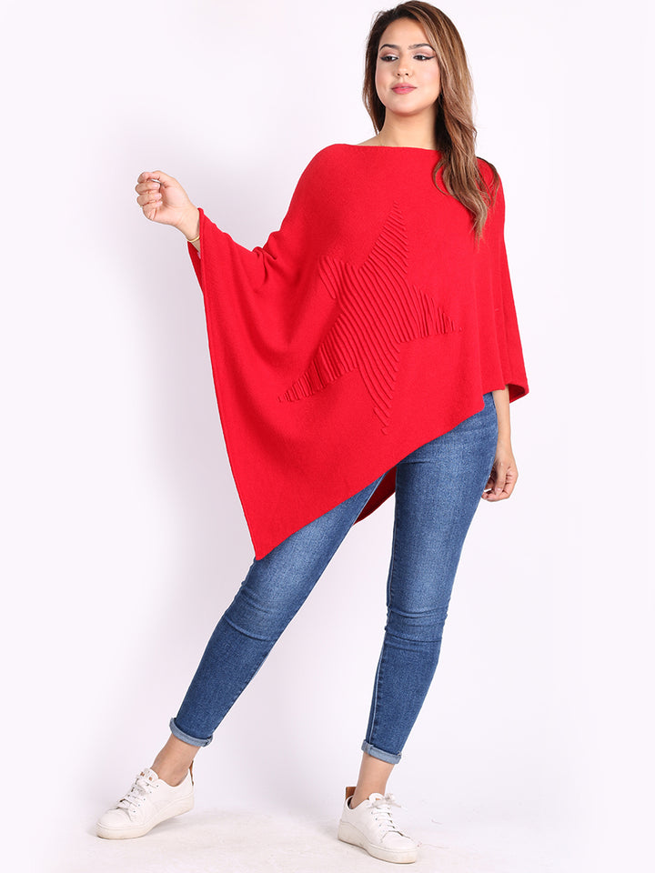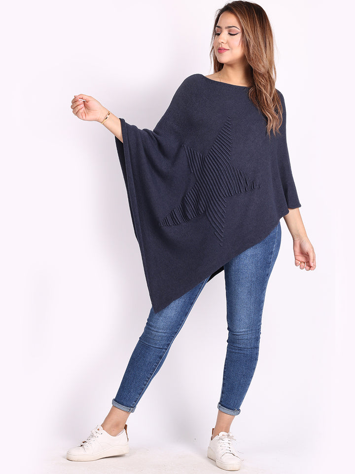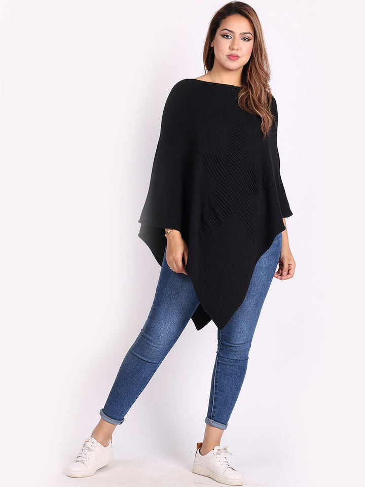 Star of the show worthy wardrobe pick! An Italian made poncho to keep heart, body and style haute by fashion boutique London is just perfect seasonal shifts and mood swings. Featuring an embossed style mega star with diagonal lines giving more character to the emblem, super comfy boat neck for pull on style and asymmetric hem to give every step lasting modish stride elegance this is a must have. Team it up with acid dyed jeans and cross body bag for adventurous look.