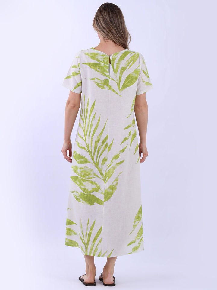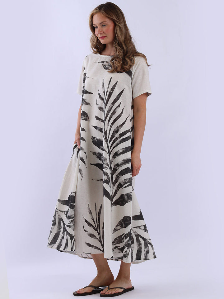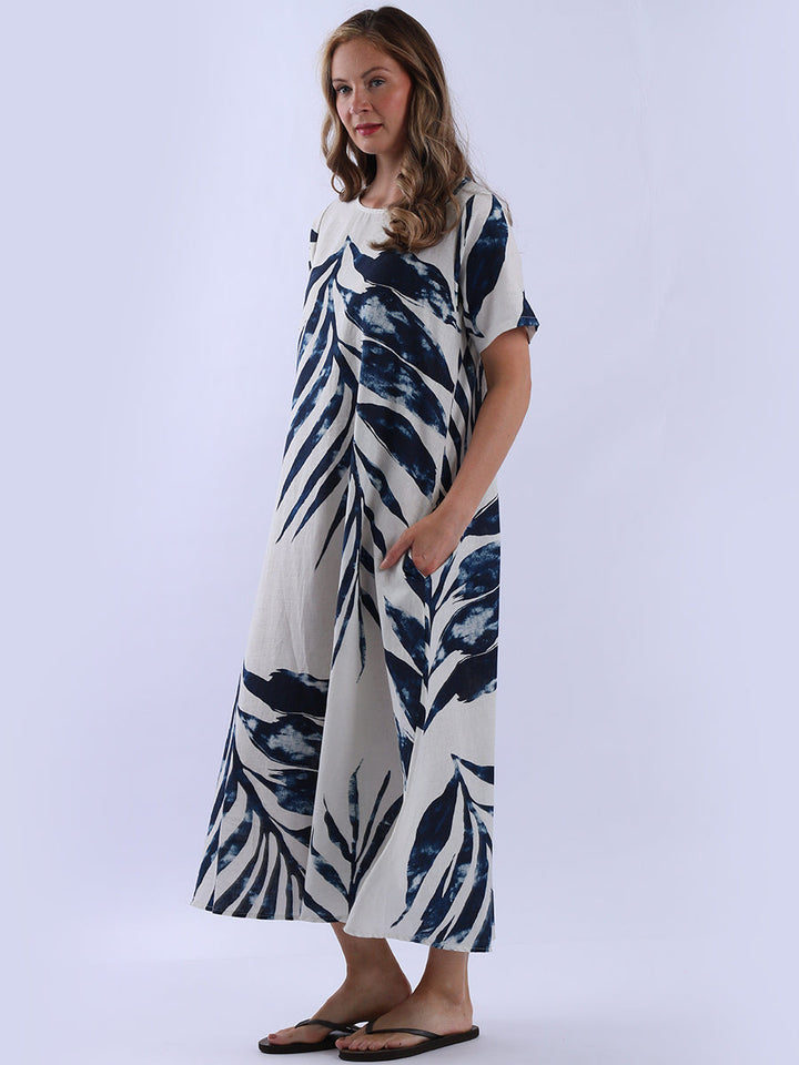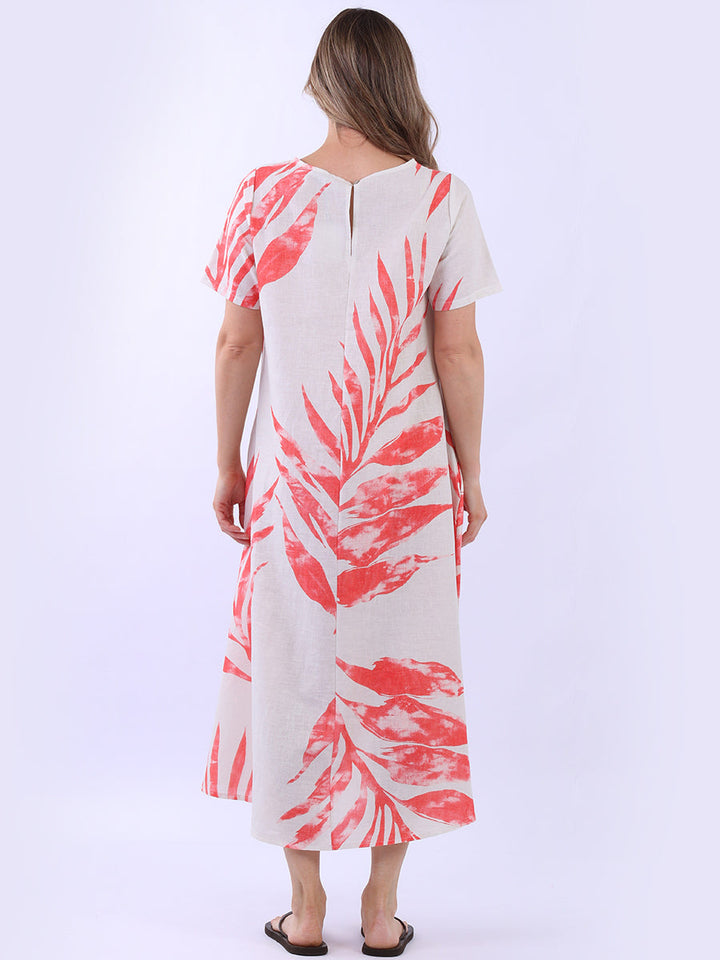 Part of the Redwholesale Summer Collection, this Italian-made midi dress is tailored from a soft linen and cotton blend, offering breathable comfort ideal for warmer days. Designed with a round neckline, short sleeves, and functional side pockets, it features a subtle palm leaf print that adds a touch of tropical charm. Its relaxed silhouette makes it a versatile and flattering choice for women wearers seeking effortless style with everyday ease