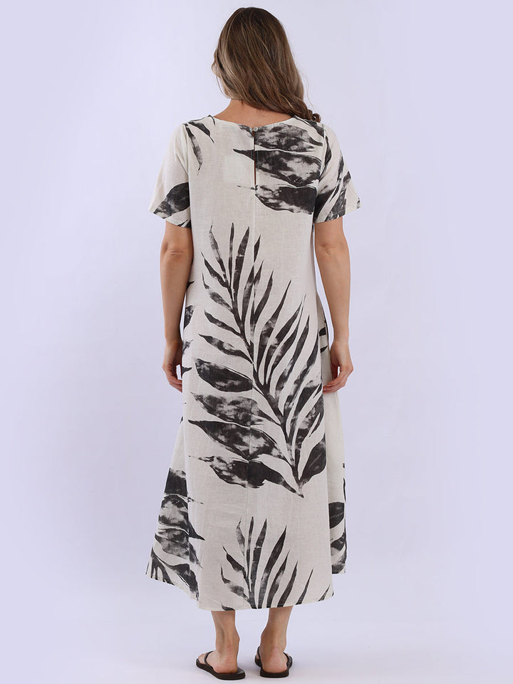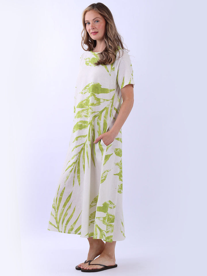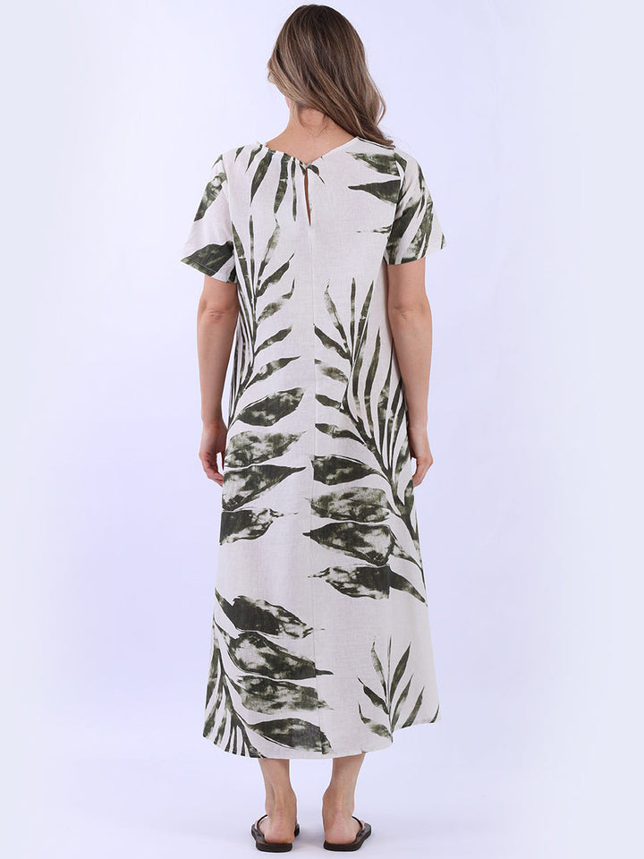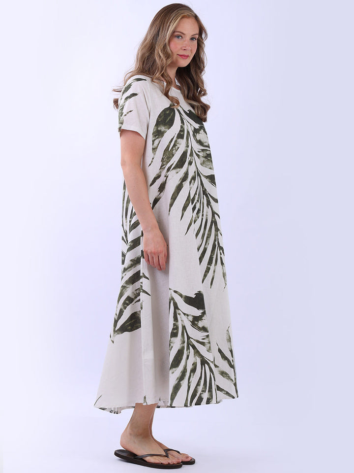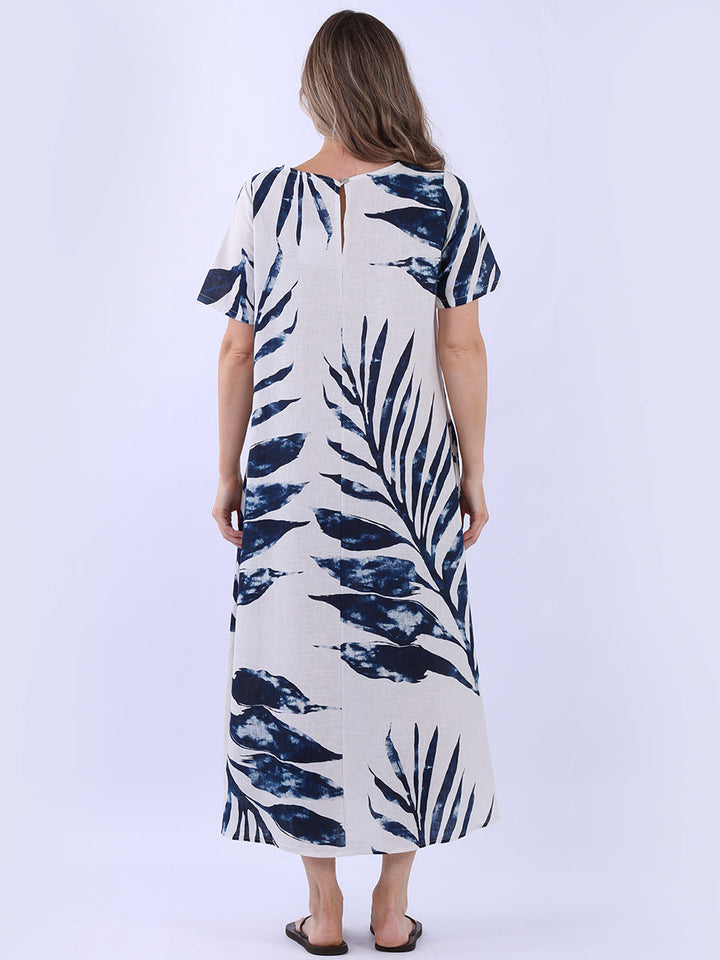 Part of the Redwholesale Summer Collection, this Italian-made midi dress is tailored from a soft linen and cotton blend, offering breathable comfort ideal for warmer days. Designed with a round neckline, short sleeves, and functional side pockets, it features a subtle palm leaf print that adds a touch of tropical charm. Its relaxed silhouette makes it a versatile and flattering choice for women wearers seeking effortless style with everyday ease
