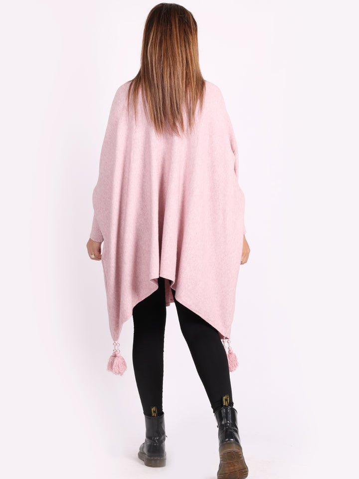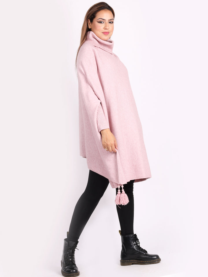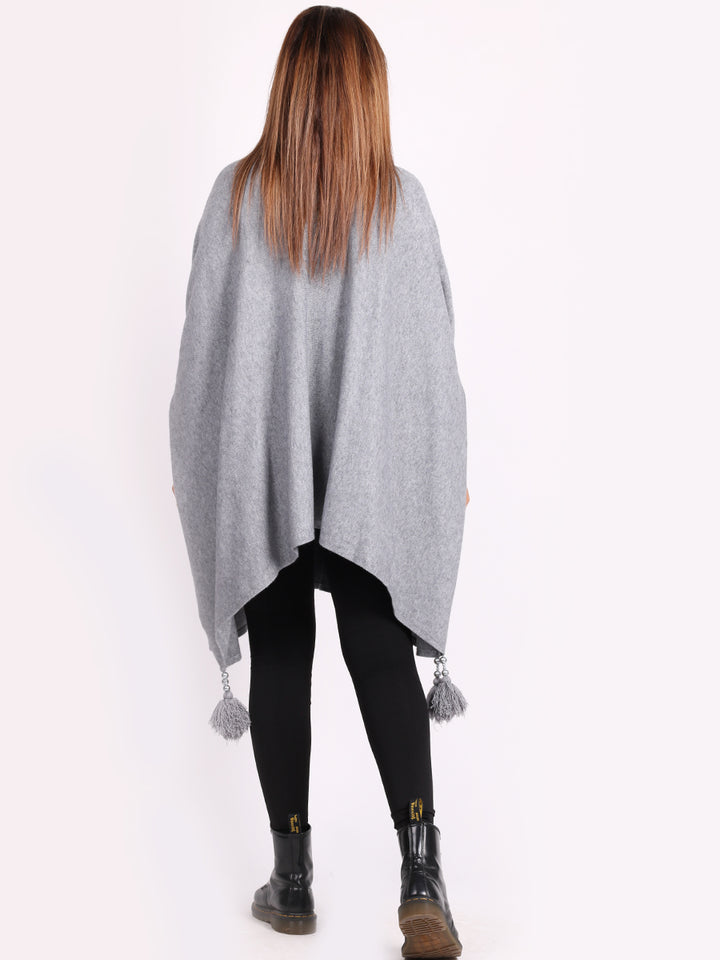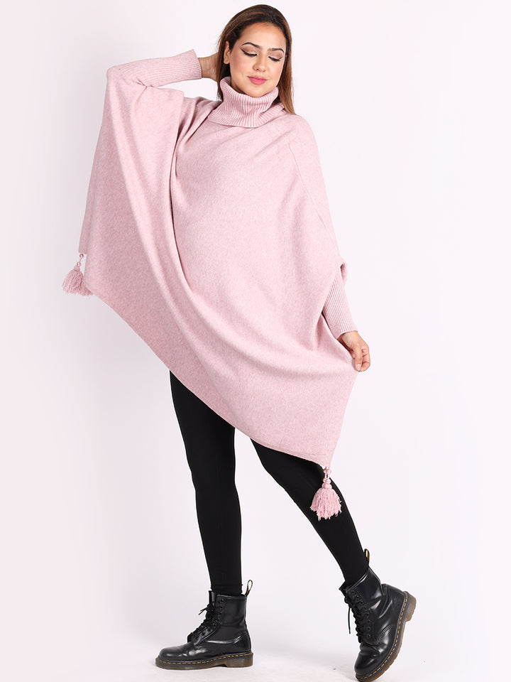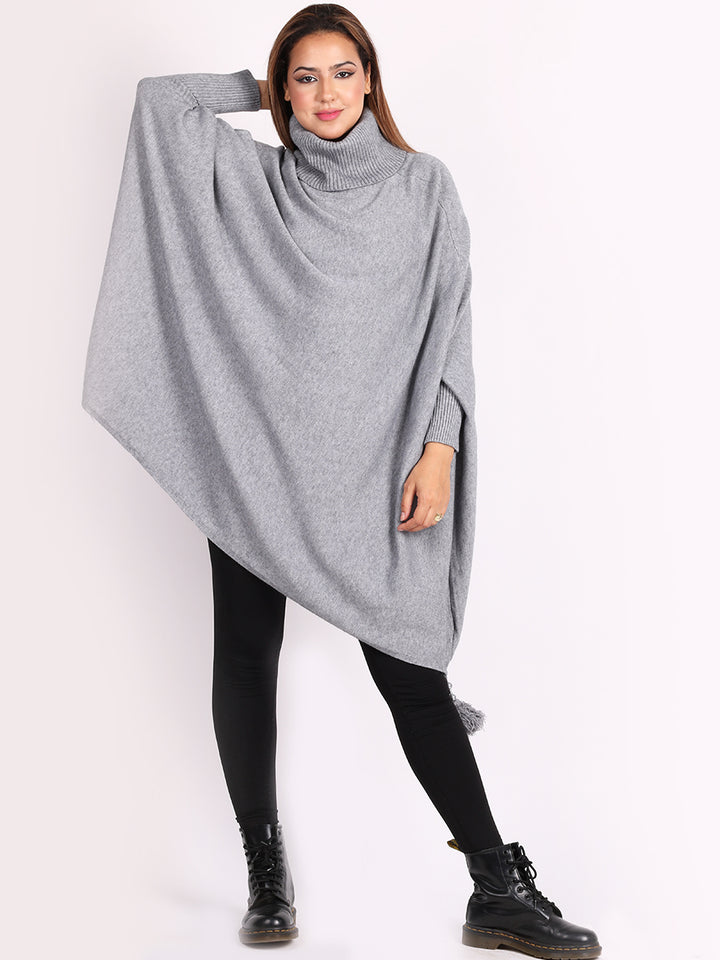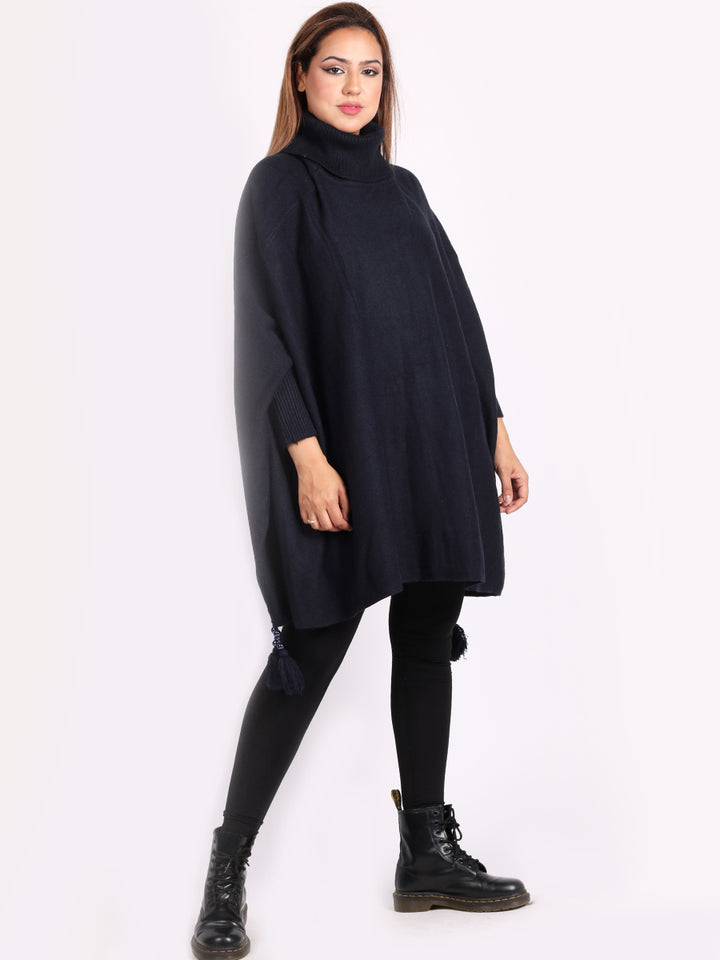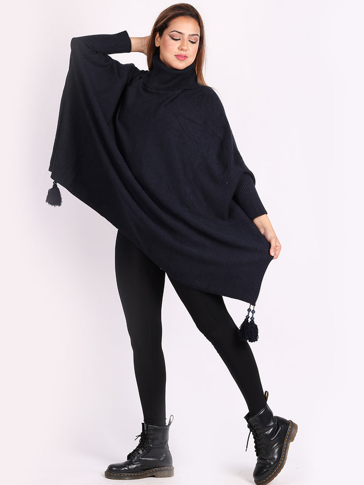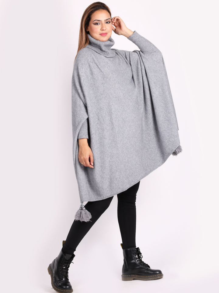 Italian Plain Cowl Neck Batwing Sleeves Tassels Tunic Poncho
