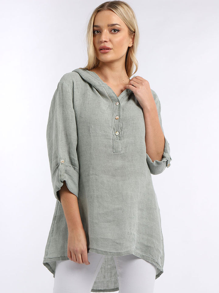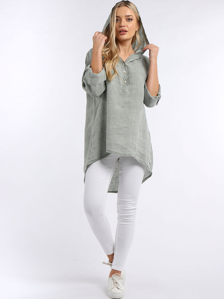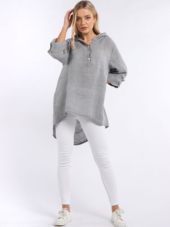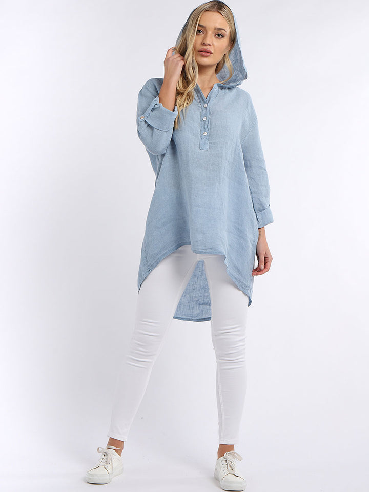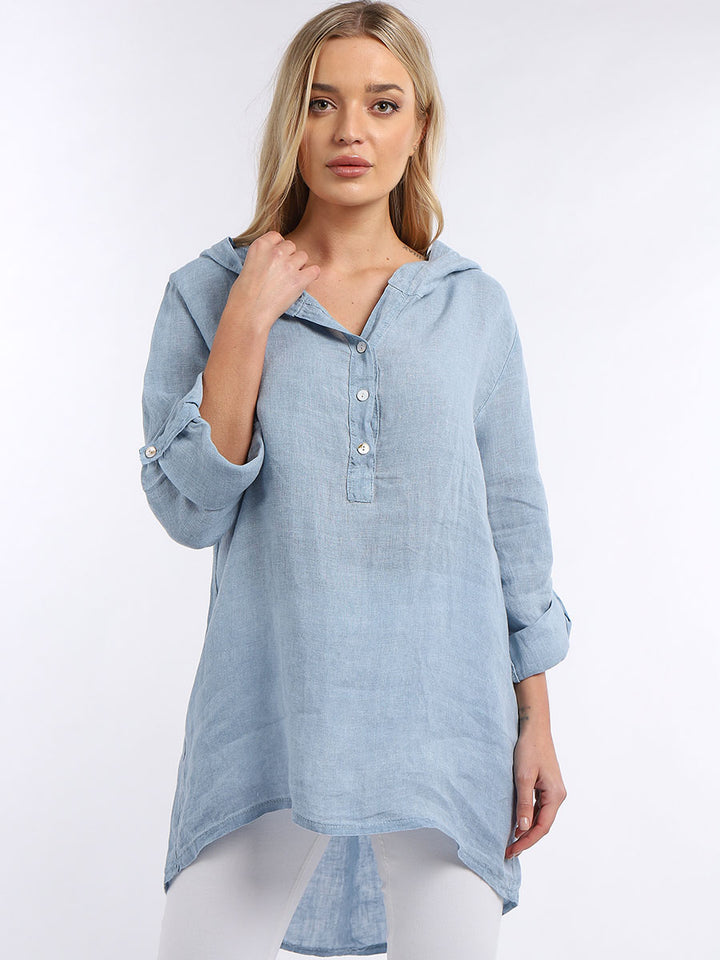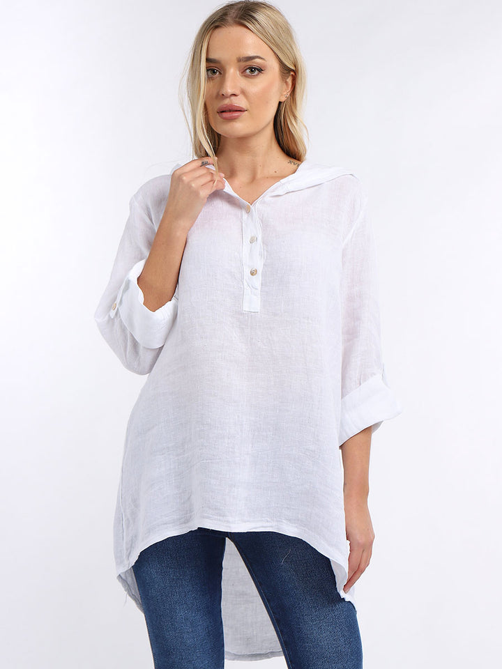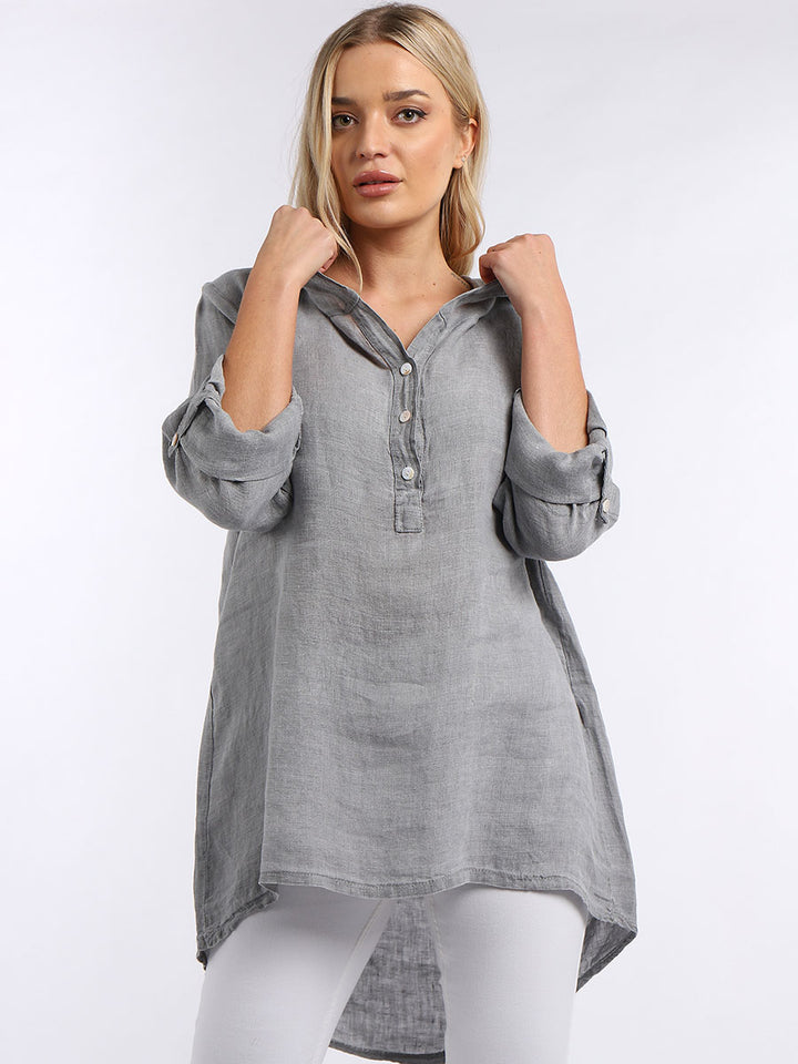 This is an Italian made exclusive Redwholesale casual off duty look perfect for women wearers with a touch of calm in their lives. This top features front buttons on a classic hoodie neck and hi lo hem with buttoned up long sleeves, in silk lookalike cool feeling linen. Add a funky polka dot scarf and denims to finish the look.