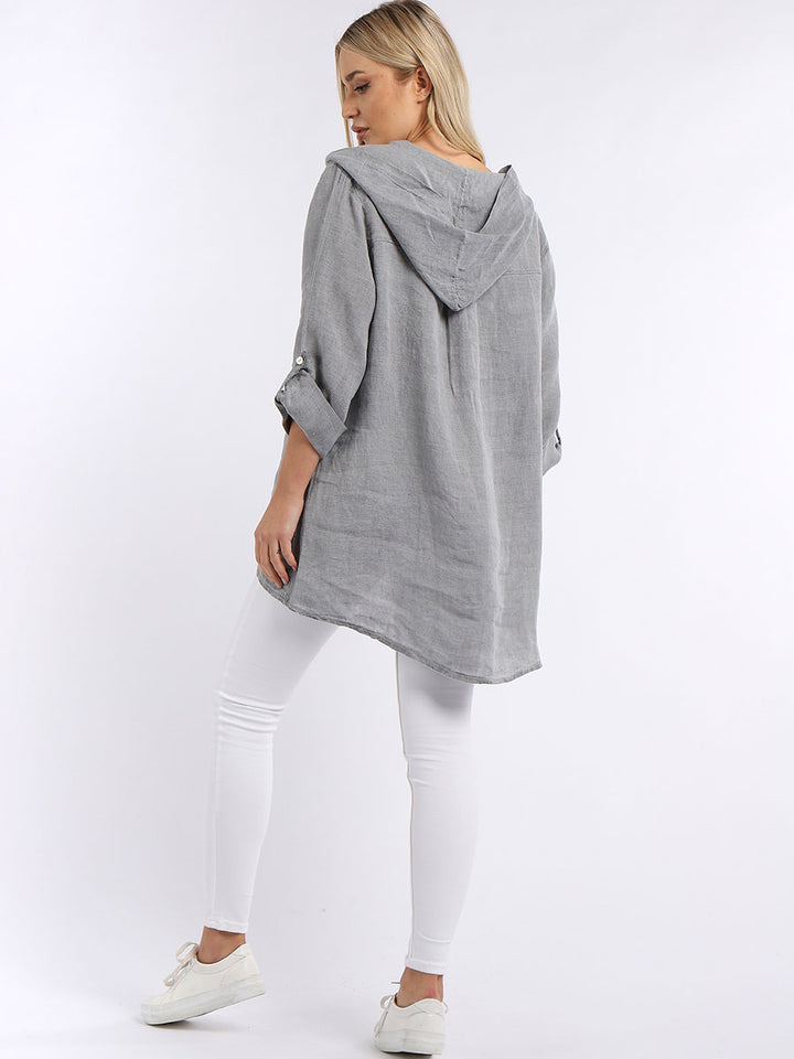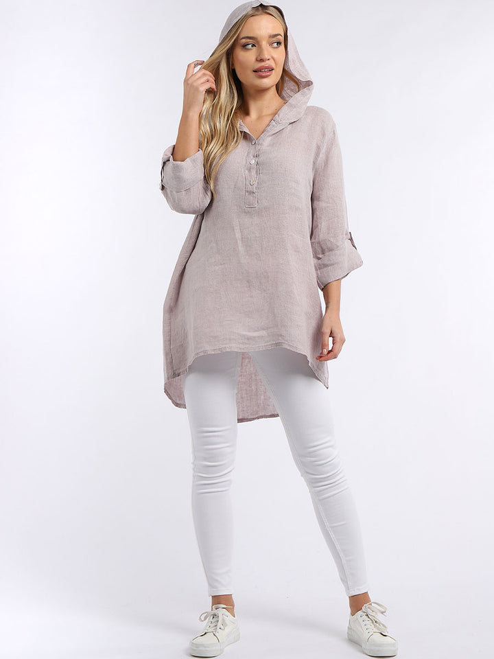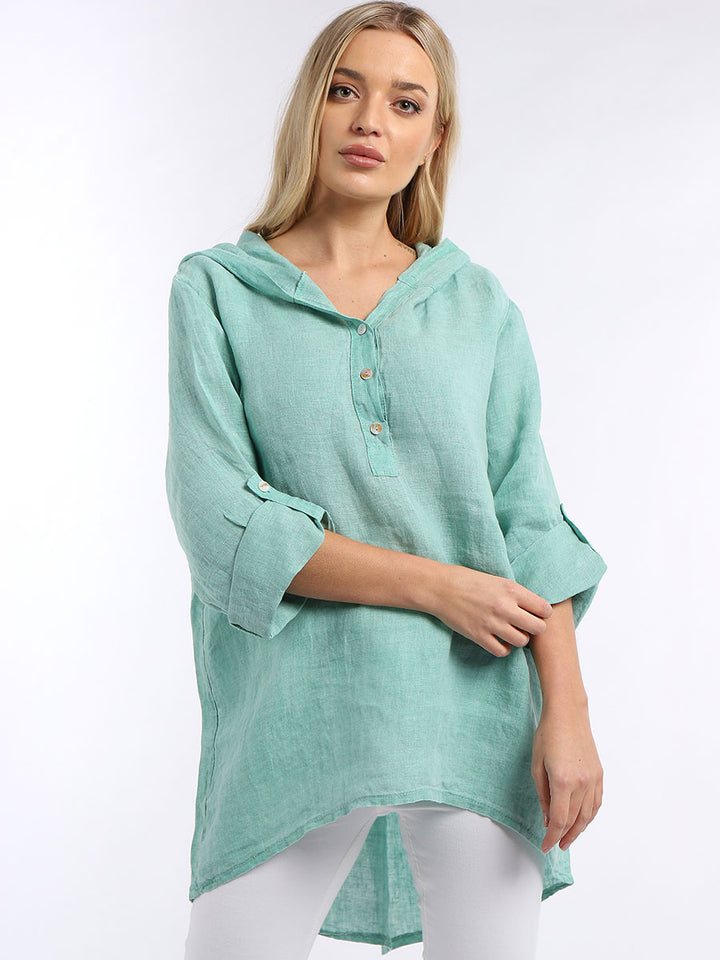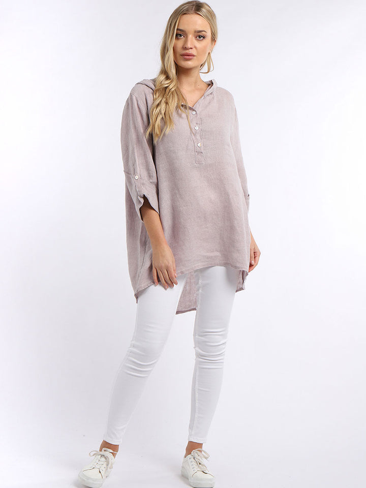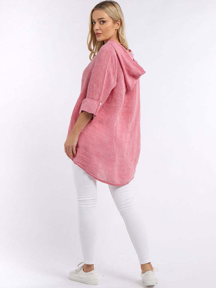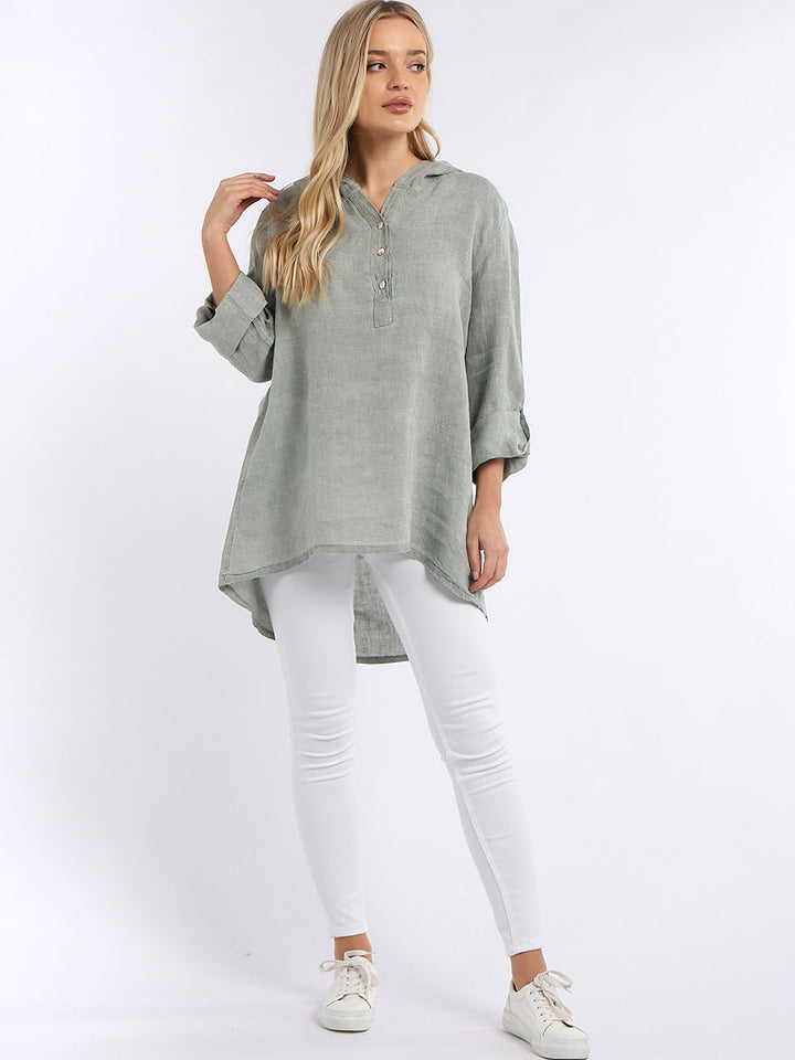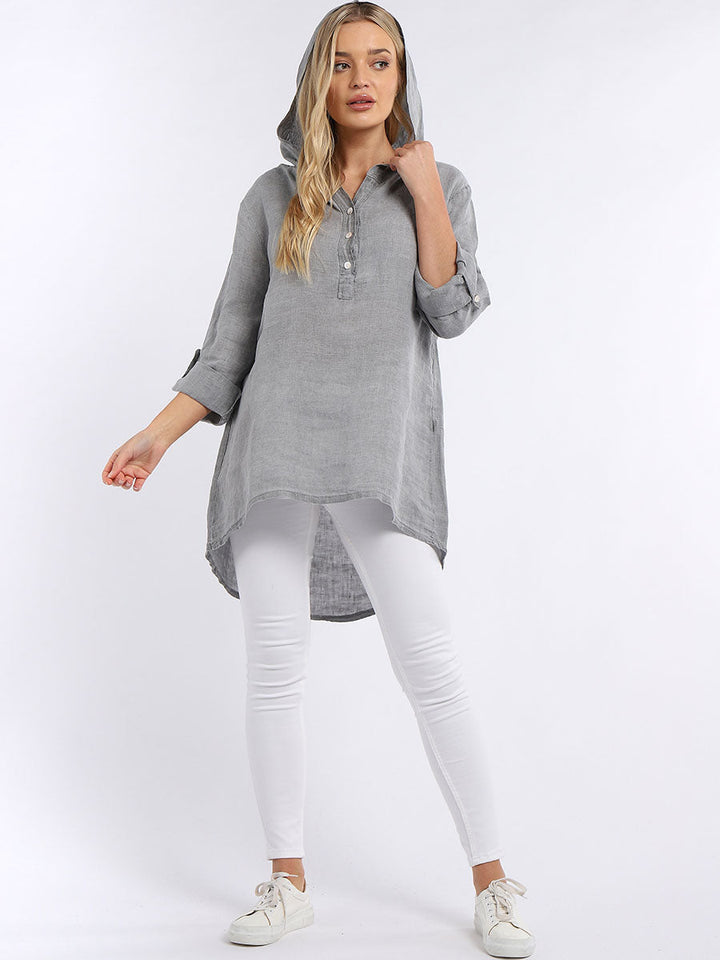 This is an Italian made exclusive Redwholesale casual off duty look perfect for women wearers with a touch of calm in their lives. This top features front buttons on a classic hoodie neck and hi lo hem with buttoned up long sleeves, in silk lookalike cool feeling linen. Add a funky polka dot scarf and denims to finish the look.