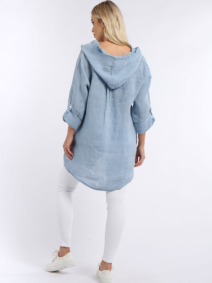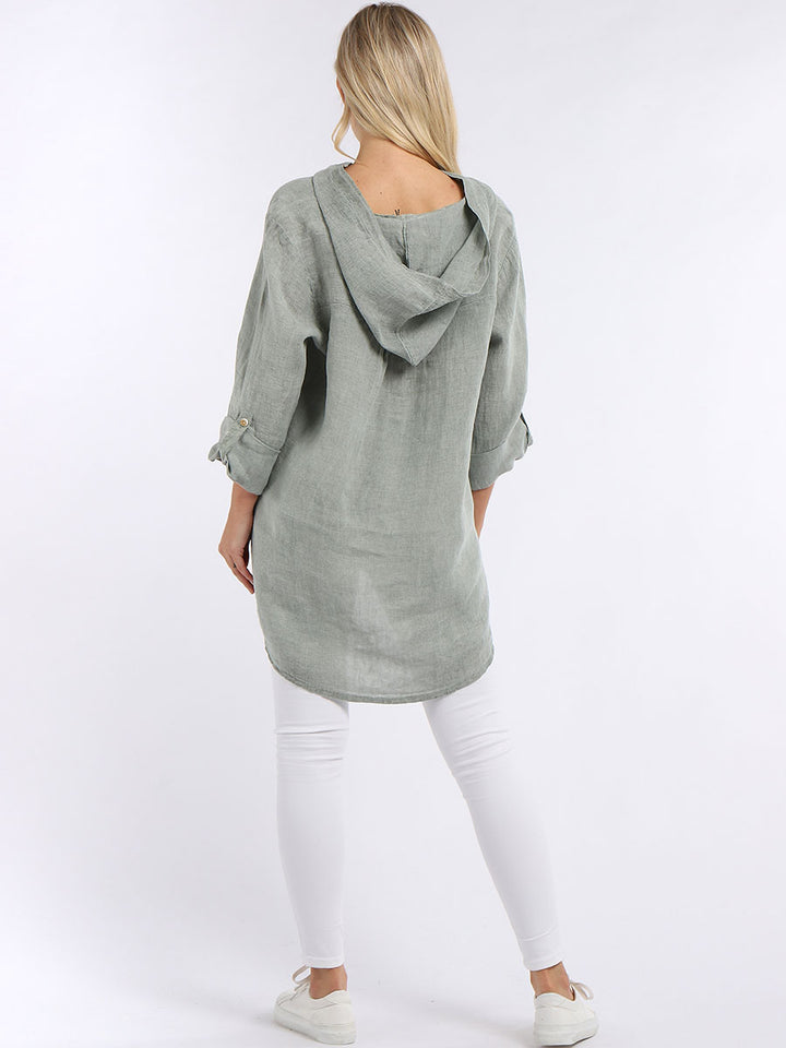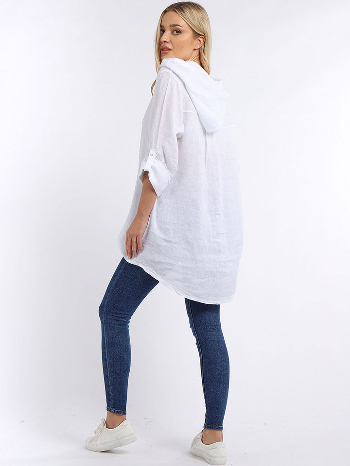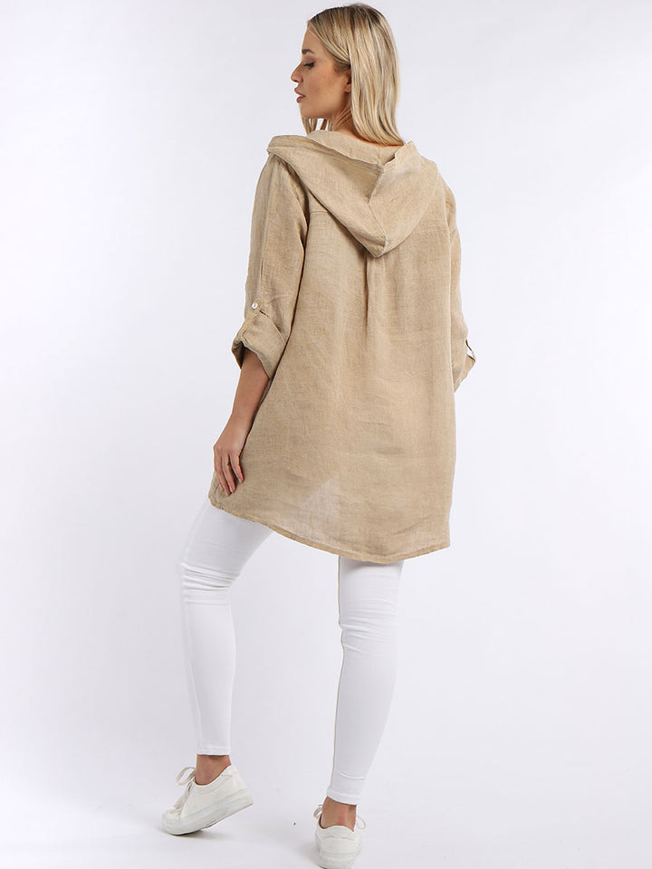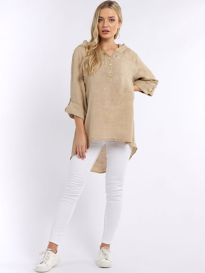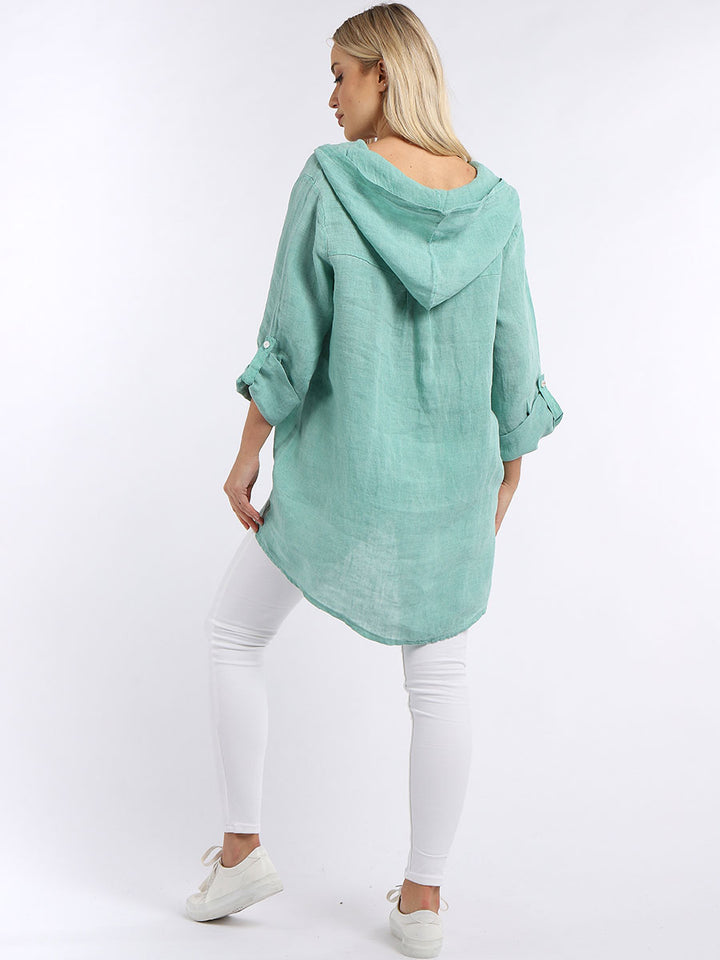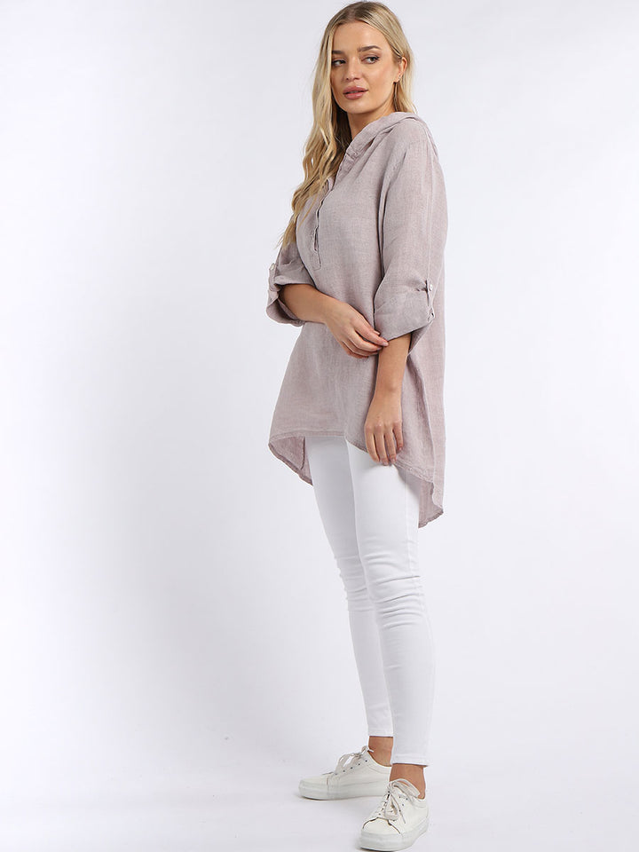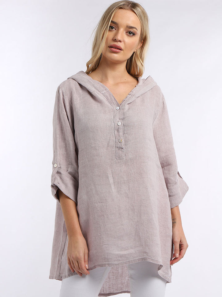 This is an Italian made exclusive Redwholesale casual off duty look perfect for women wearers with a touch of calm in their lives. This top features front buttons on a classic hoodie neck and hi lo hem with buttoned up long sleeves, in silk lookalike cool feeling linen. Add a funky polka dot scarf and denims to finish the look.