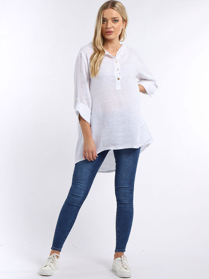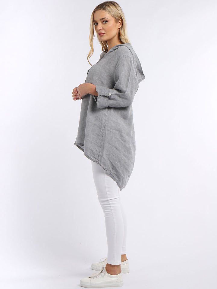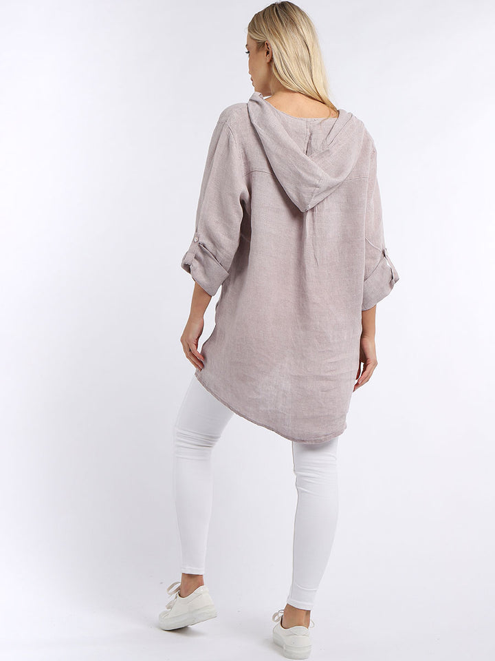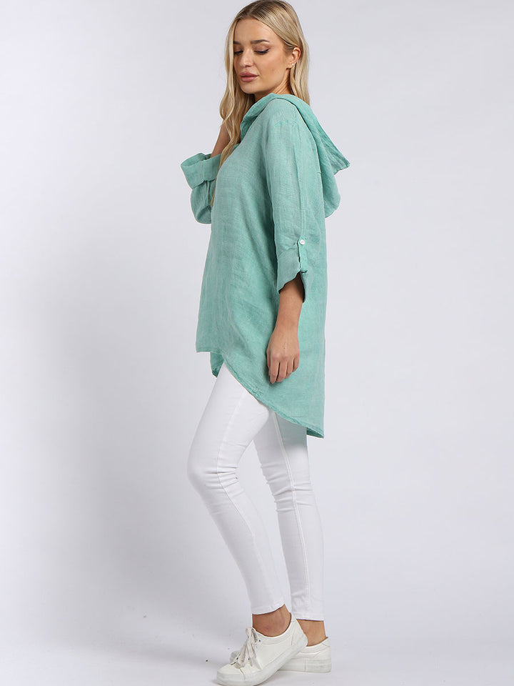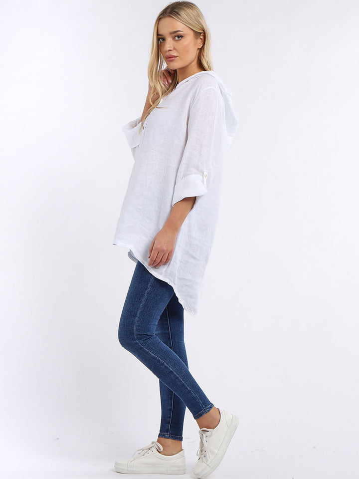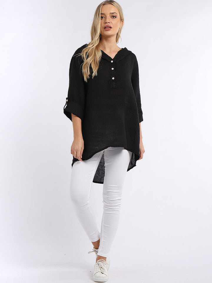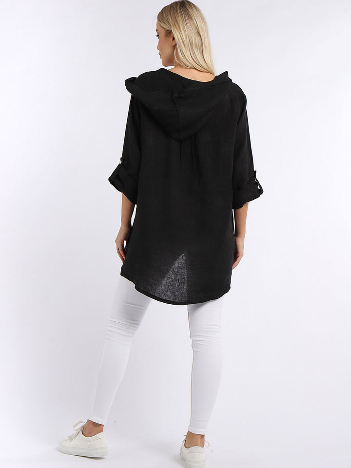 This is an Italian made exclusive Redwholesale casual off duty look perfect for women wearers with a touch of calm in their lives. This top features front buttons on a classic hoodie neck and hi lo hem with buttoned up long sleeves, in silk lookalike cool feeling linen. Add a funky polka dot scarf and denims to finish the look.