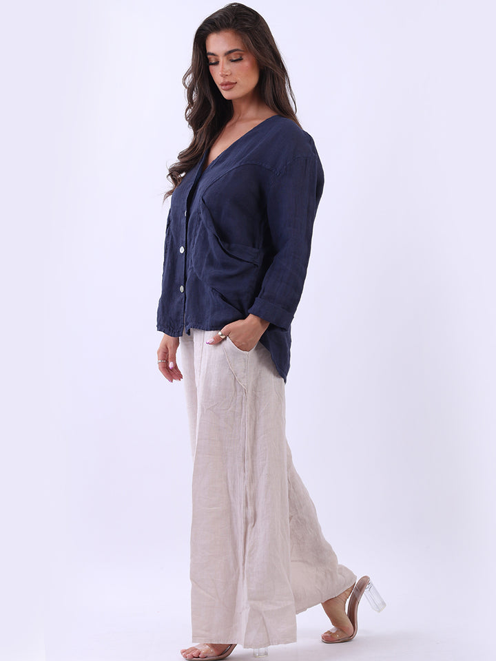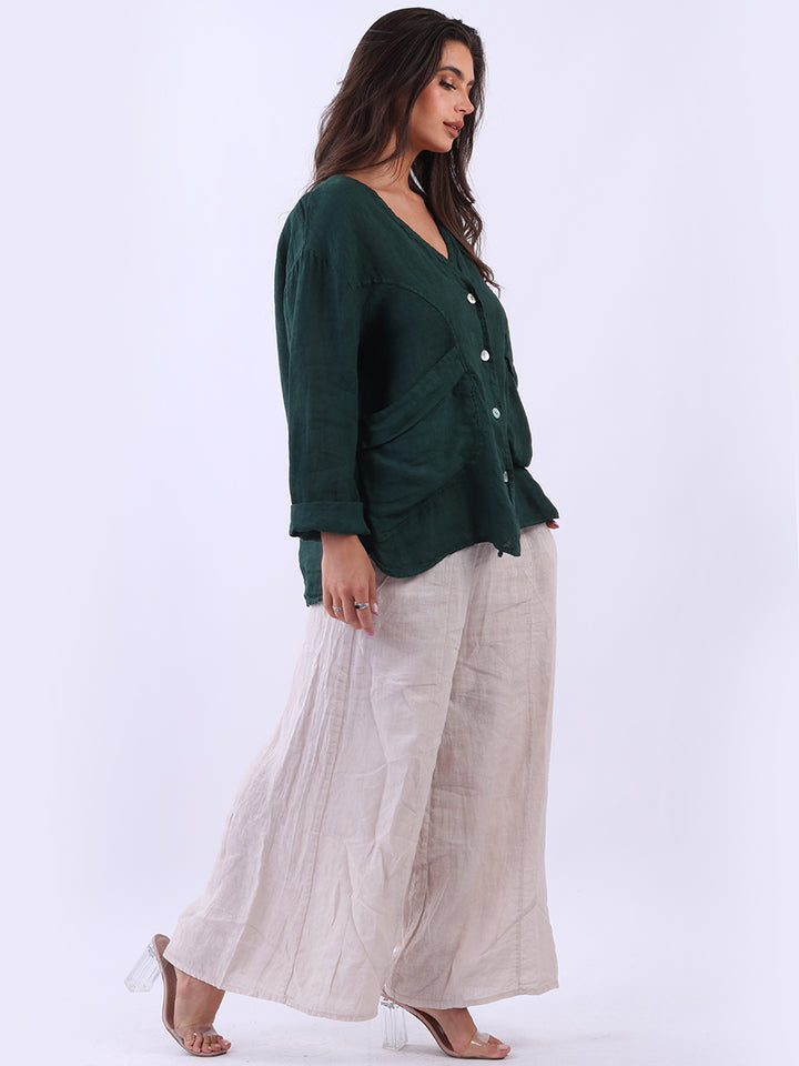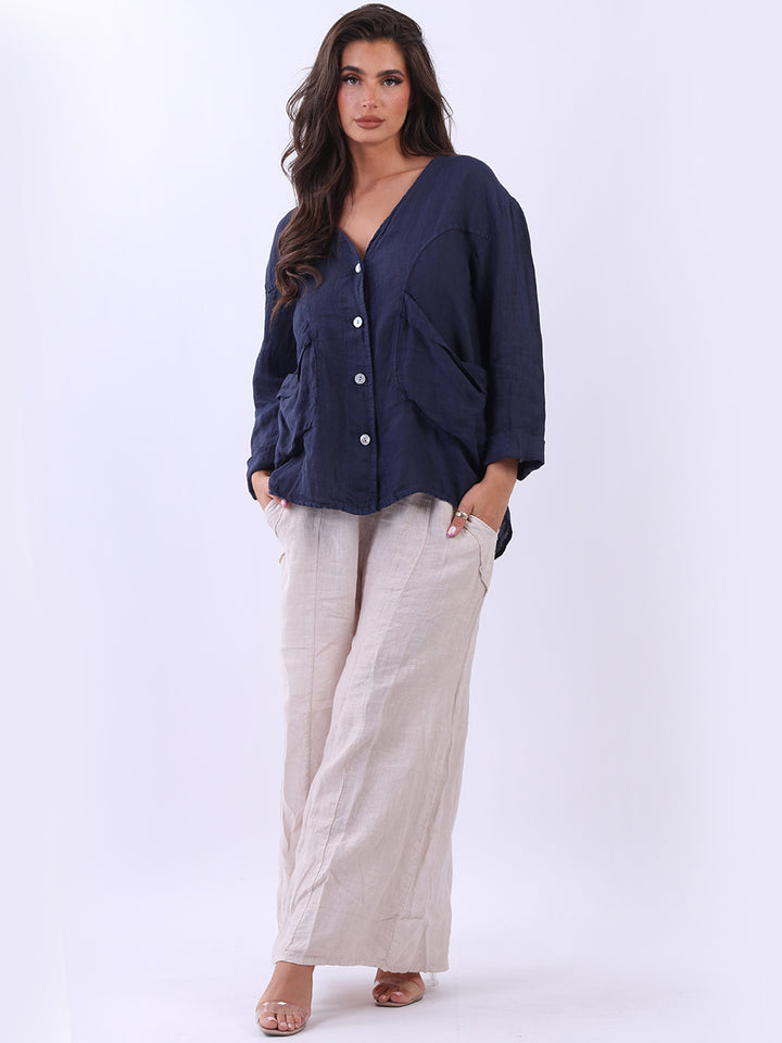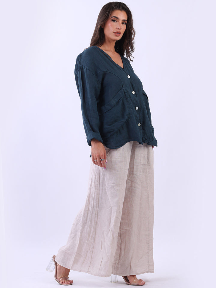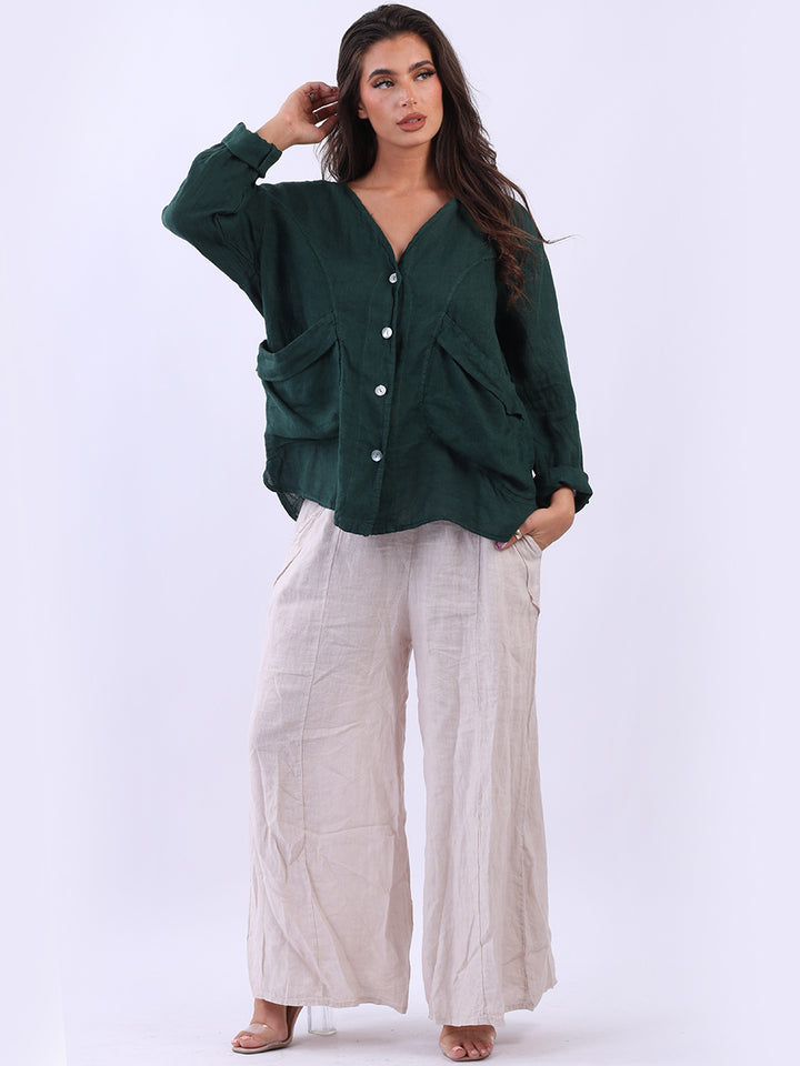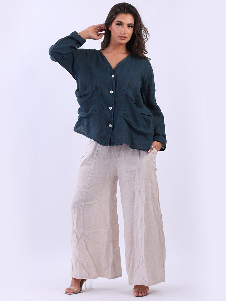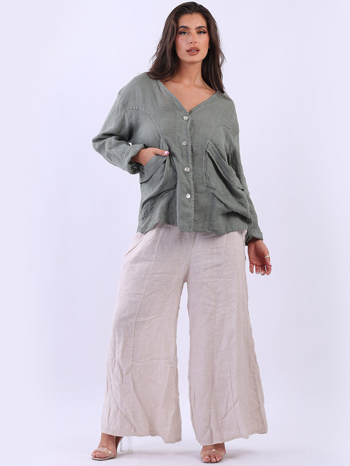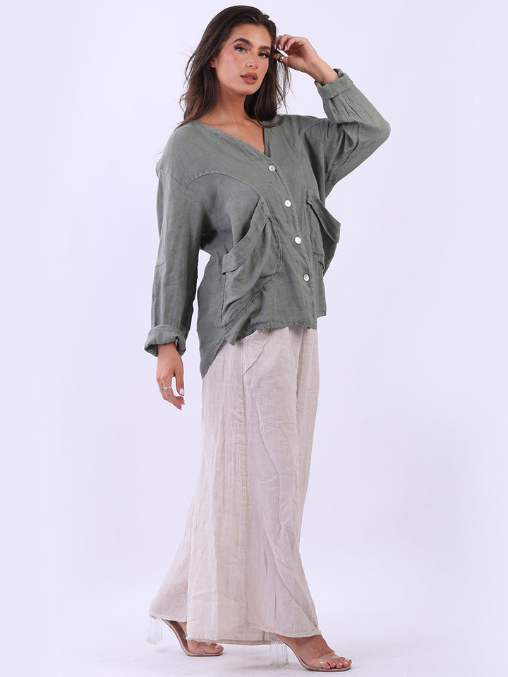 High class with touch of comfort that is classy and iconic. Made in Italy with finest soft linen that is recommended for all body types, plunging V neckline with front button detailing and pockets. Long rolled up sleeves and earthy tones makes it ideal for every day dressing right.