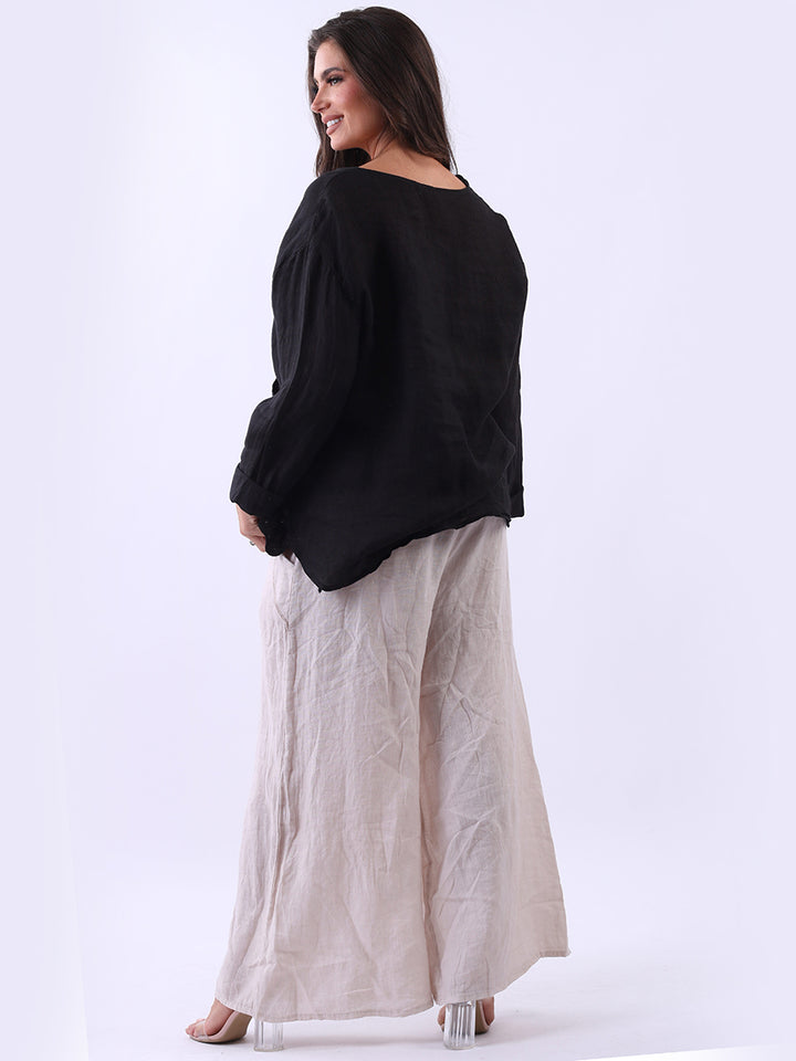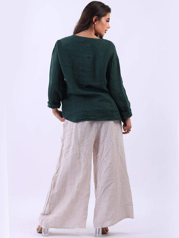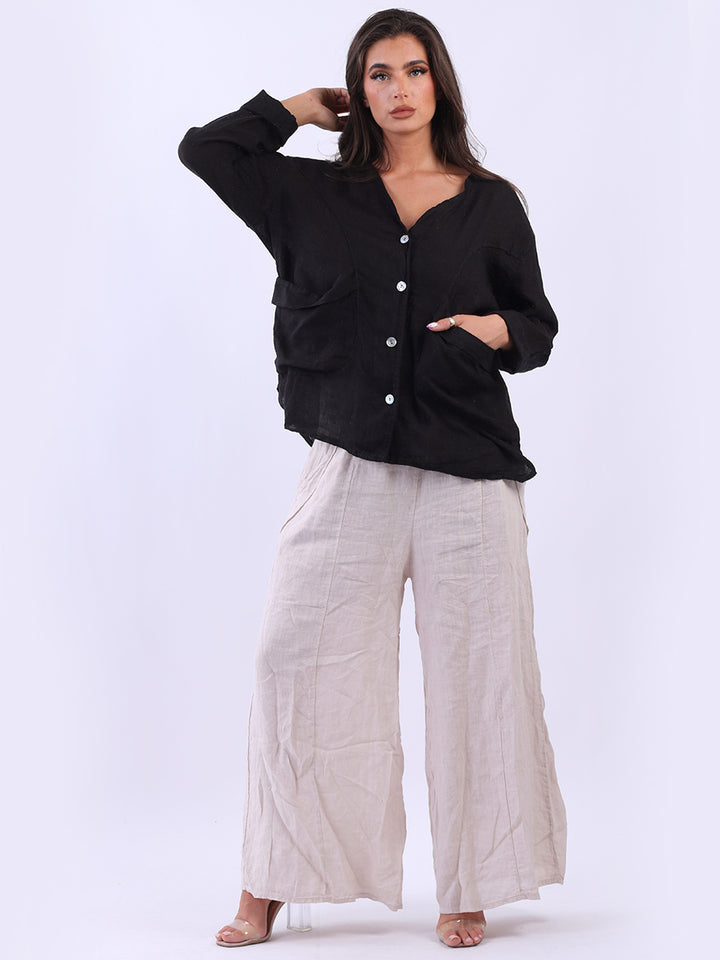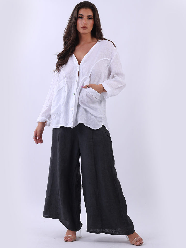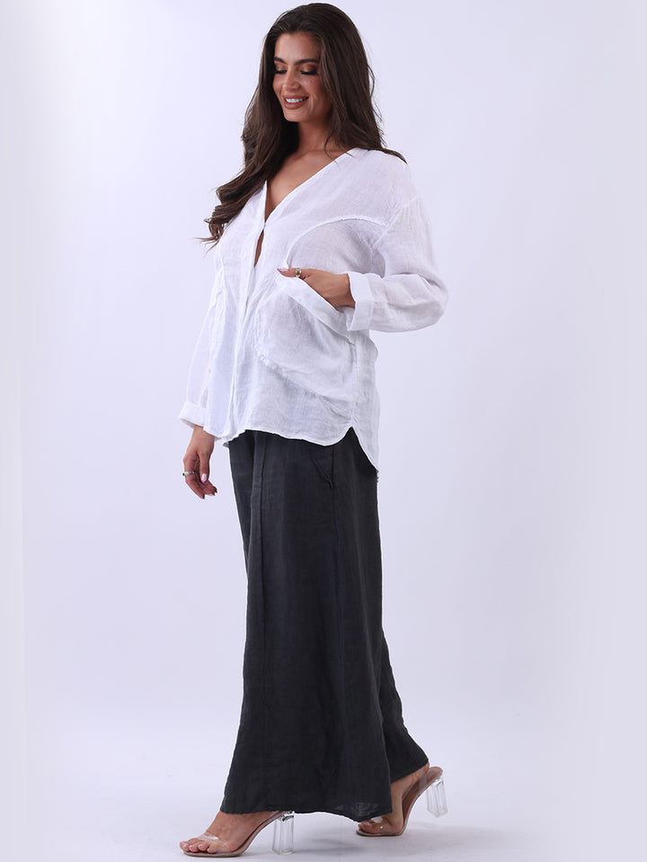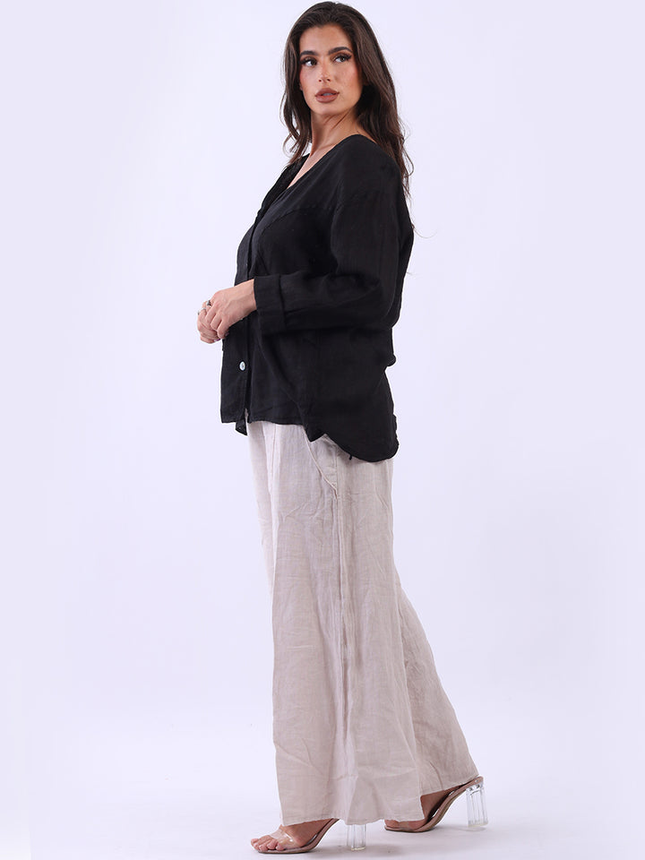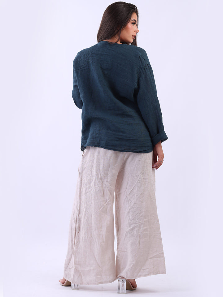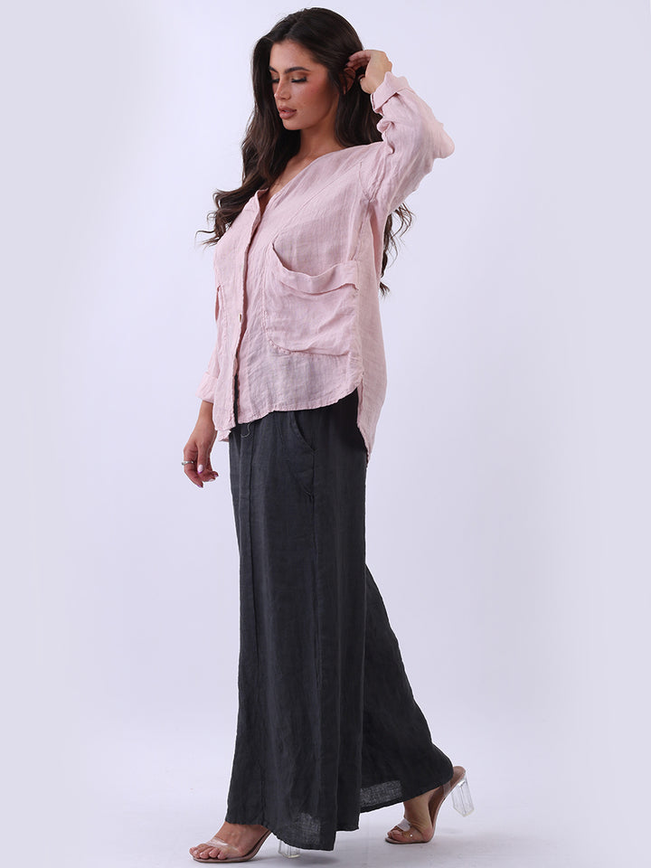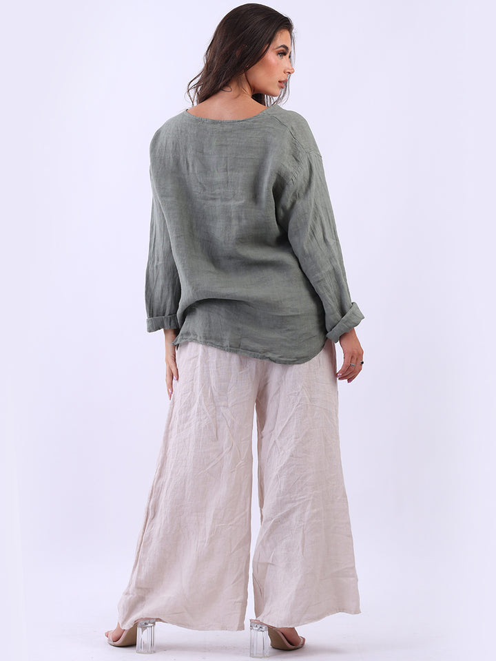 High class with touch of comfort that is classy and iconic. Made in Italy with finest soft linen that is recommended for all body types, plunging V neckline with front button detailing and pockets. Long rolled up sleeves and earthy tones makes it ideal for every day dressing right.