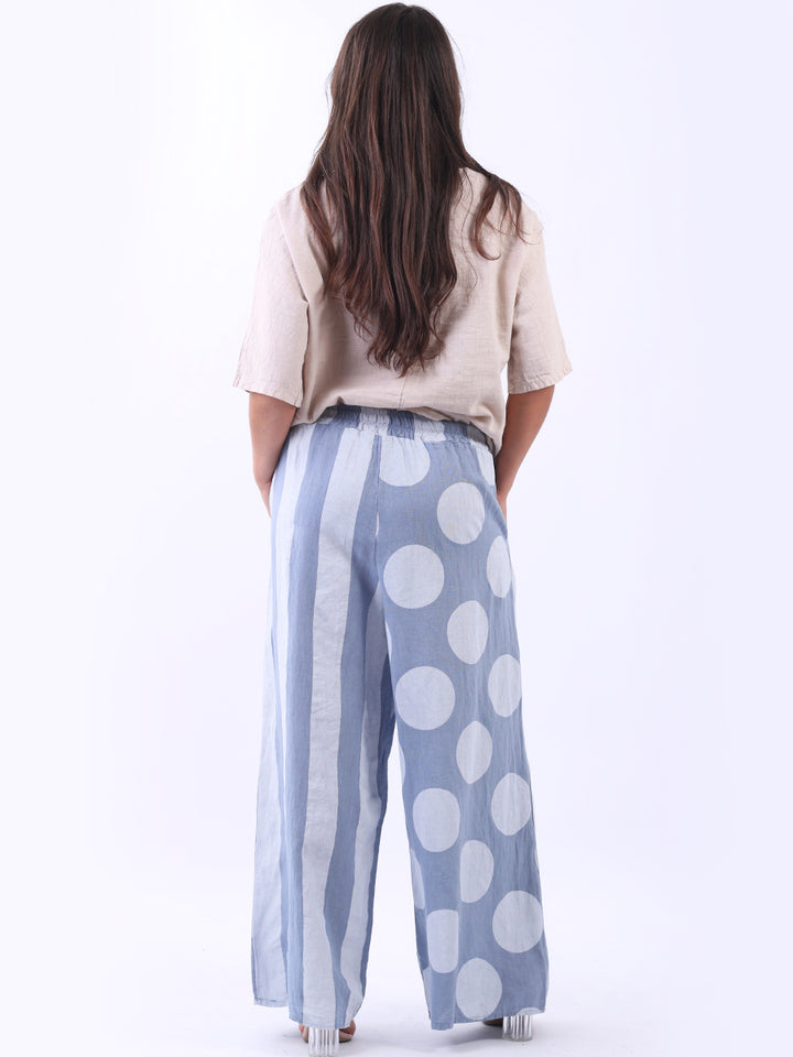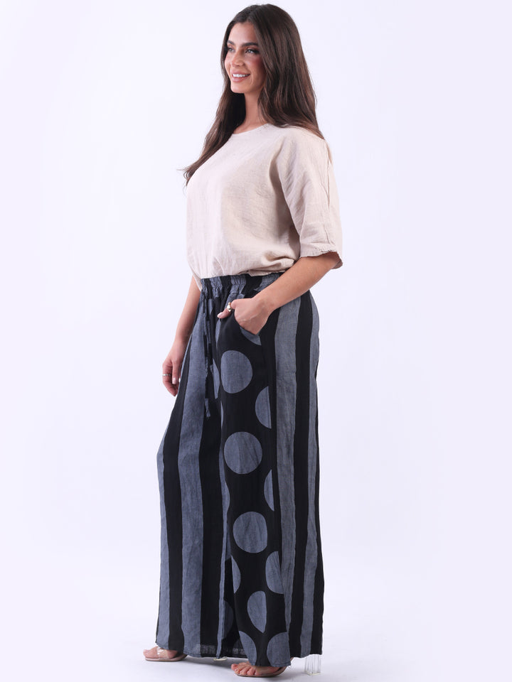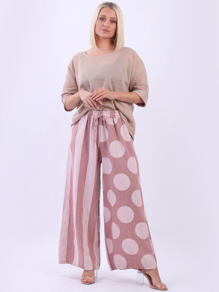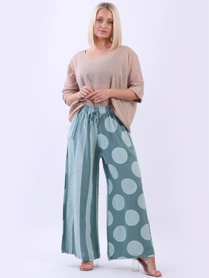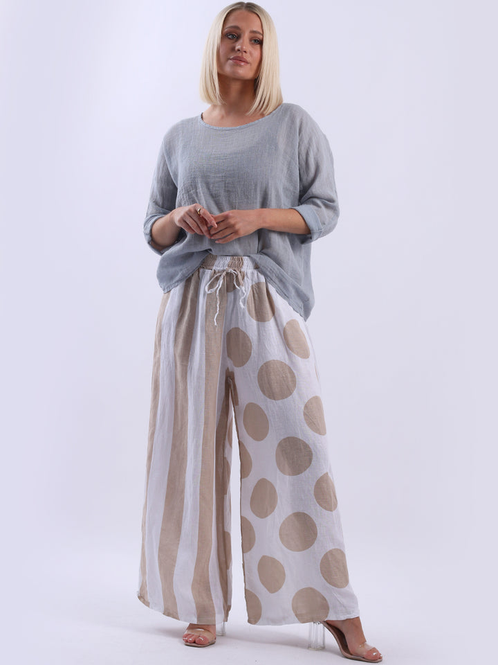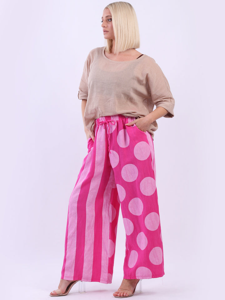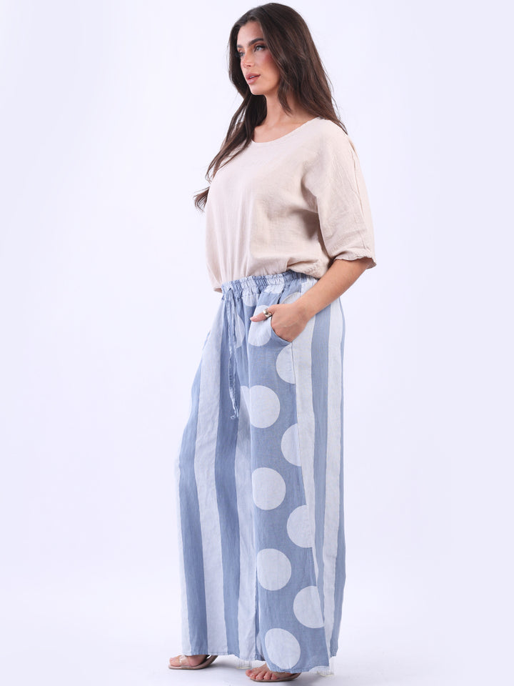 Retro and stylish with all the fab and comfort of linen. Made in Italy with finest linen and features like elastic waist, wide leg palazzo style and a modish finish of stripy and polka dot print. Team it with sequin crop top from Redwholesale London.