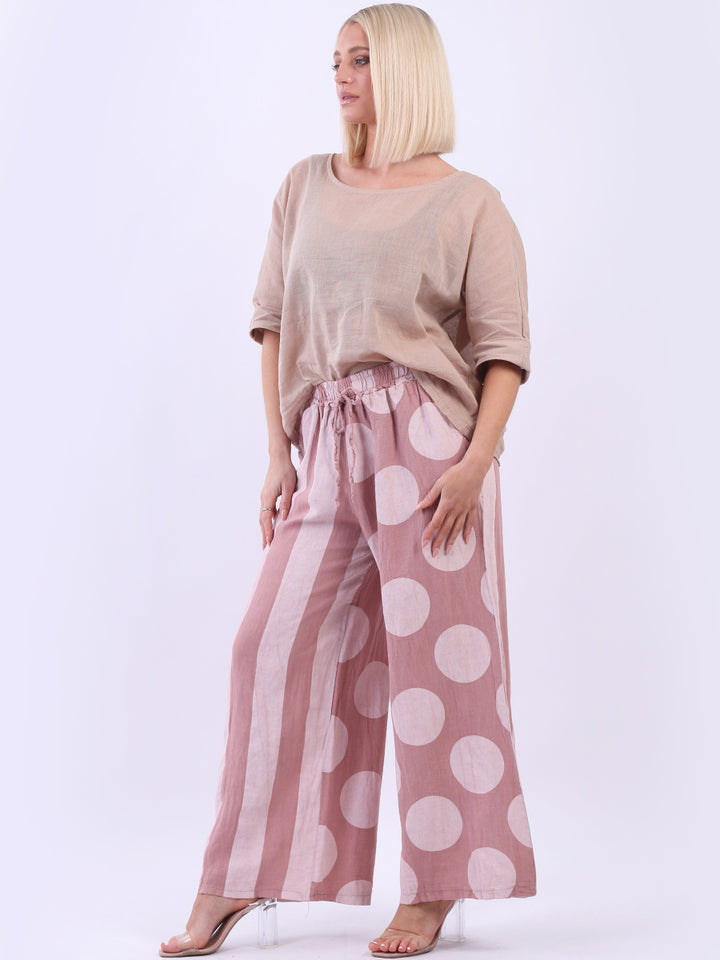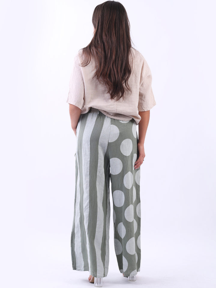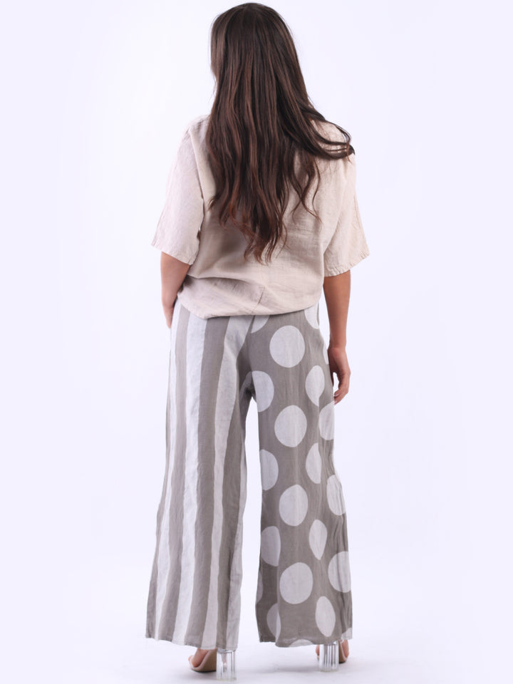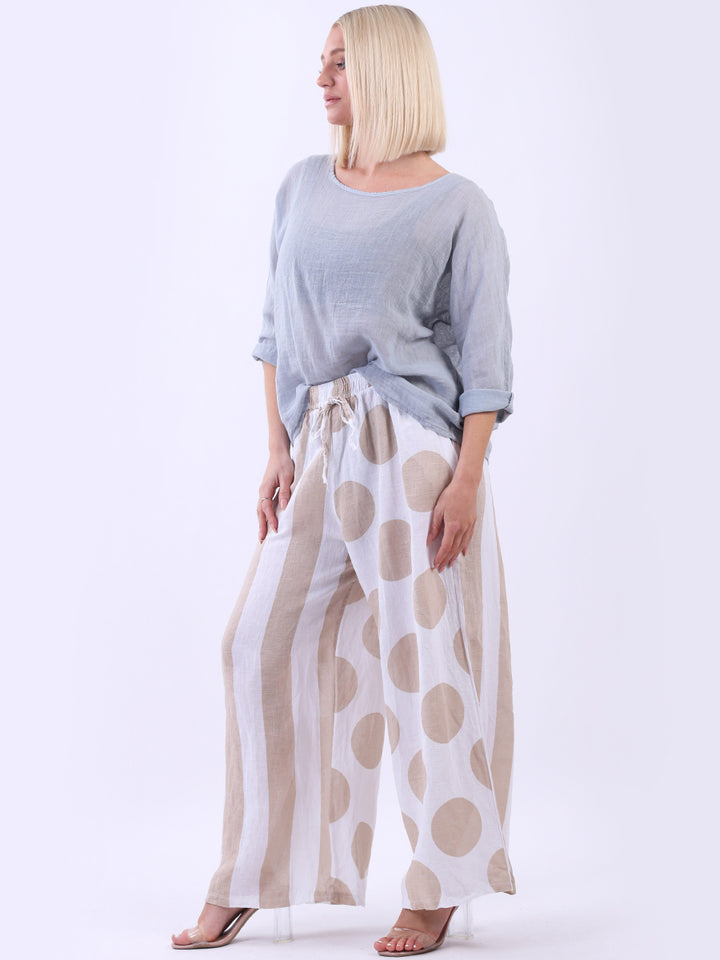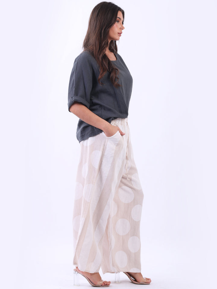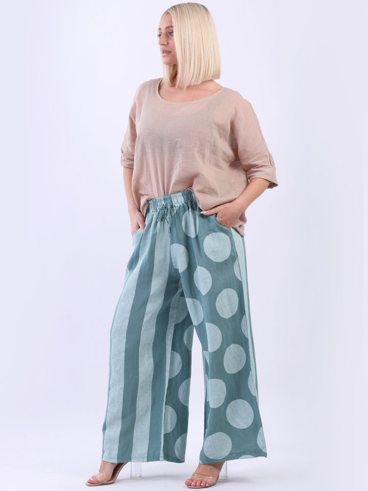Retro and stylish with all the fab and comfort of linen. Made in Italy with finest linen and features like elastic waist, wide leg palazzo style and a modish finish of stripy and polka dot print. Team it with sequin crop top from Redwholesale London.