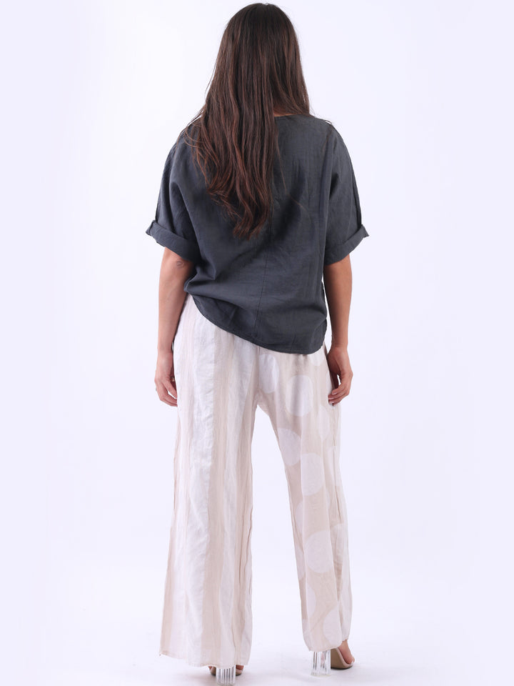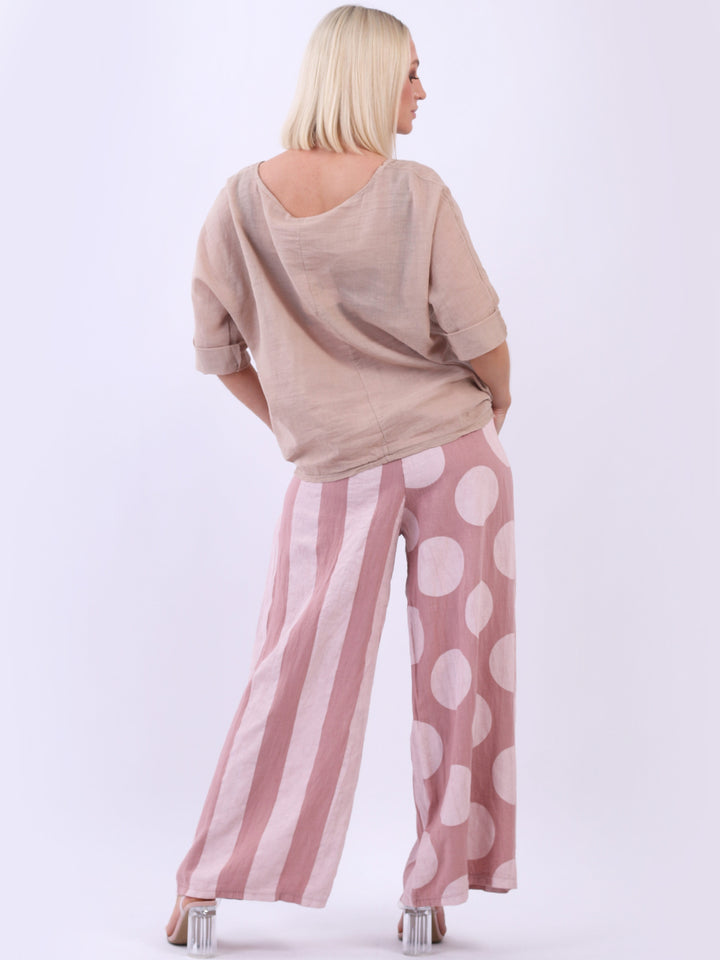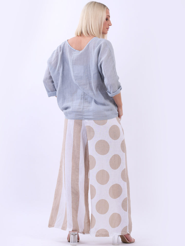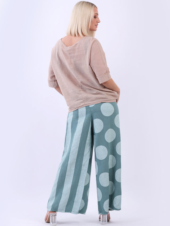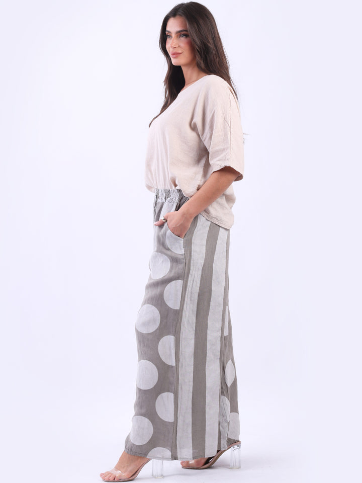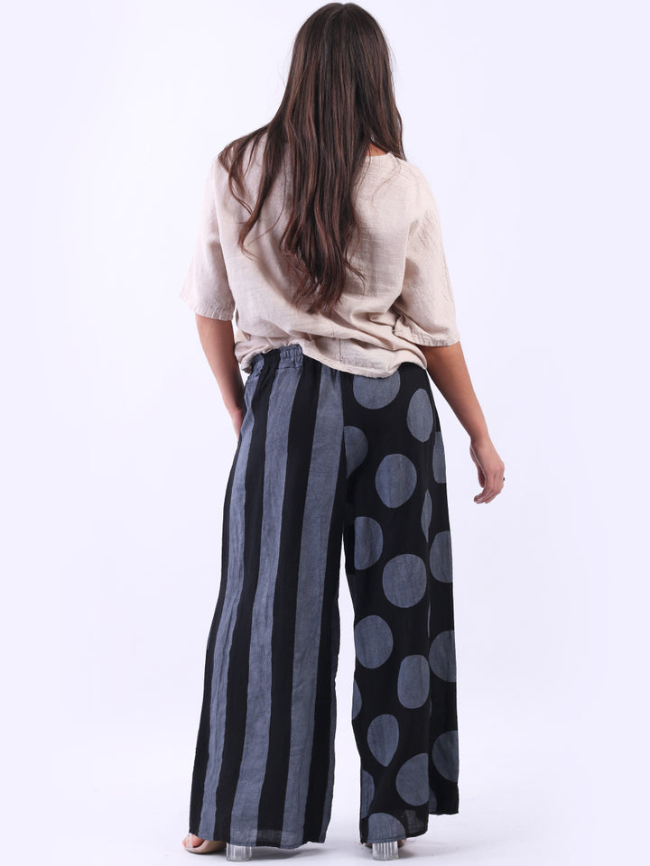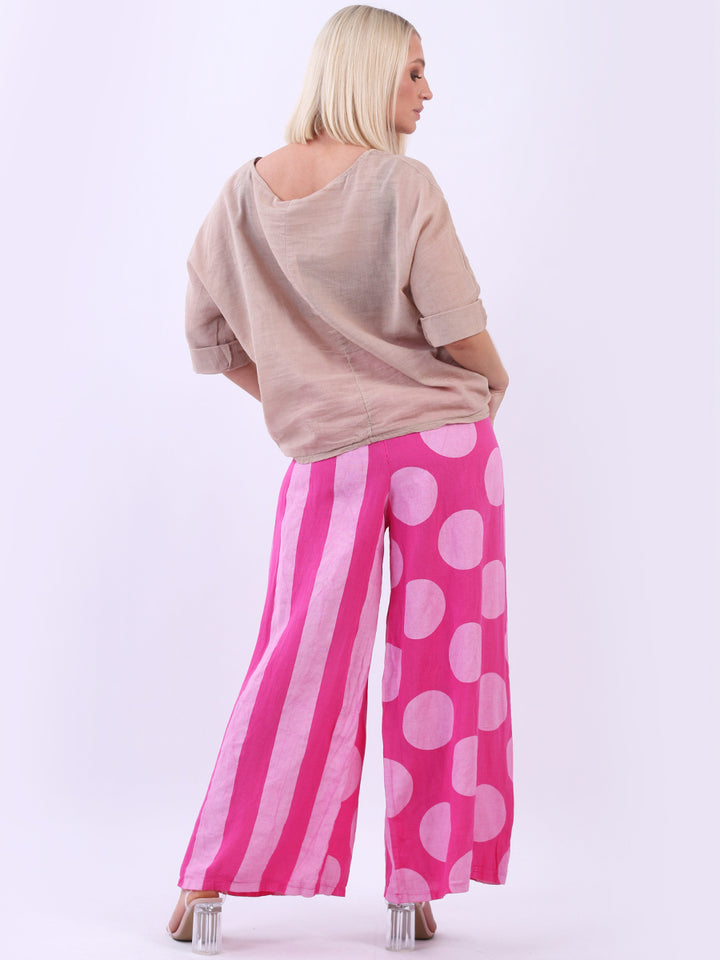 Retro and stylish with all the fab and comfort of linen. Made in Italy with finest linen and features like elastic waist, wide leg palazzo style and a modish finish of stripy and polka dot print. Team it with sequin crop top from Redwholesale London.