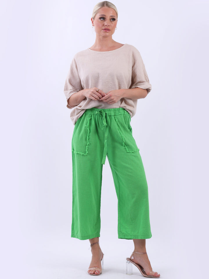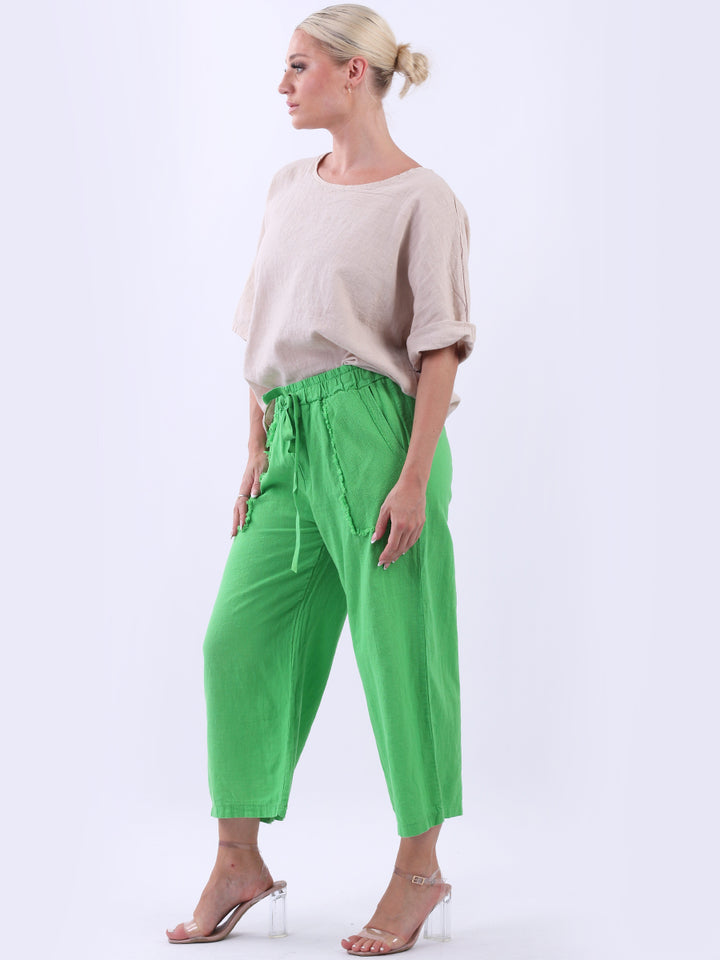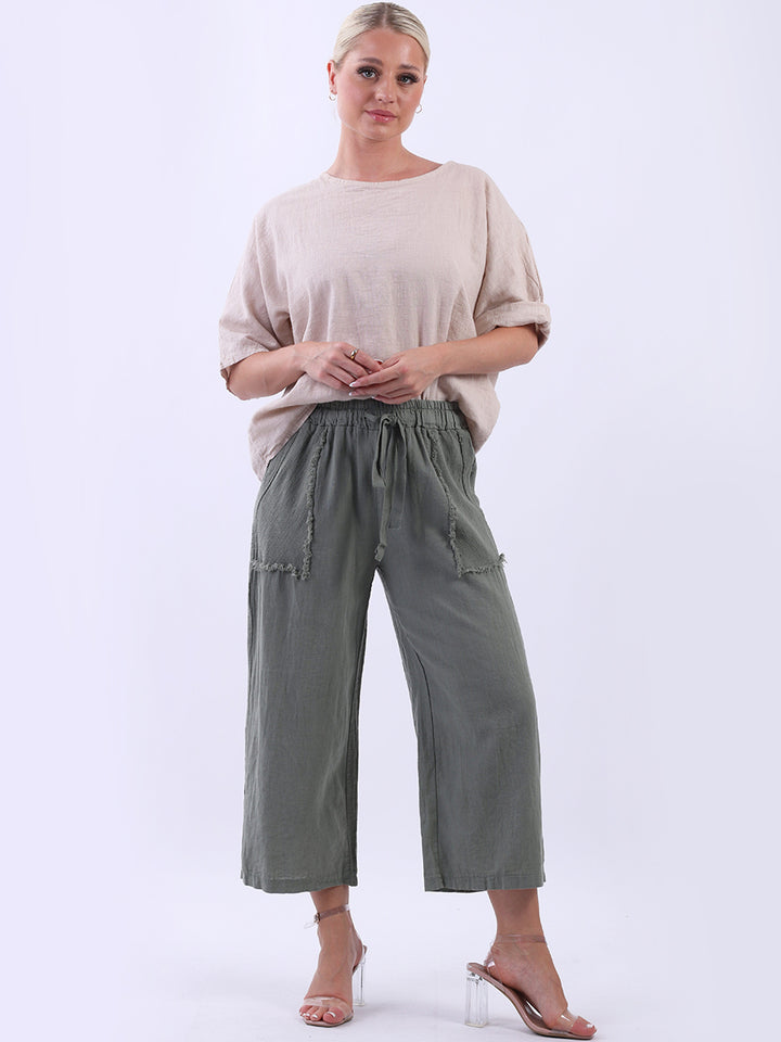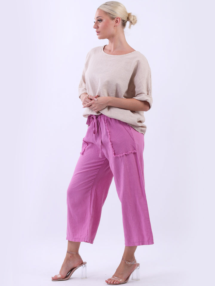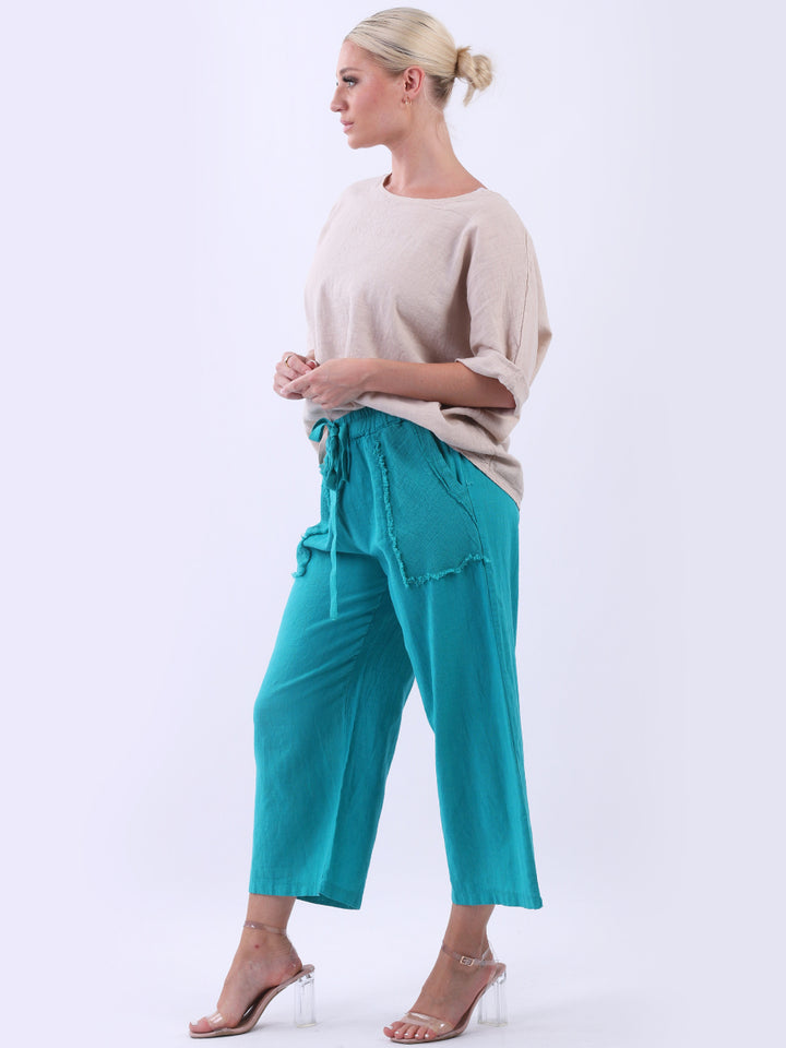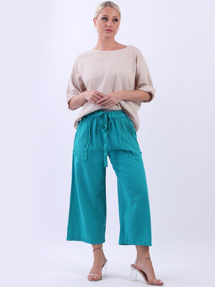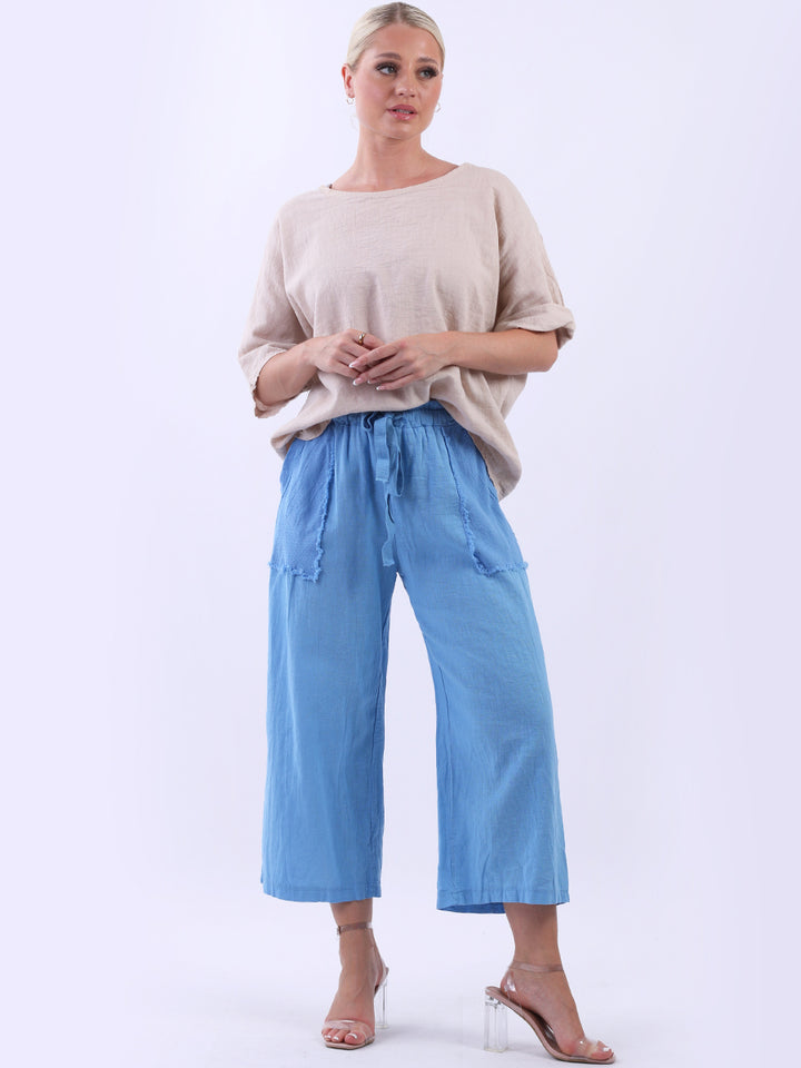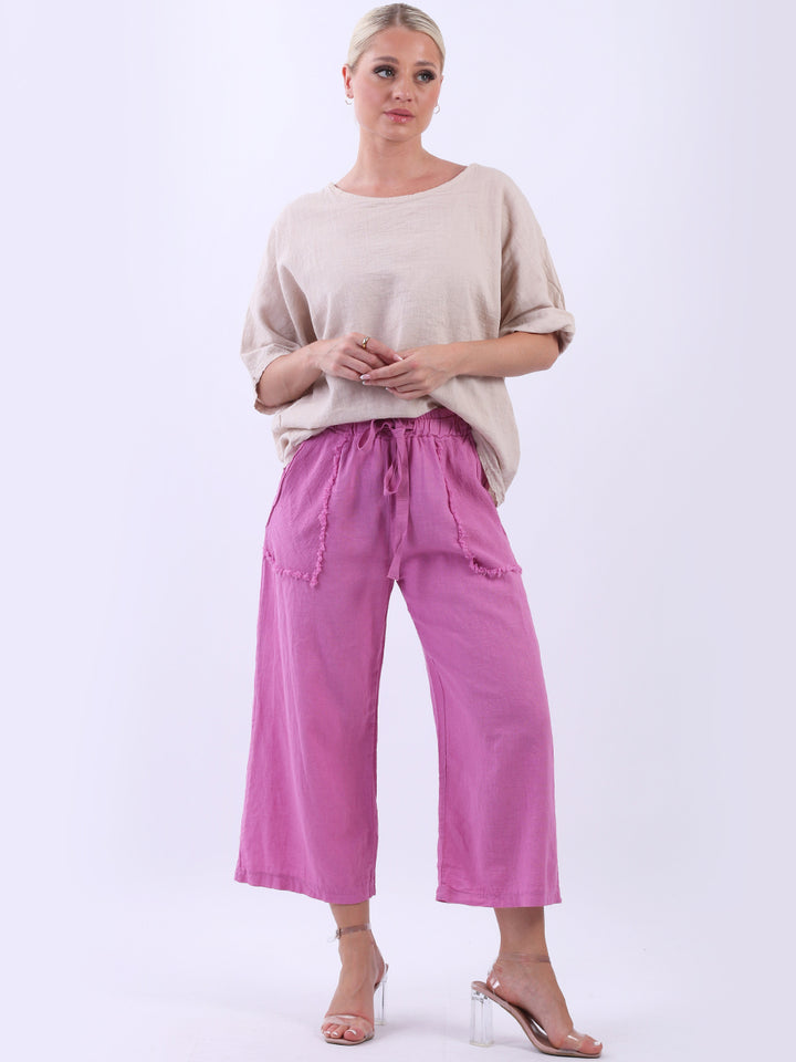 Cozy and ideal for laid back days women wearers love to enjoy. Made in Italy with finest linen and cotton duo that is highly popular with all the right features like adjustable drawstring waist, wide leg and super sweet colors. Wide pockets with raw edge detailing would make it a perfect match with crop top and block heels.