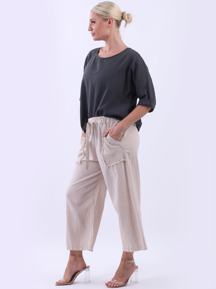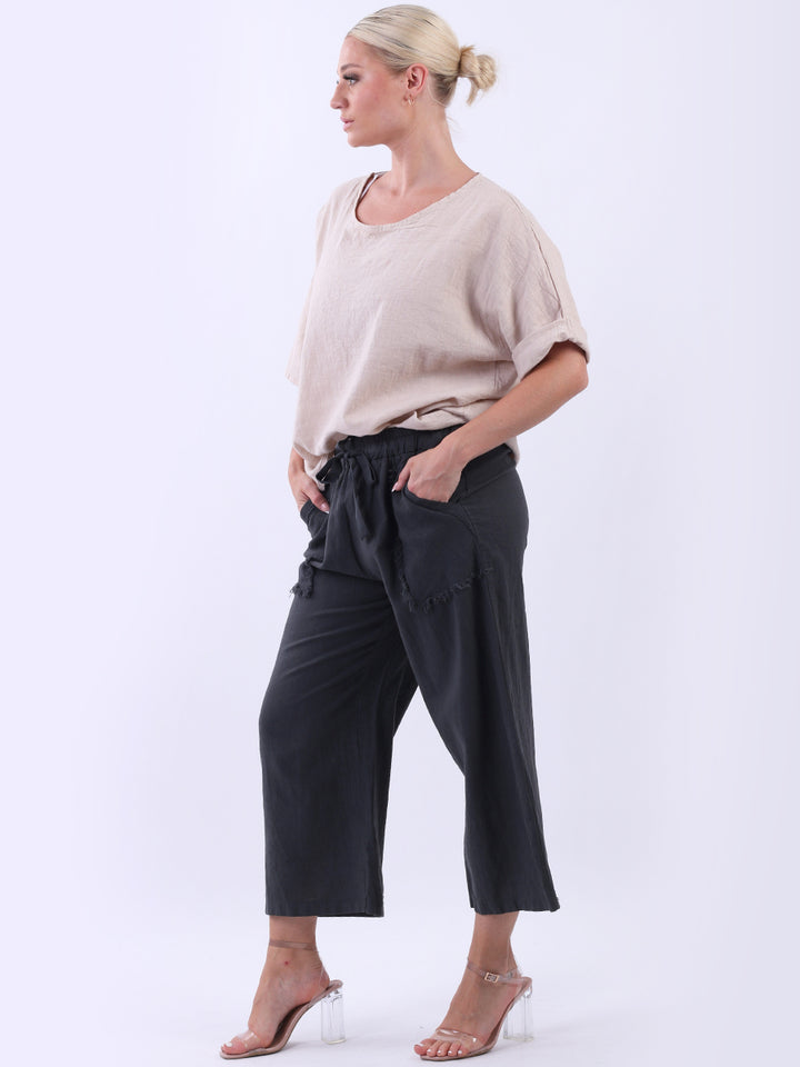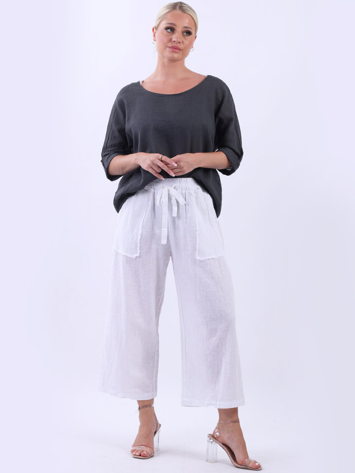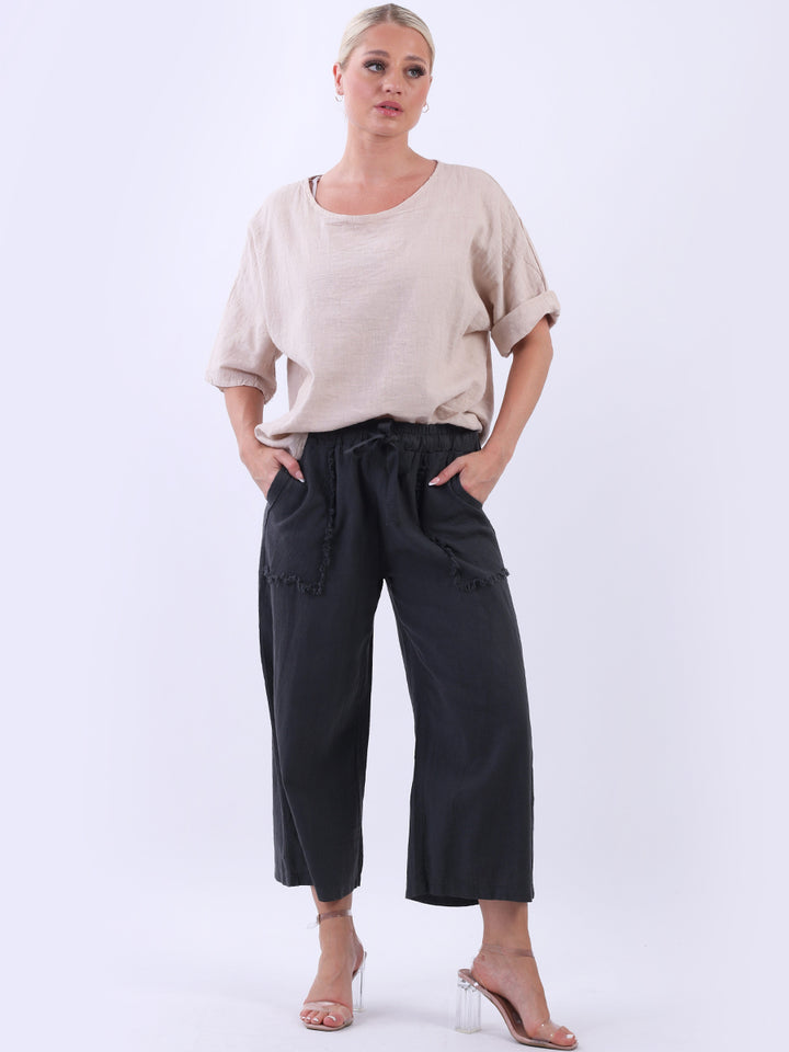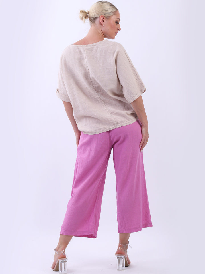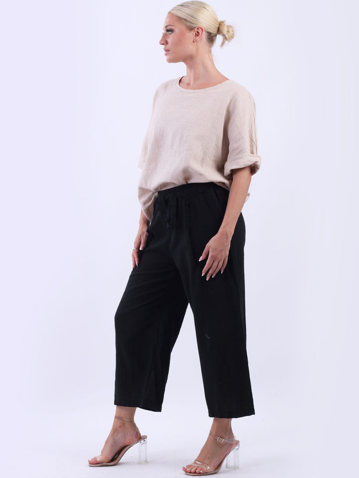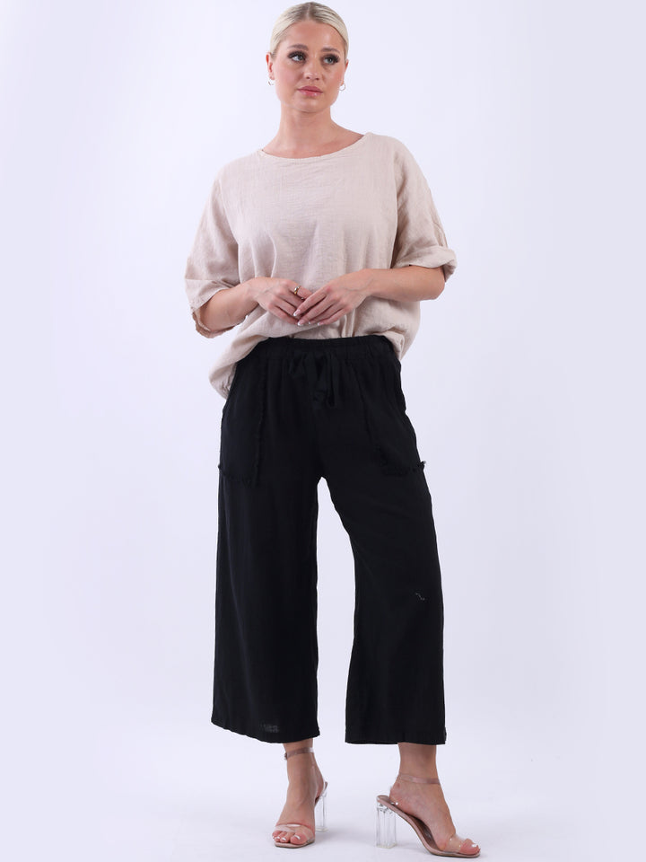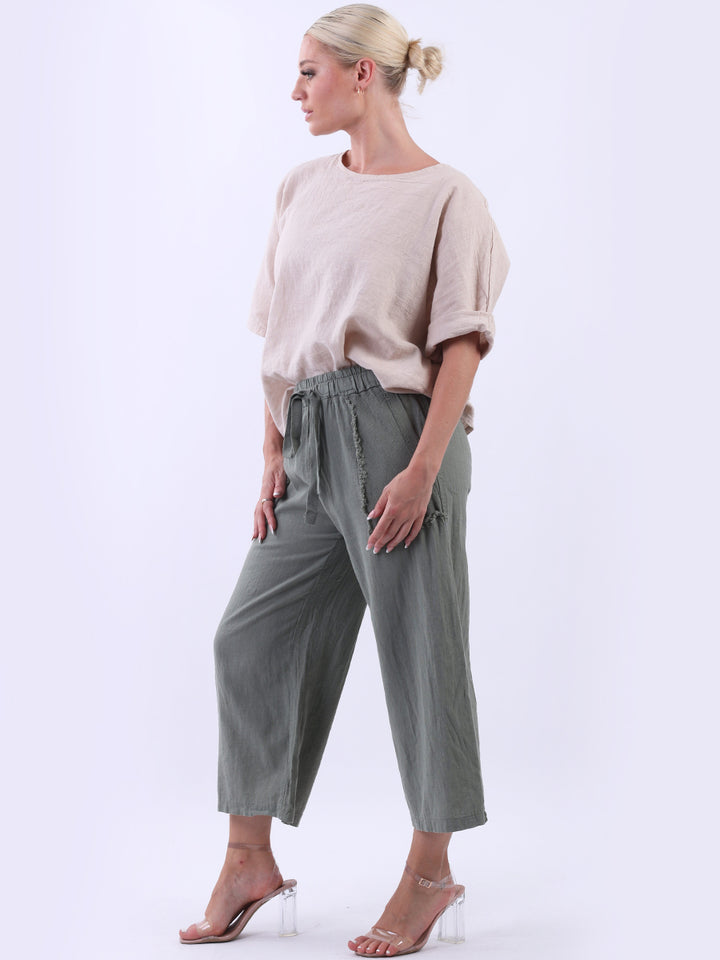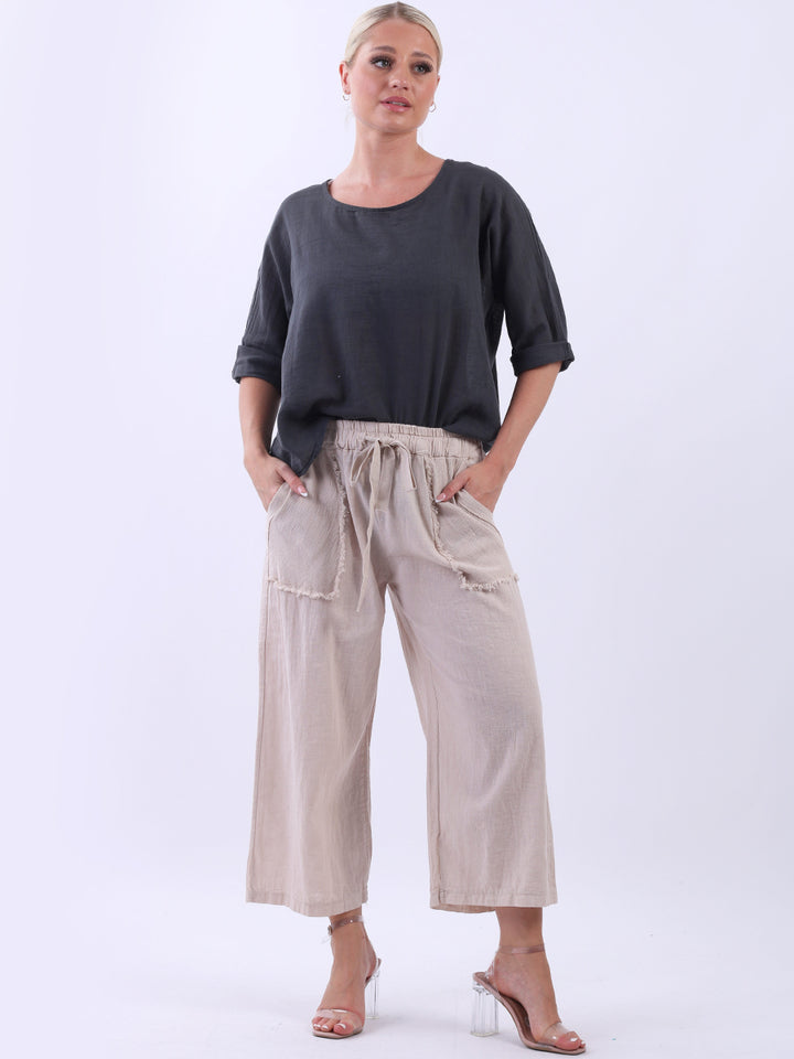 Cozy and ideal for laid back days women wearers love to enjoy. Made in Italy with finest linen and cotton duo that is highly popular with all the right features like adjustable drawstring waist, wide leg and super sweet colors. Wide pockets with raw edge detailing would make it a perfect match with crop top and block heels.