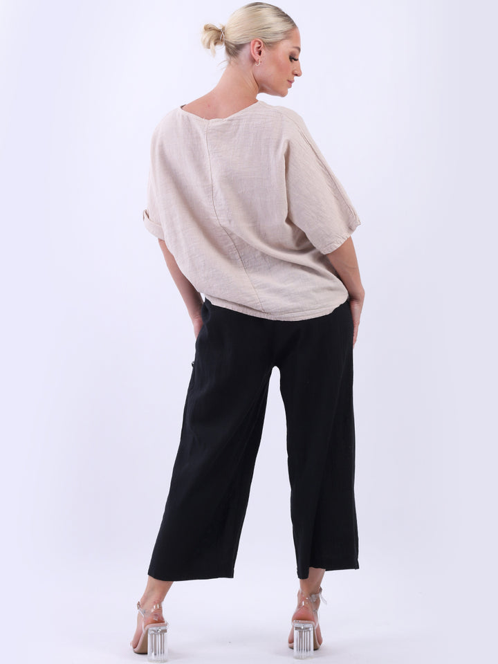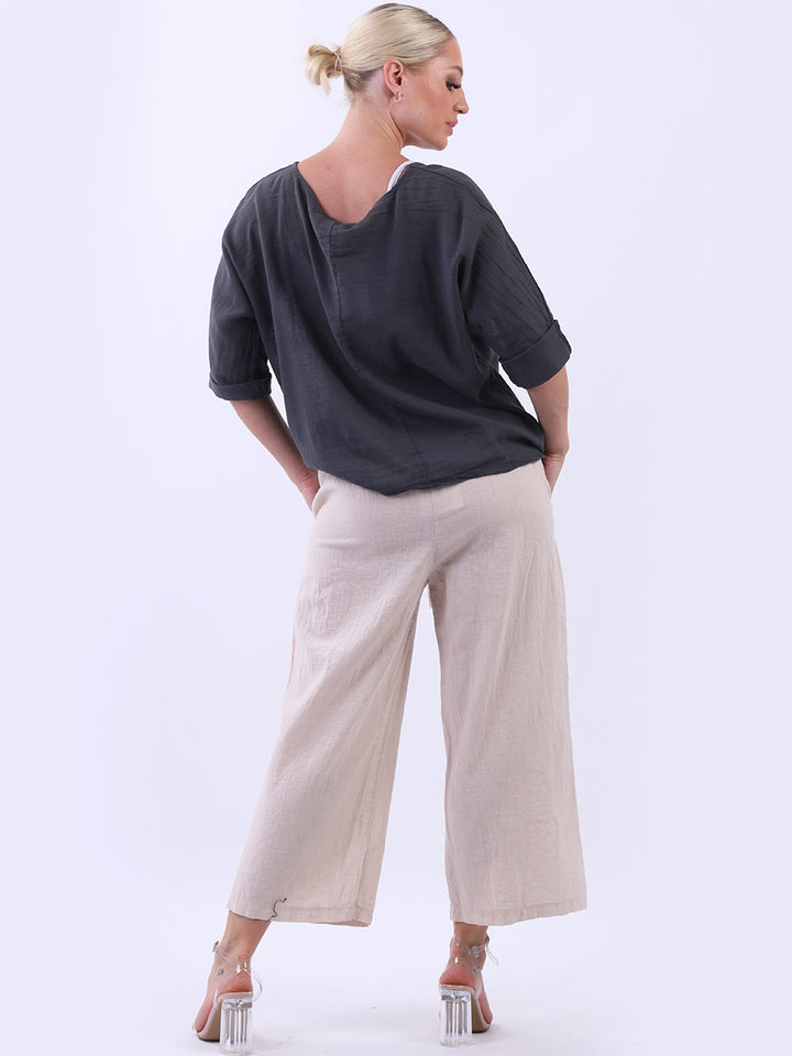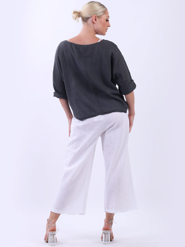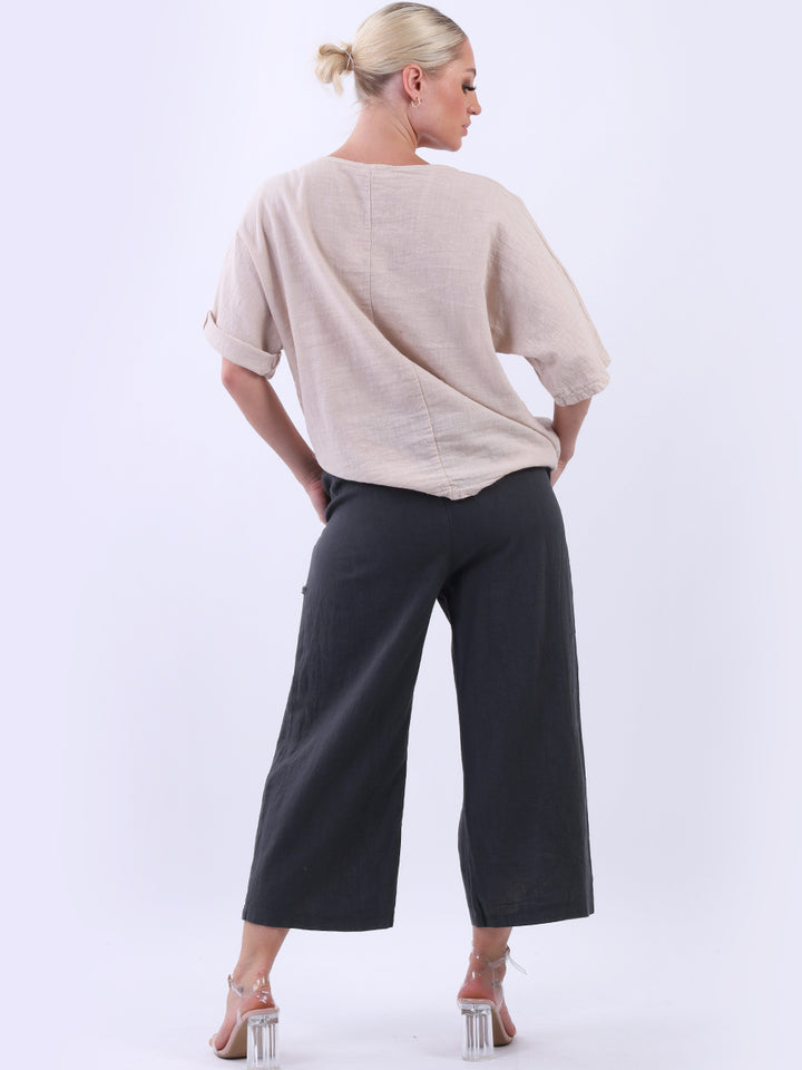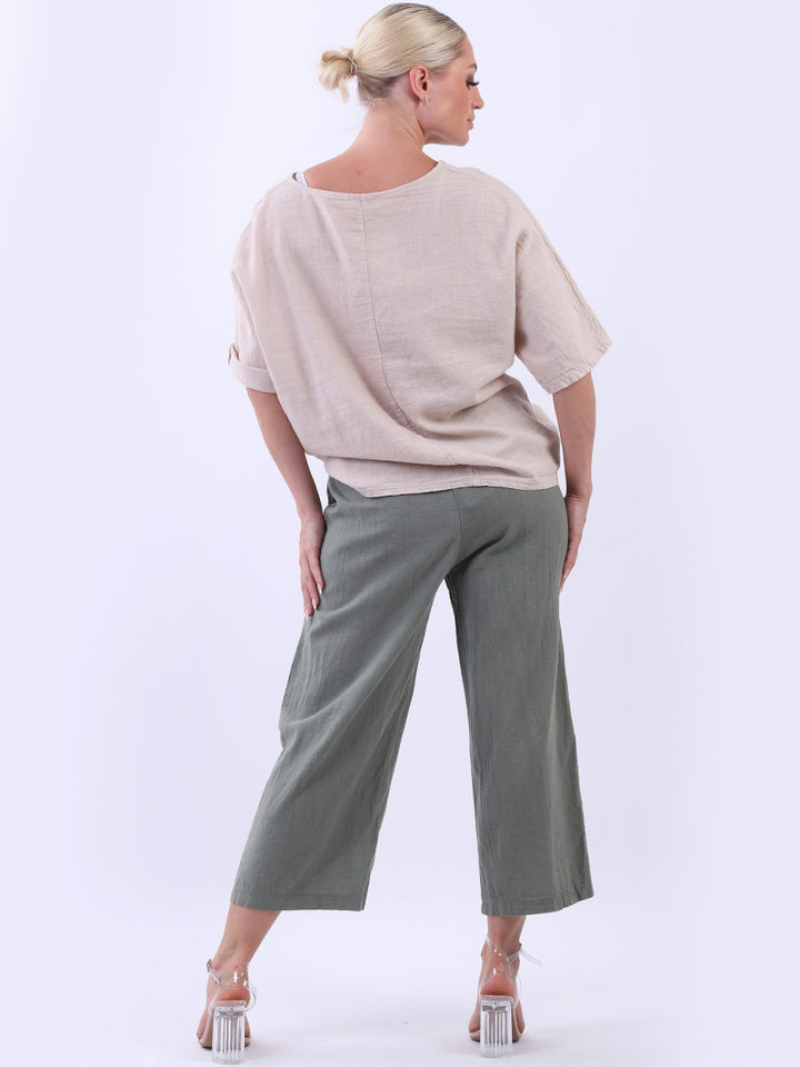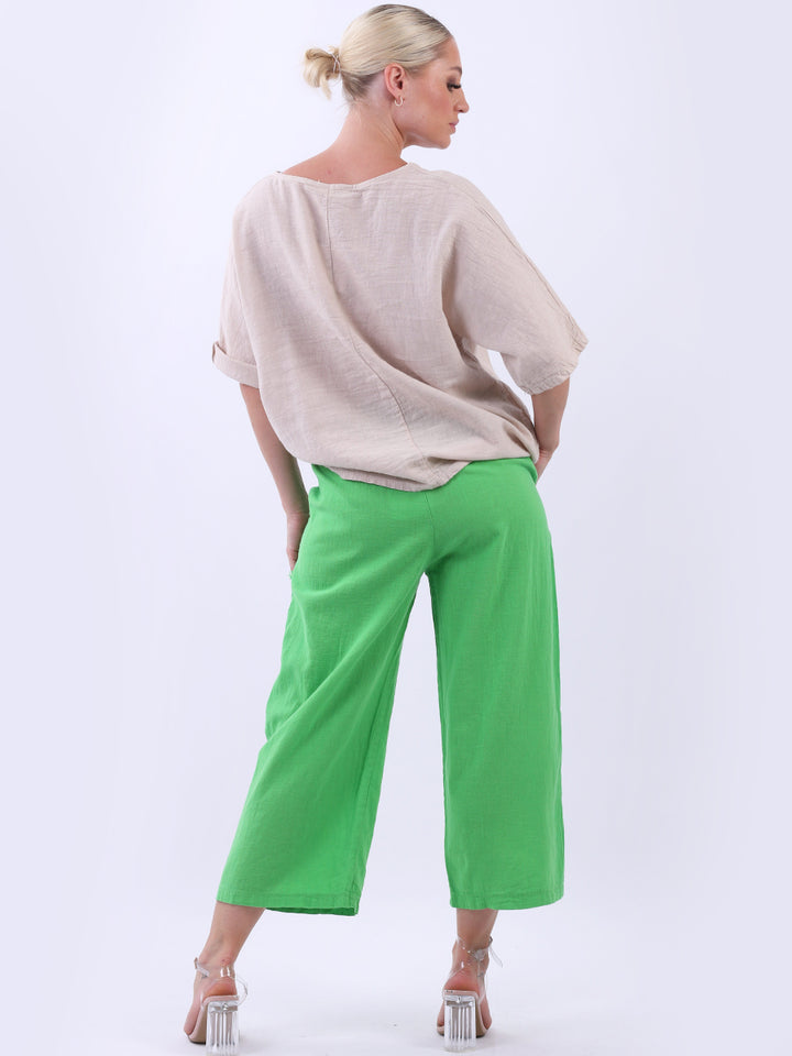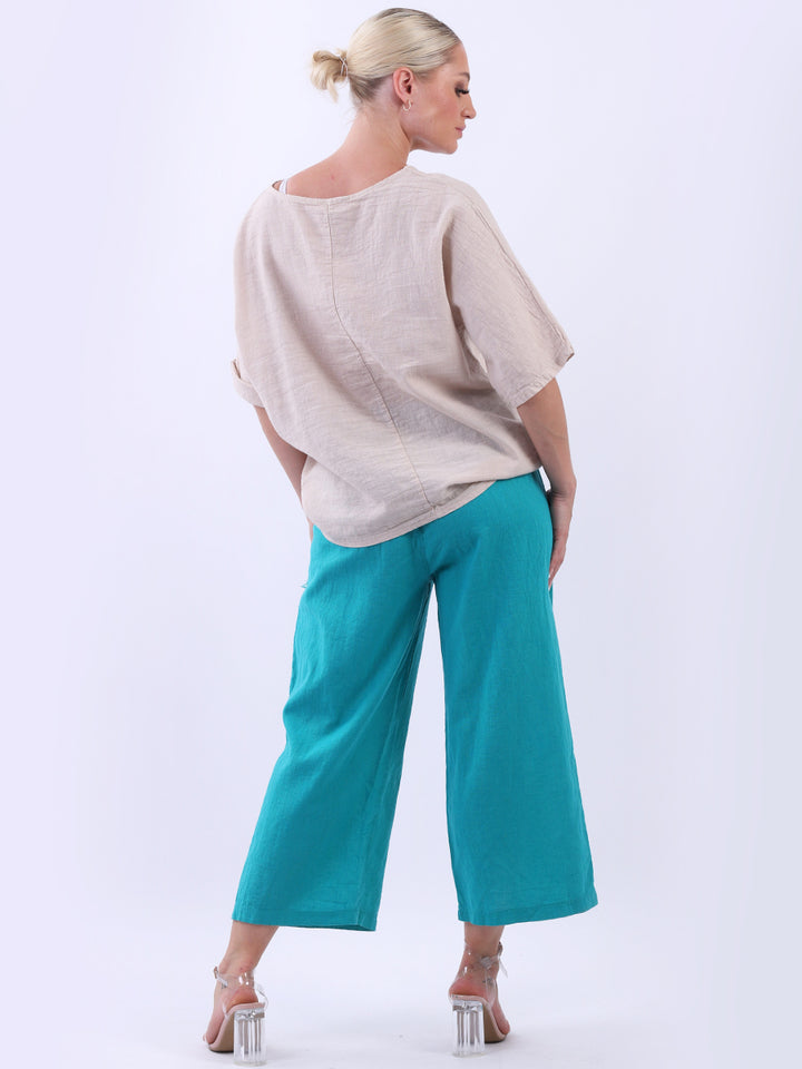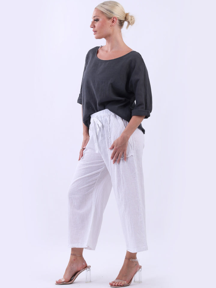 Cozy and ideal for laid back days women wearers love to enjoy. Made in Italy with finest linen and cotton duo that is highly popular with all the right features like adjustable drawstring waist, wide leg and super sweet colors. Wide pockets with raw edge detailing would make it a perfect match with crop top and block heels.