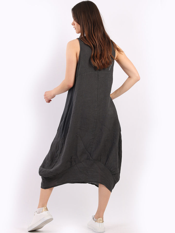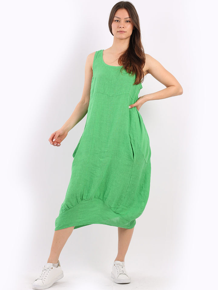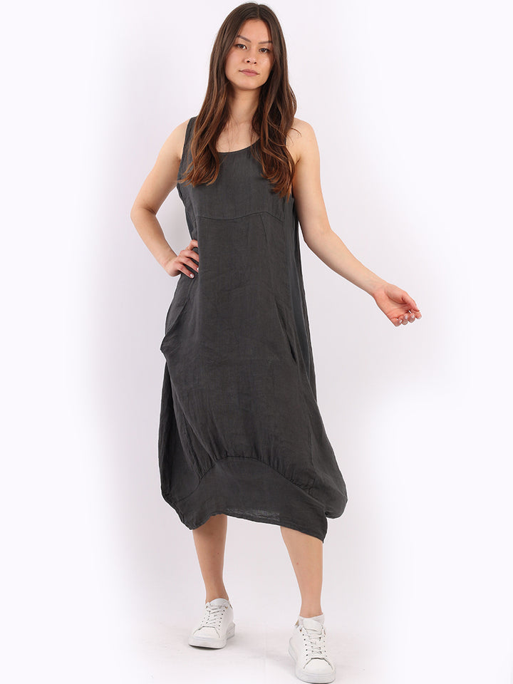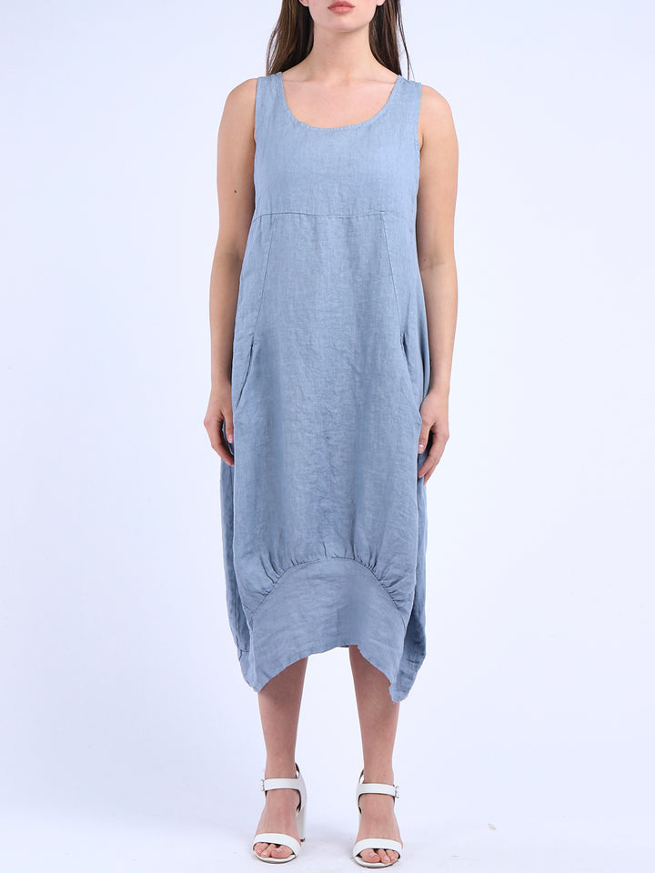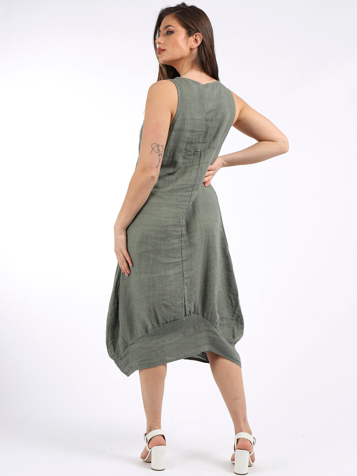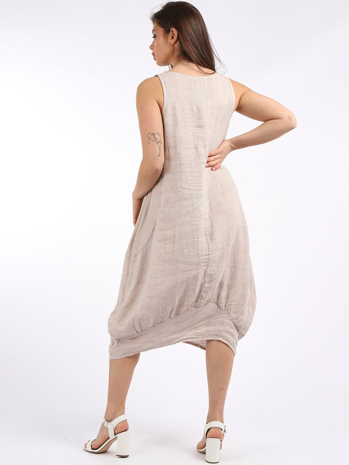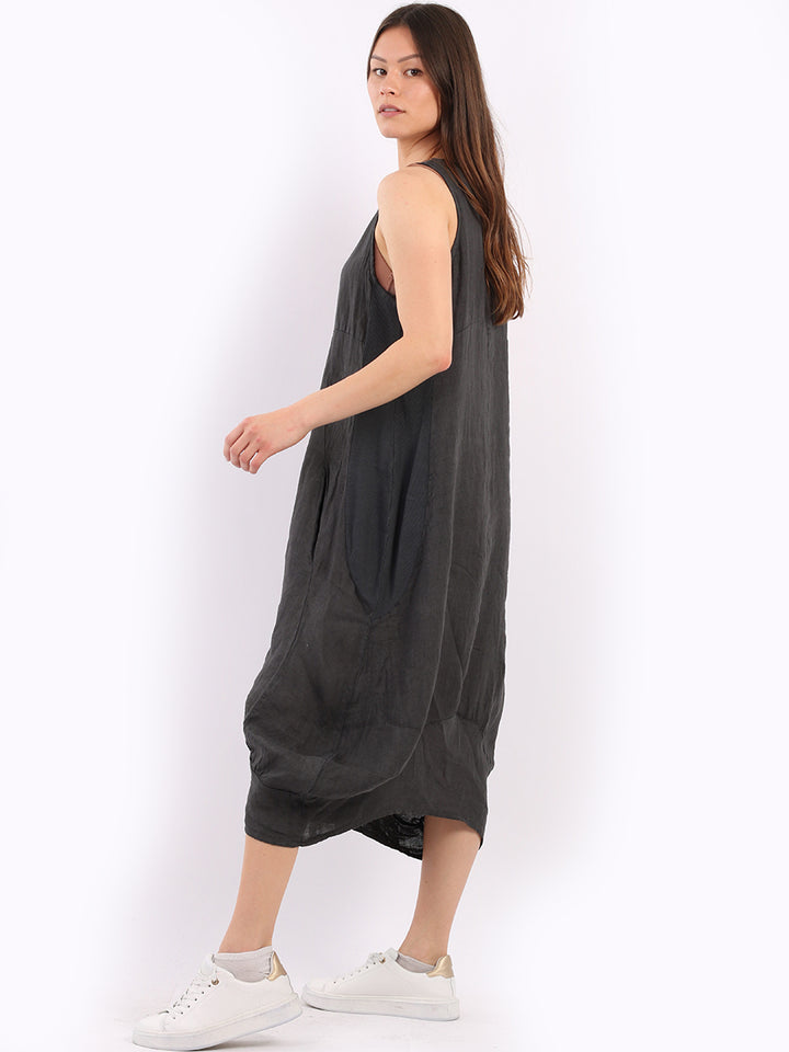 Simplicity and style have been amalgamated to craft this lagenlook dress. Deep scoop neck and sleeveless design makes it apt for the summer vibes. Tailored in single color it brings elegance and exhibits a chic look. Team it with sandals to remain comfortable and stylish.