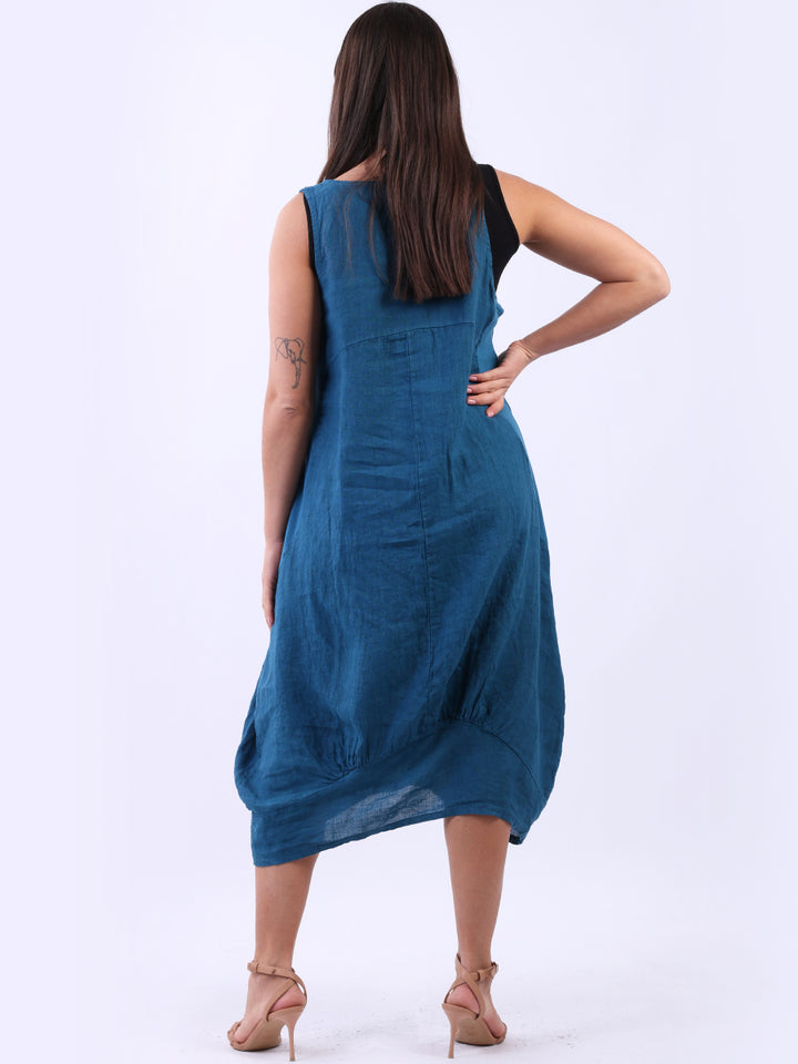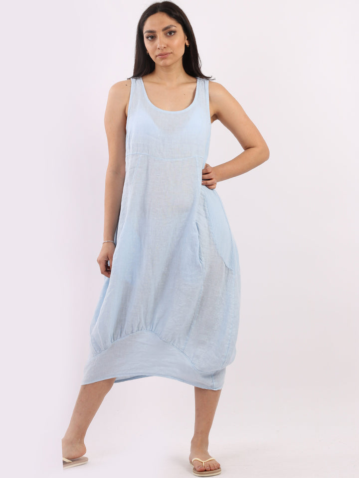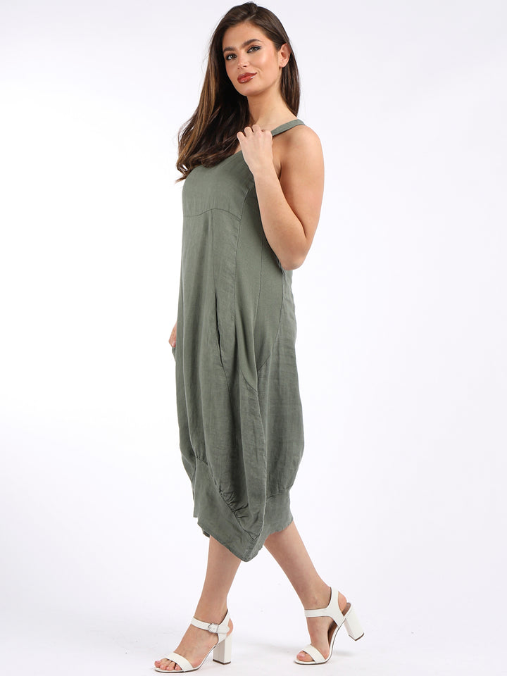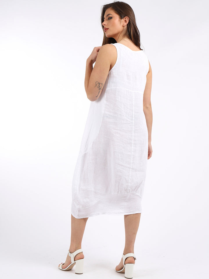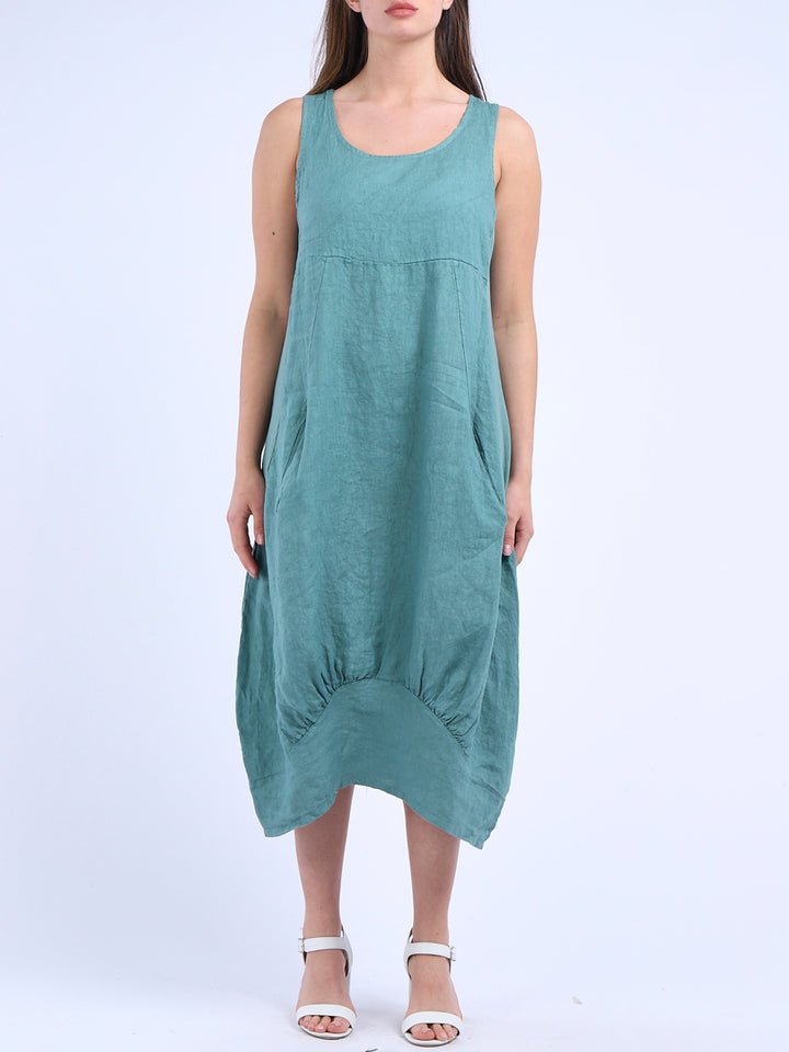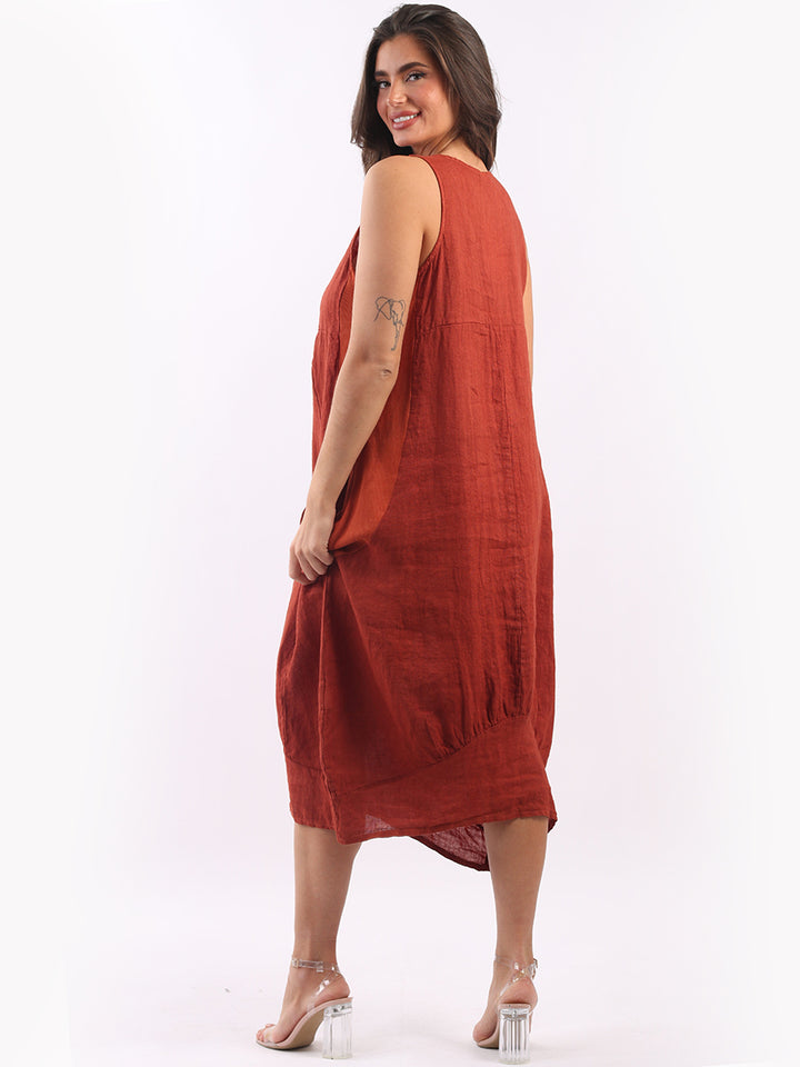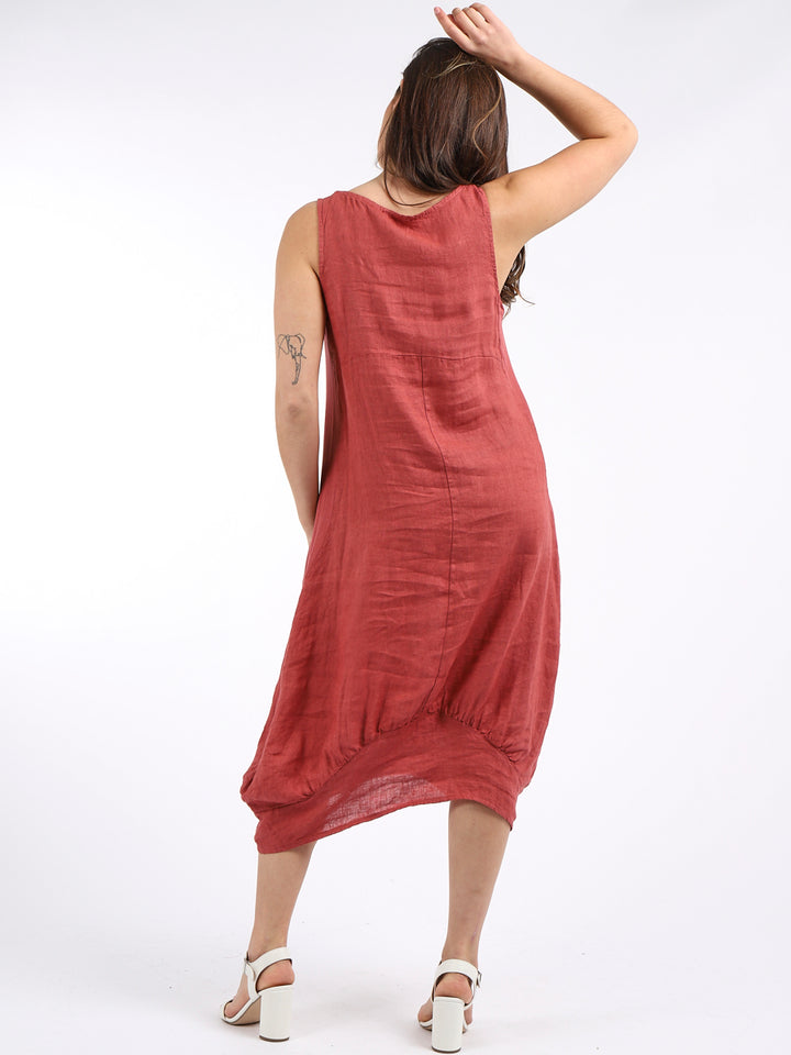 Simplicity and style have been amalgamated to craft this lagenlook dress. Deep scoop neck and sleeveless design makes it apt for the summer vibes. Tailored in single color it brings elegance and exhibits a chic look. Team it with sandals to remain comfortable and stylish.
