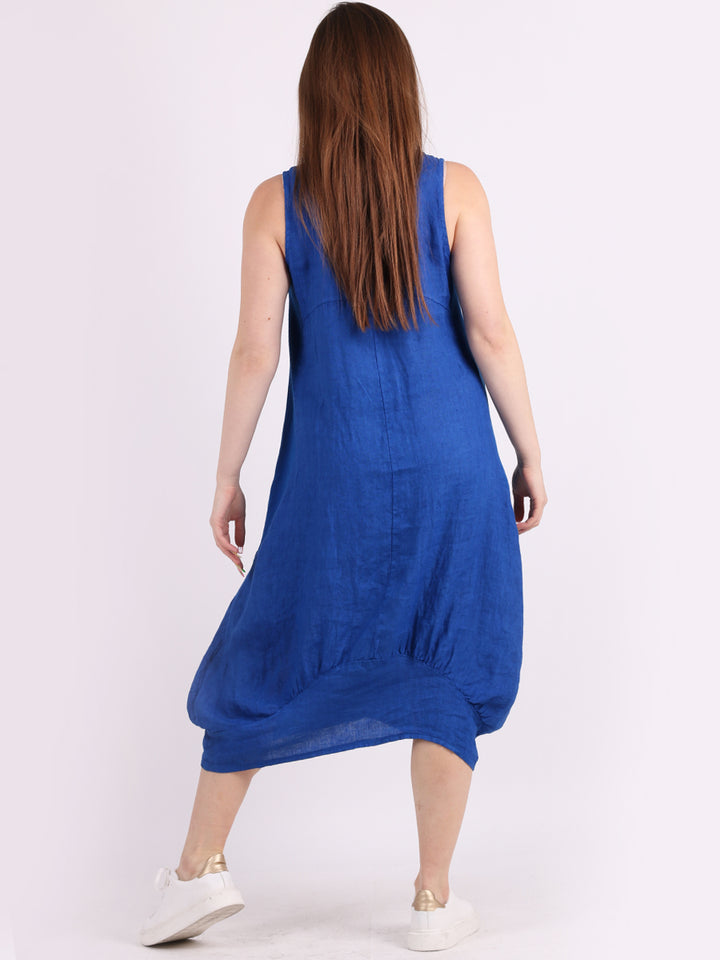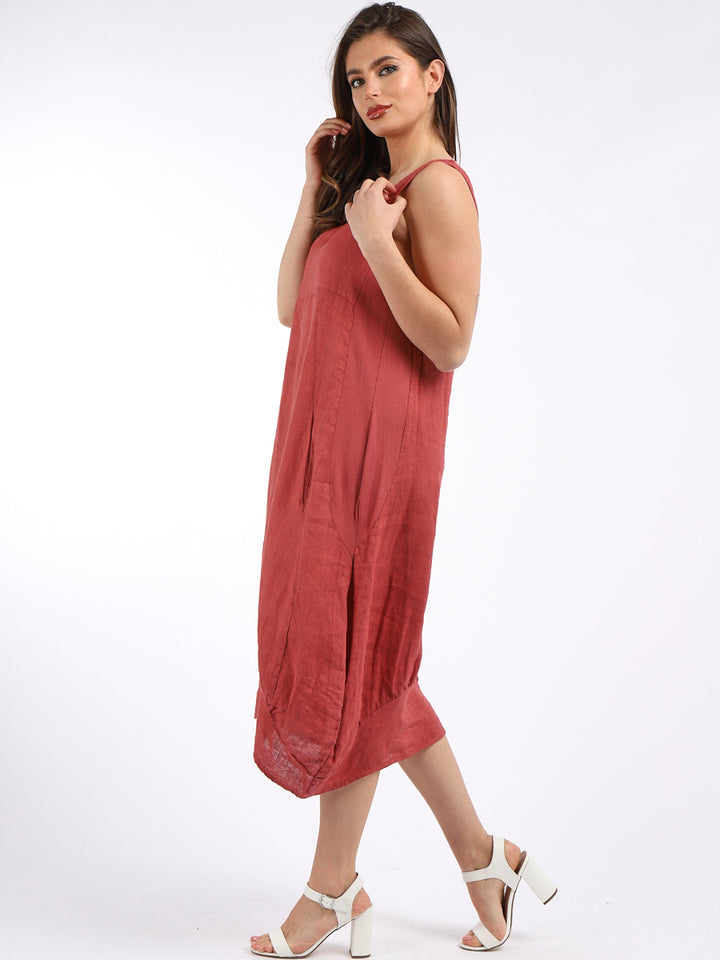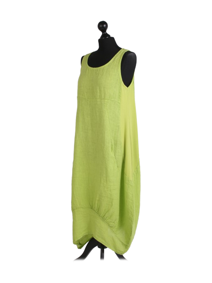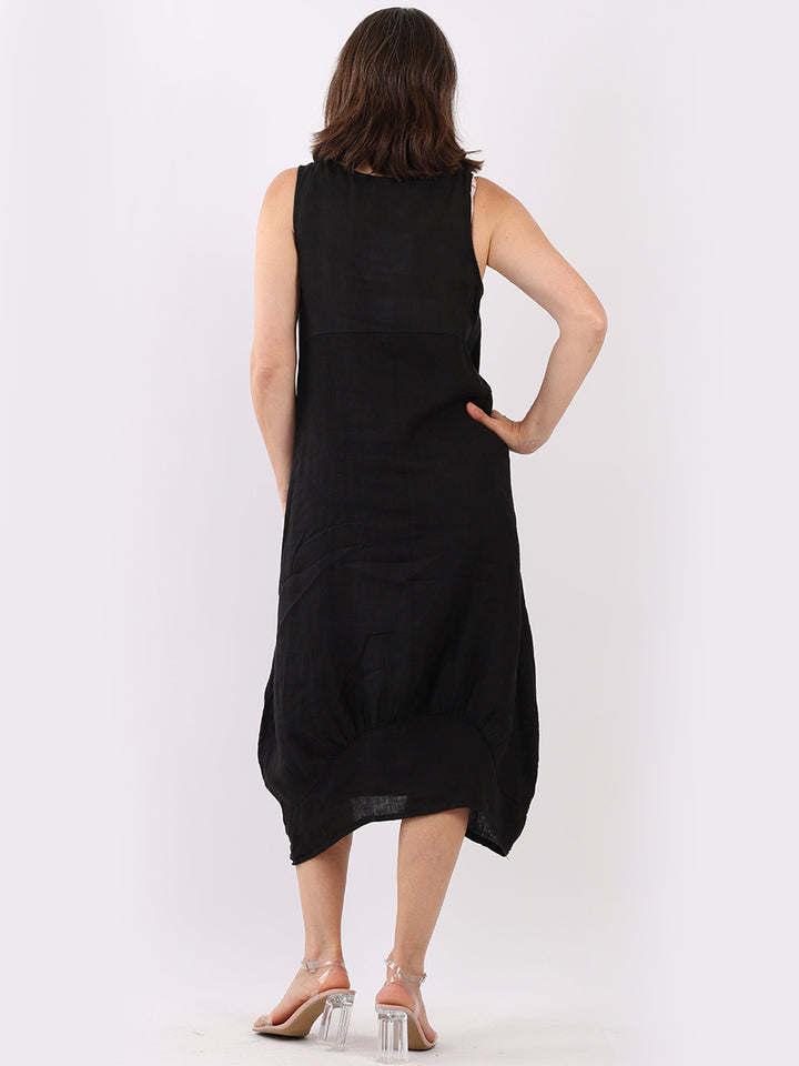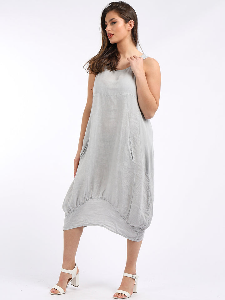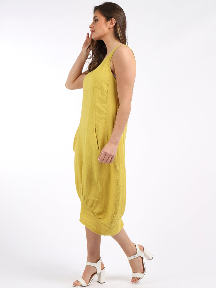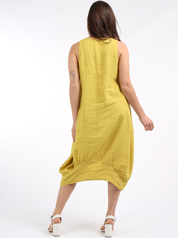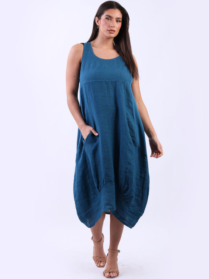 Simplicity and style have been amalgamated to craft this lagenlook dress. Deep scoop neck and sleeveless design makes it apt for the summer vibes. Tailored in single color it brings elegance and exhibits a chic look. Team it with sandals to remain comfortable and stylish.