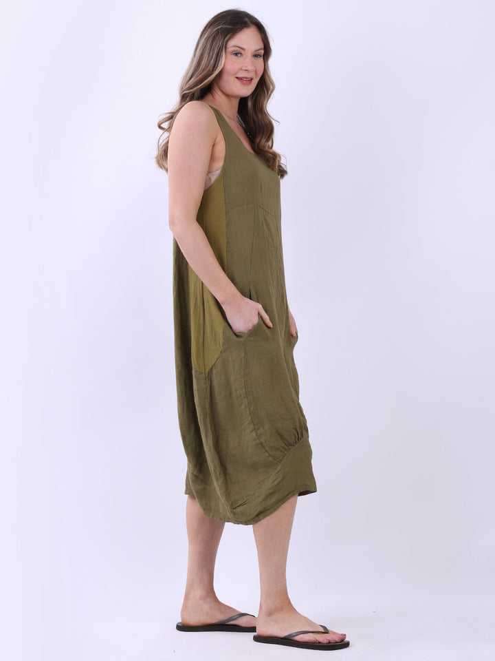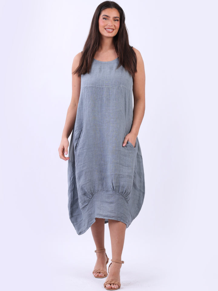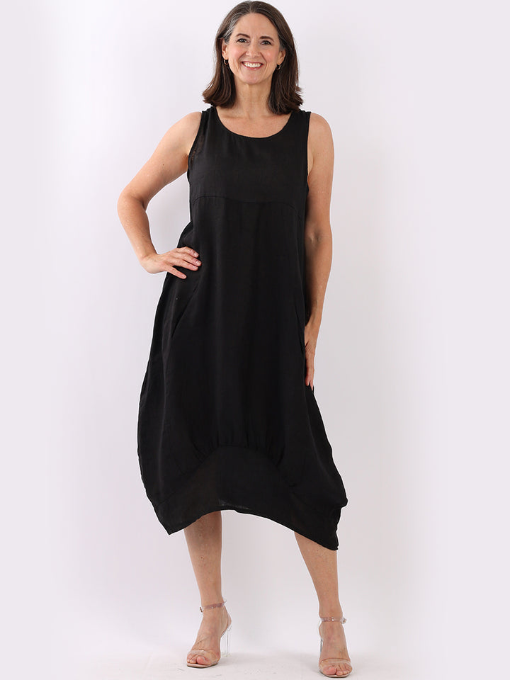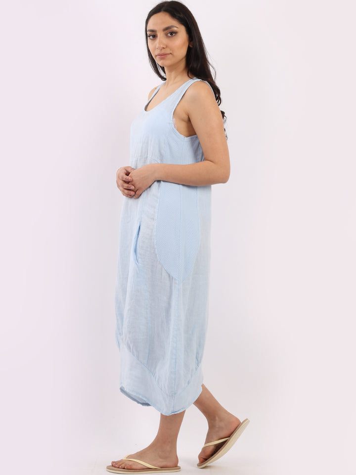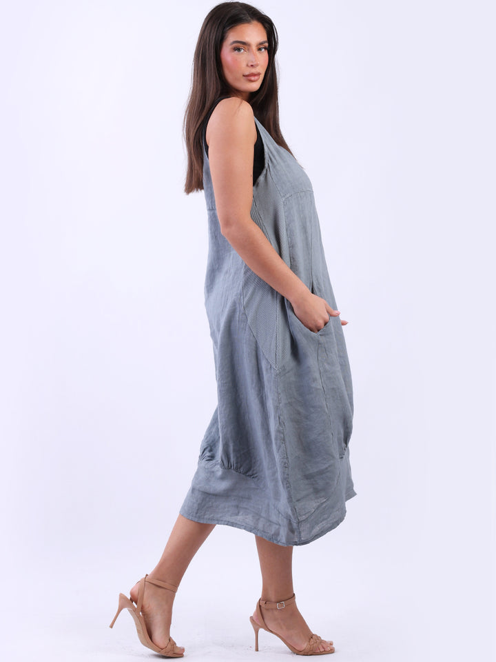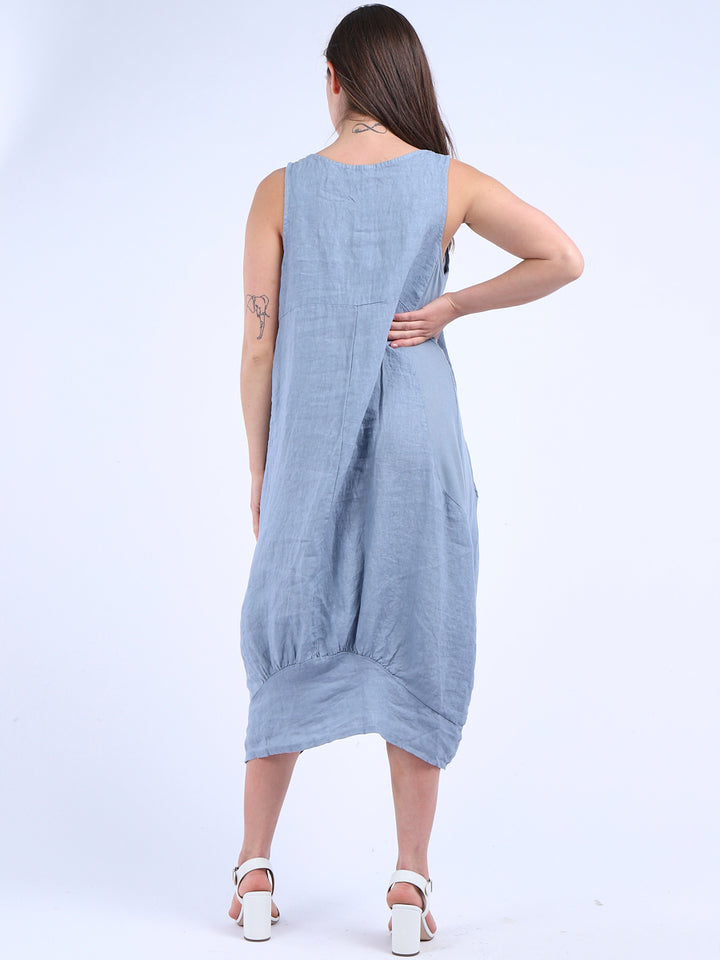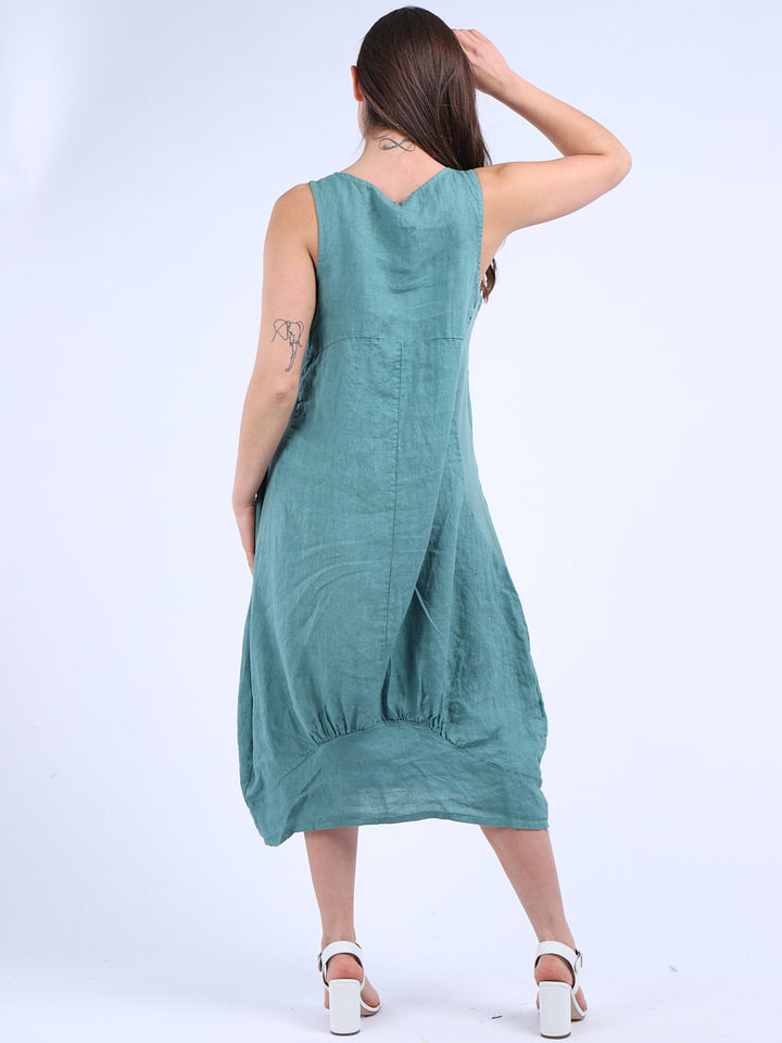 Simplicity and style have been amalgamated to craft this lagenlook dress. Deep scoop neck and sleeveless design makes it apt for the summer vibes. Tailored in single color it brings elegance and exhibits a chic look. Team it with sandals to remain comfortable and stylish.
