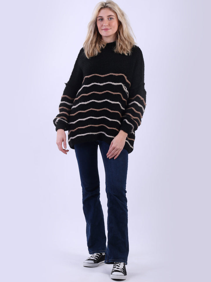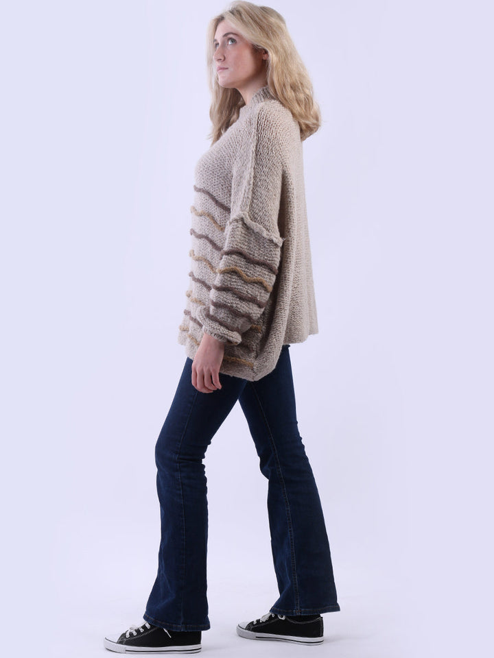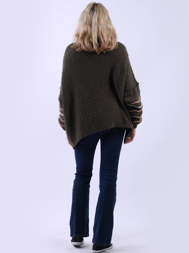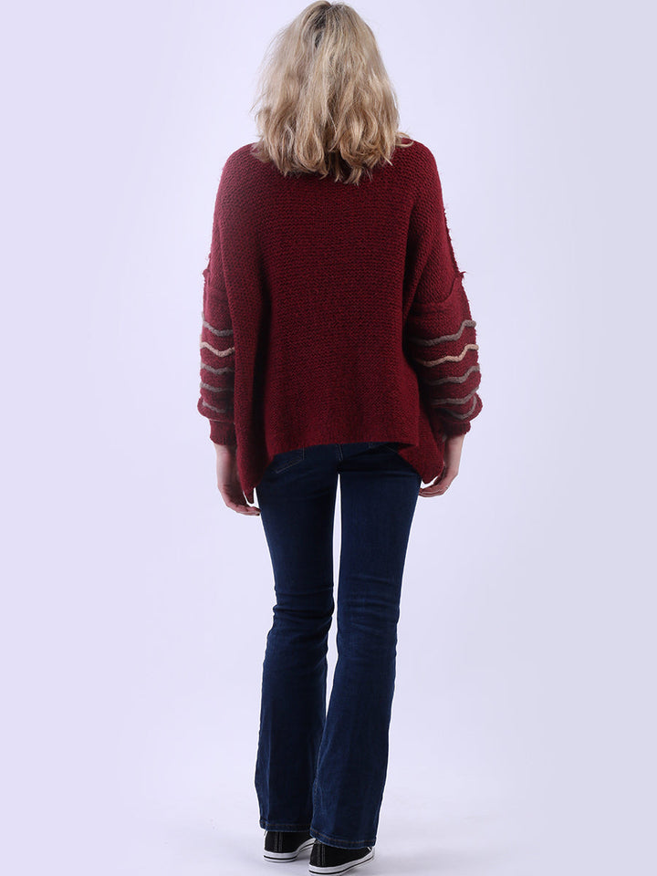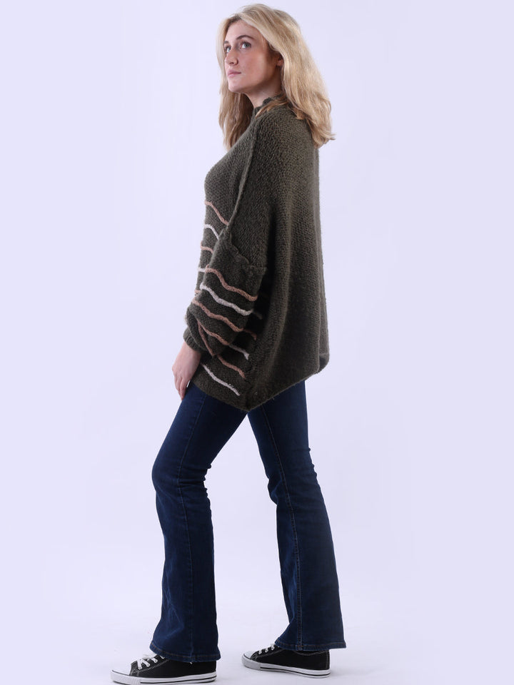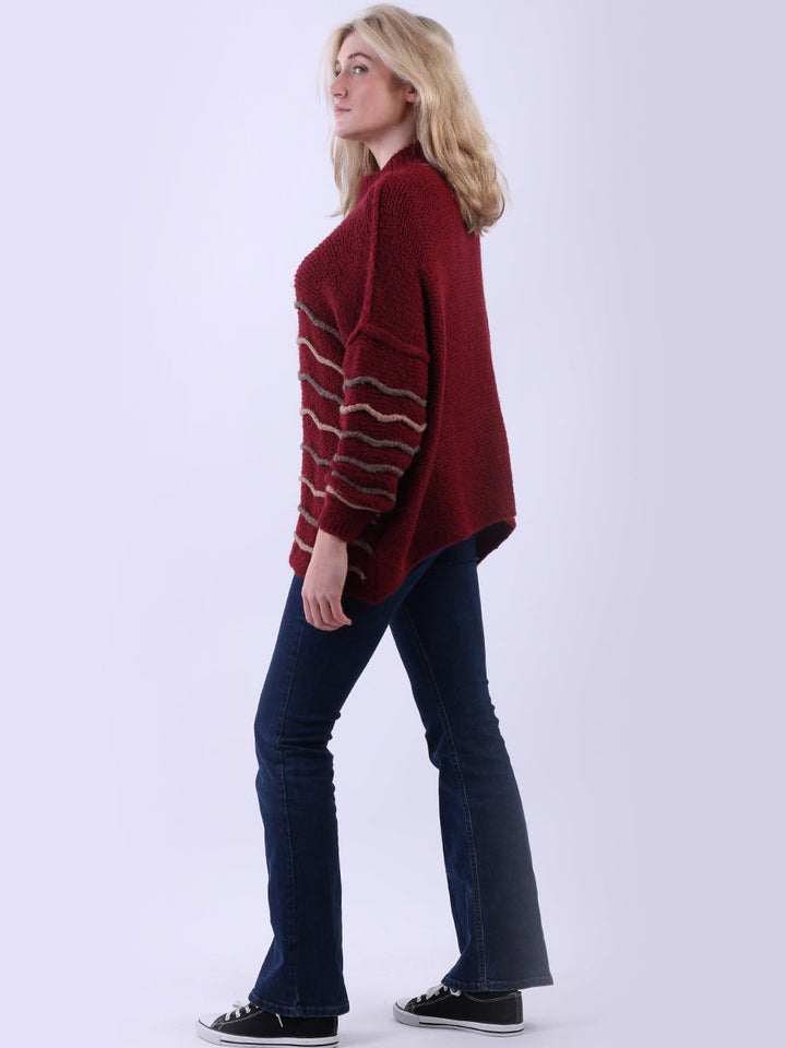 For women who prefer a relaxed, festive style, this wool-knit batwing sweater with soft, earthy stripes is a perfect choice. The cosy knit and versatile design make it suitable for layering or lounging by the fire. This piece is a timeless addition to any winter wardrobe.