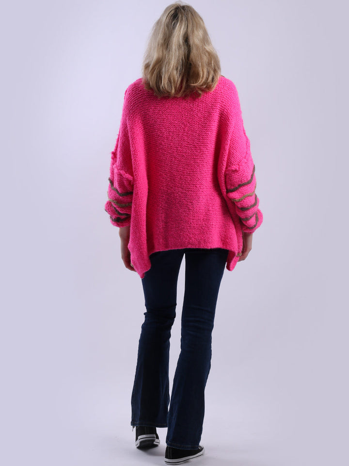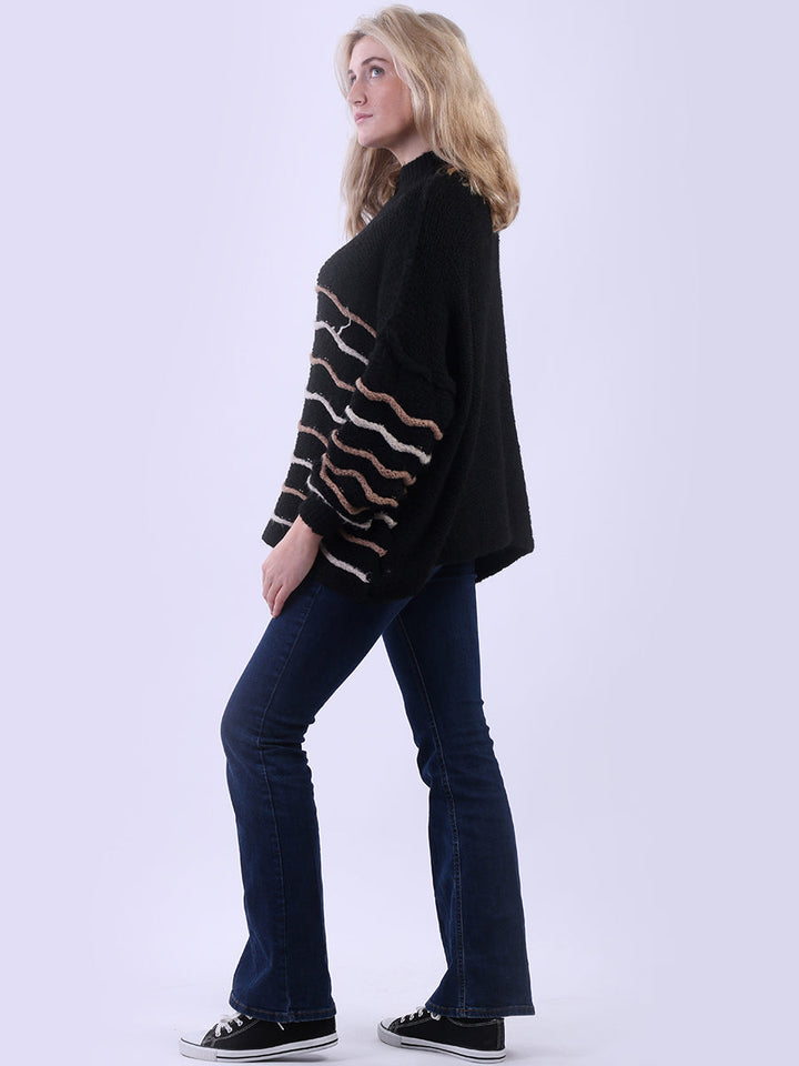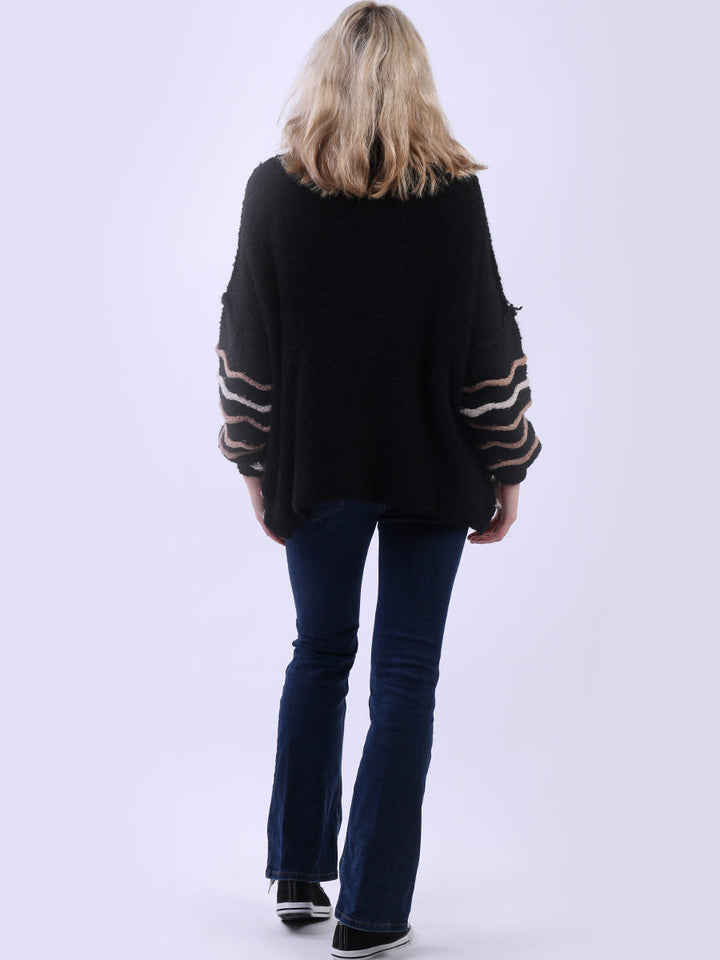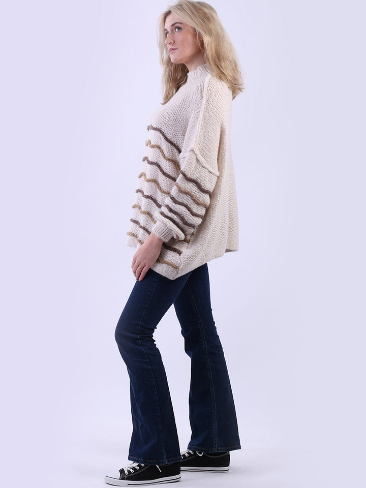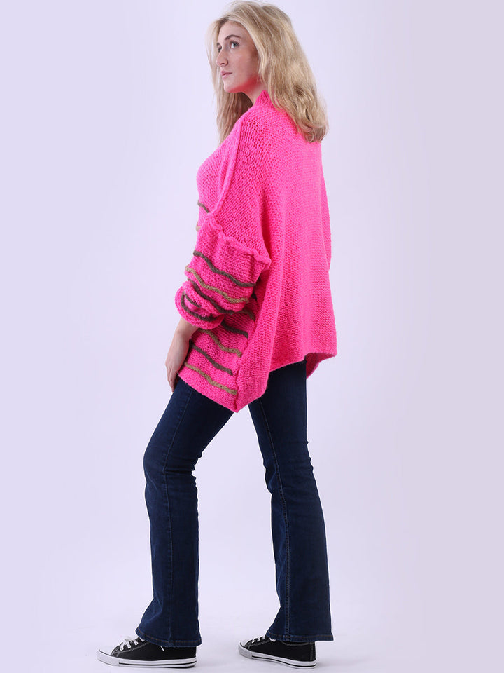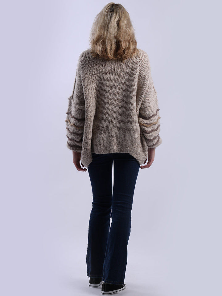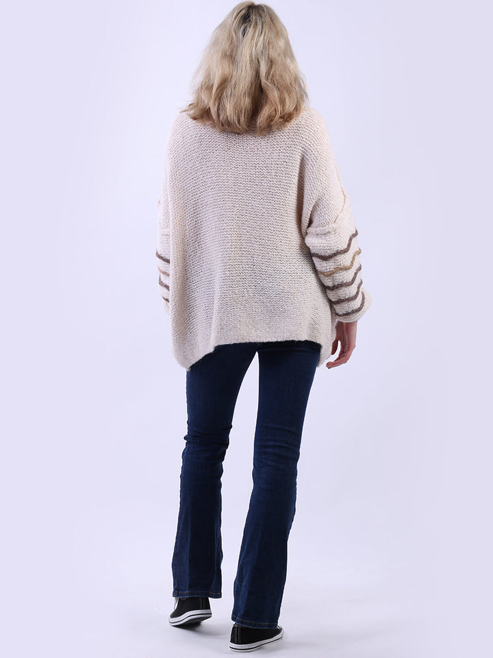 For women who prefer a relaxed, festive style, this wool-knit batwing sweater with soft, earthy stripes is a perfect choice. The cosy knit and versatile design make it suitable for layering or lounging by the fire. This piece is a timeless addition to any winter wardrobe.