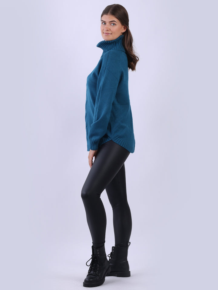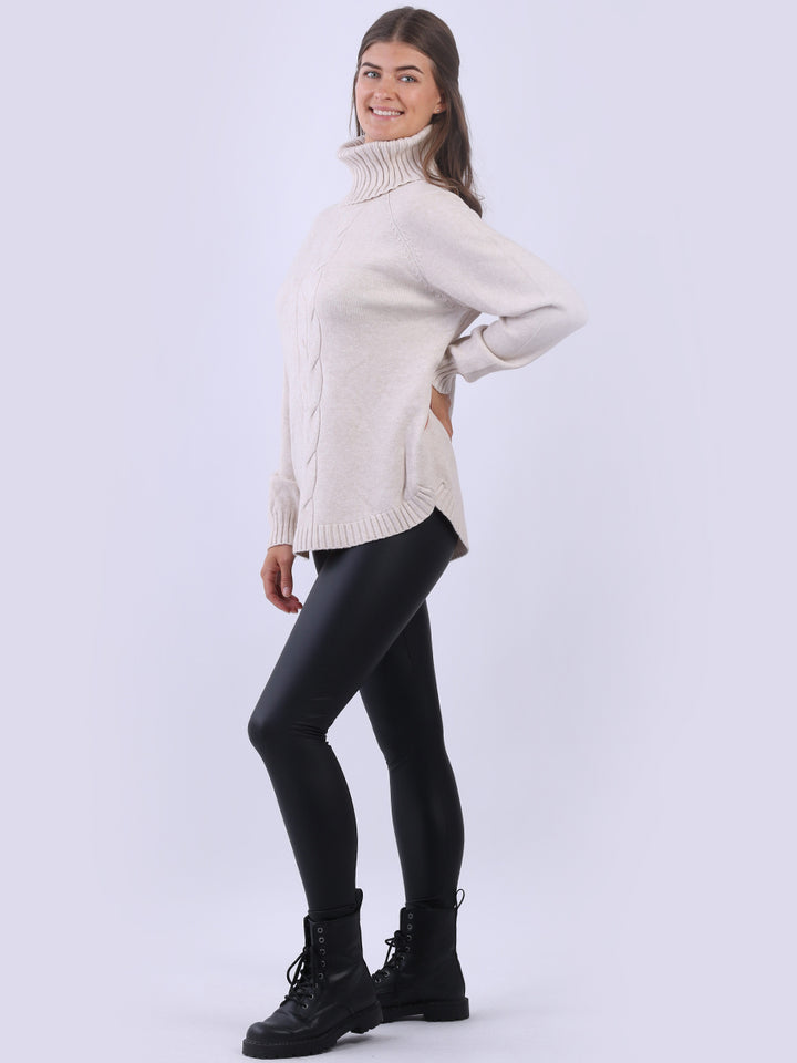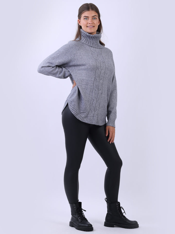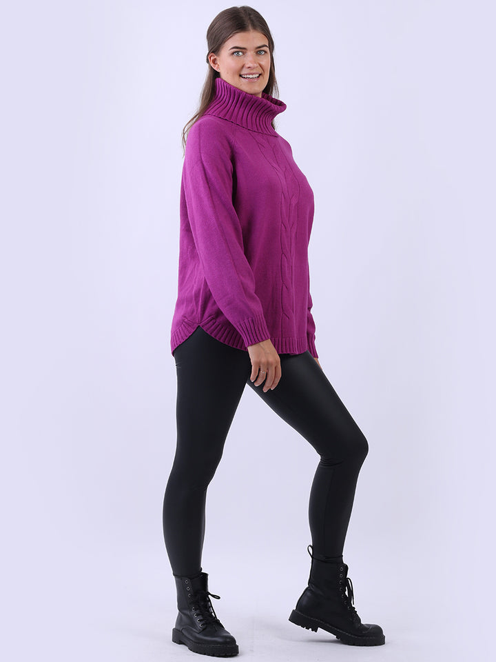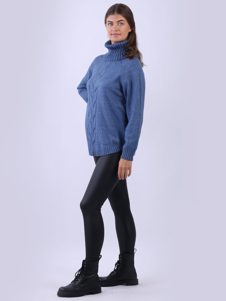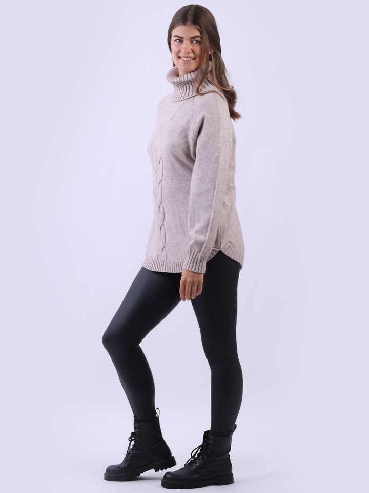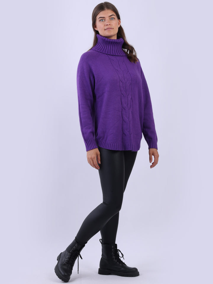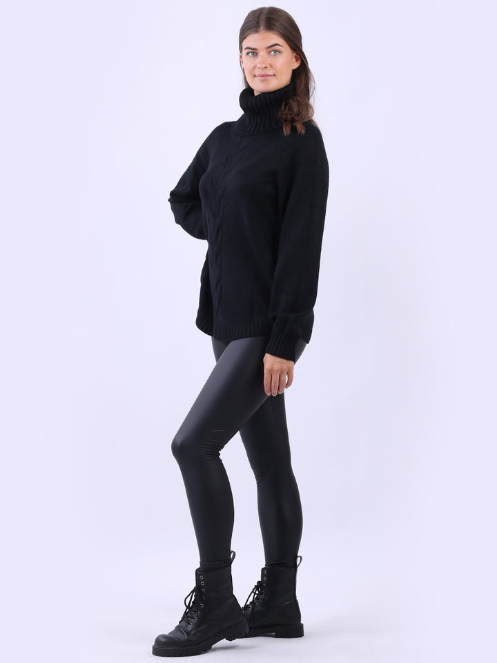 Slouchy and snuggly this is ideal fluff that will add glamor and character to the final look. Posh looking polo neckline, stunning cable knit pattern, drop shoulders and rounded edges gives it a sleek finish. Make a bold and confident statement with leather pants and long boots.