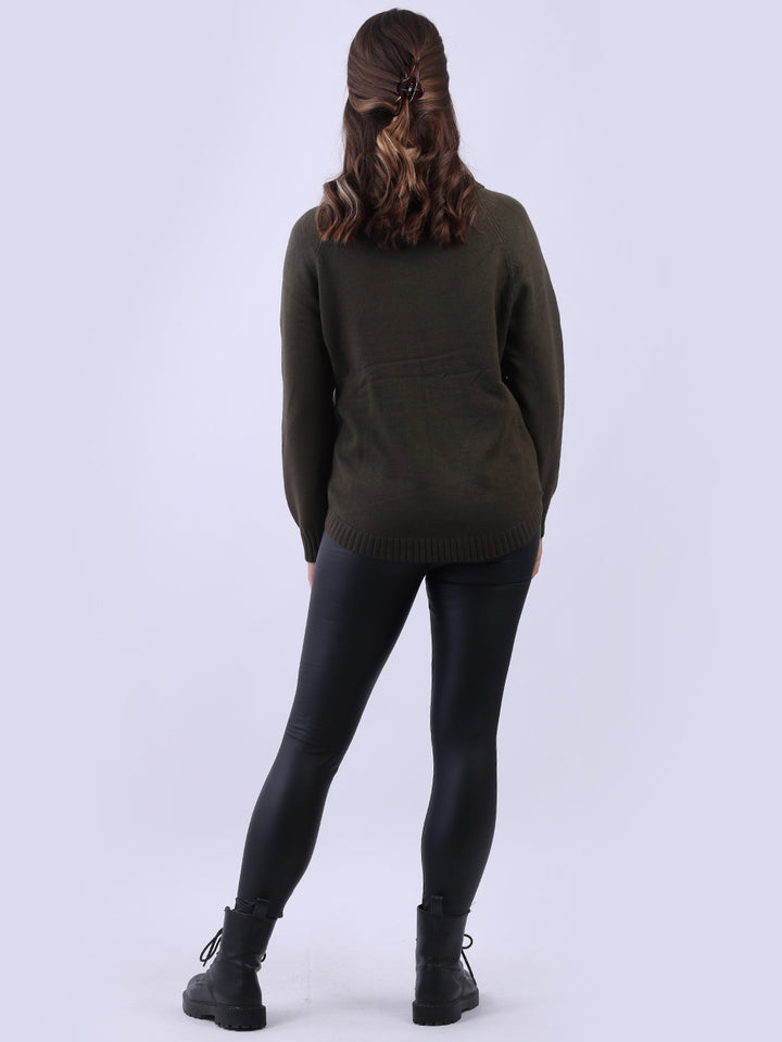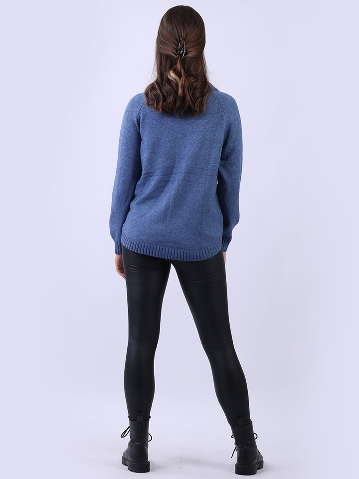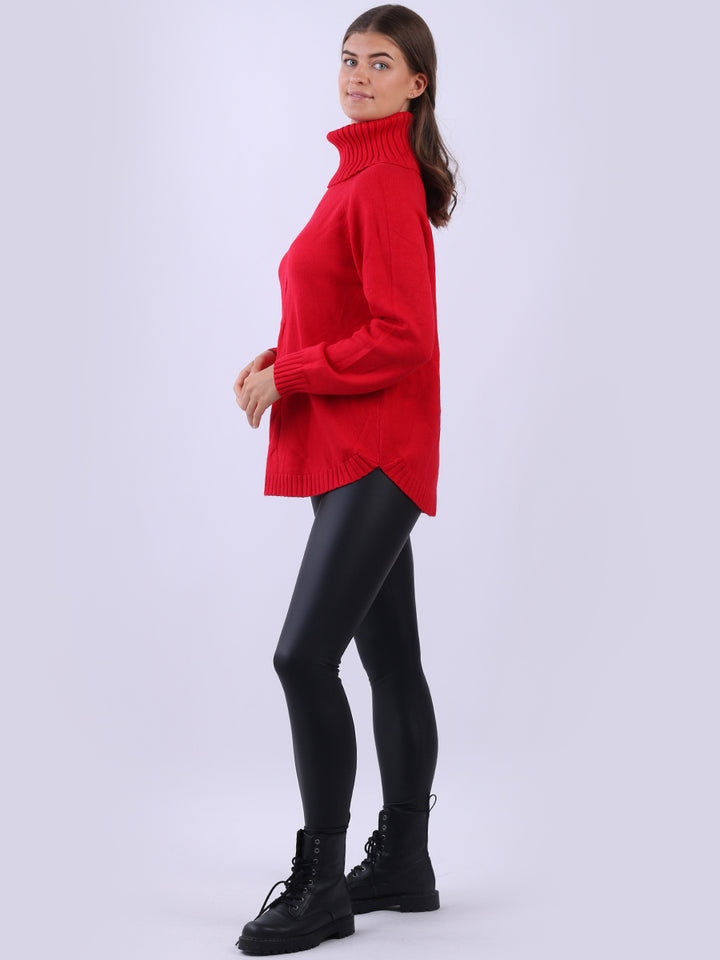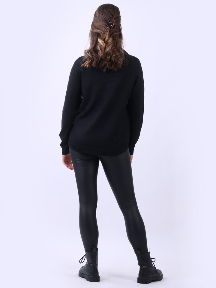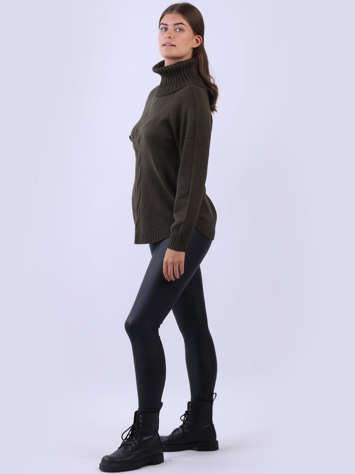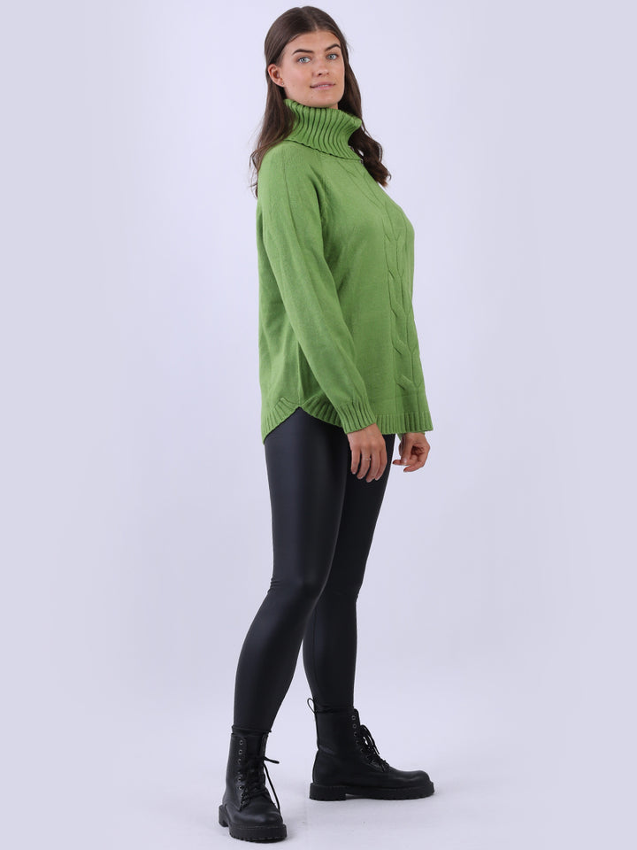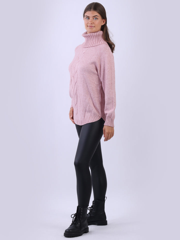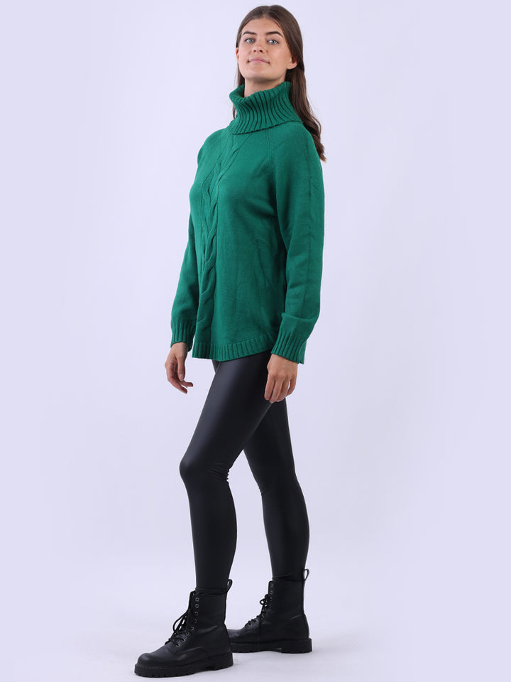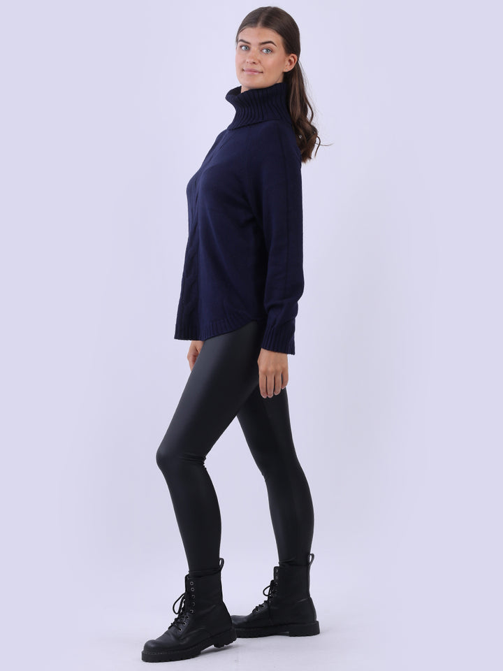 Slouchy and snuggly this is ideal fluff that will add glamor and character to the final look. Posh looking polo neckline, stunning cable knit pattern, drop shoulders and rounded edges gives it a sleek finish. Make a bold and confident statement with leather pants and long boots.