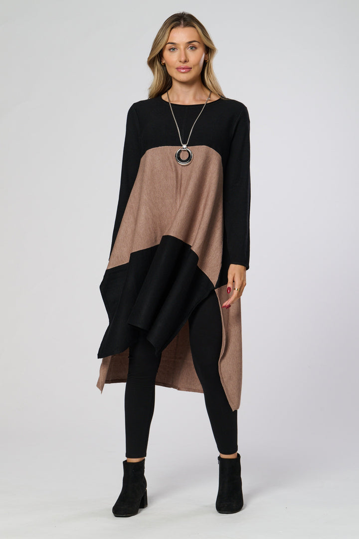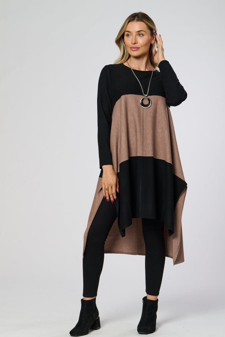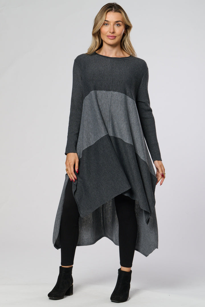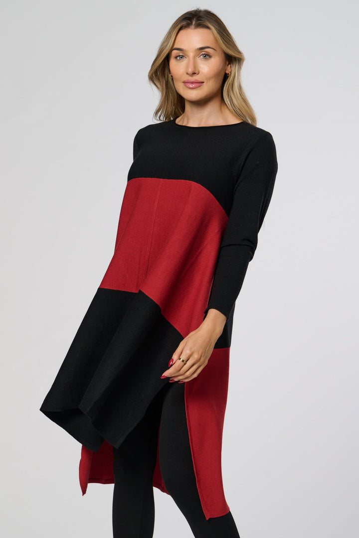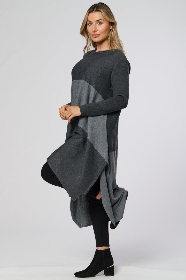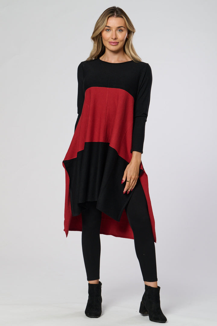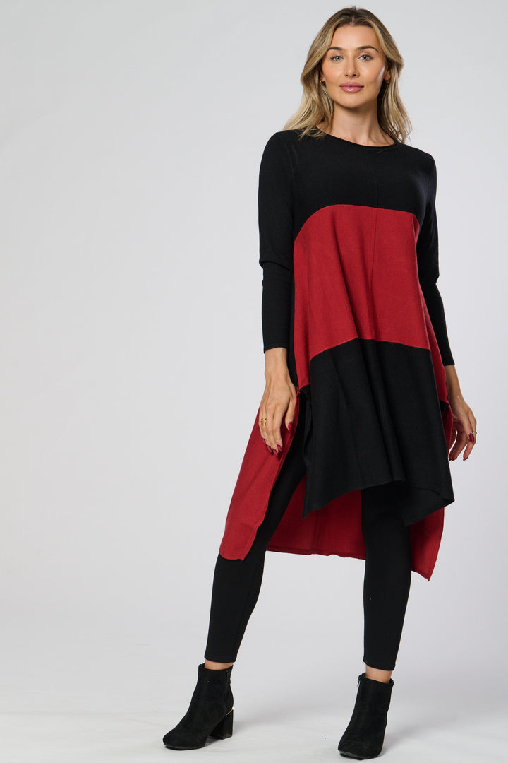Long, block stripe knitted dress featuring long sleeves and high-low hemline.