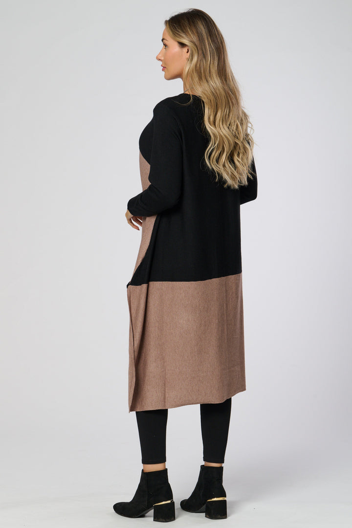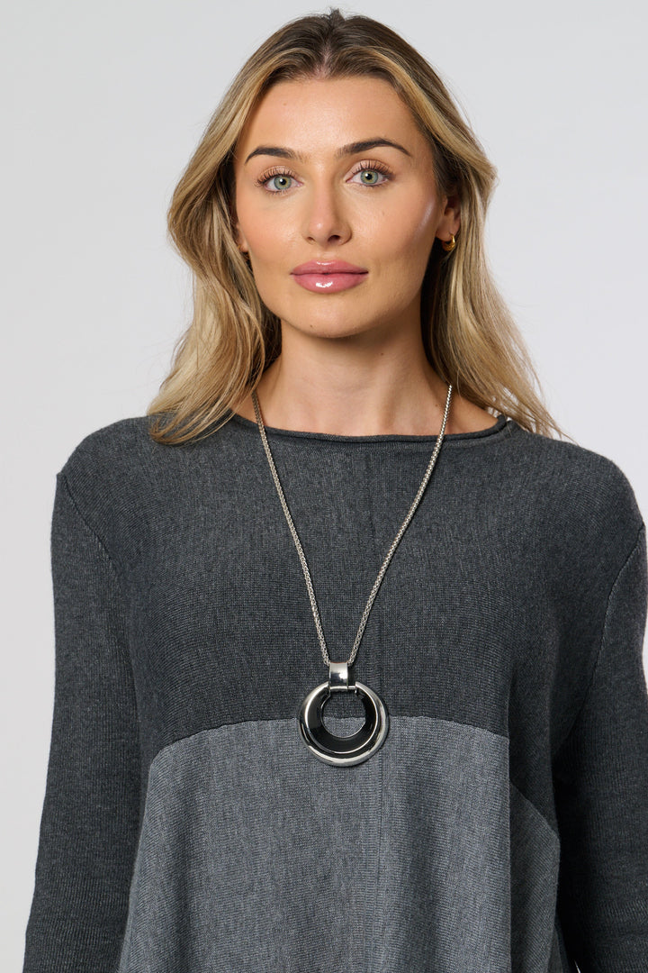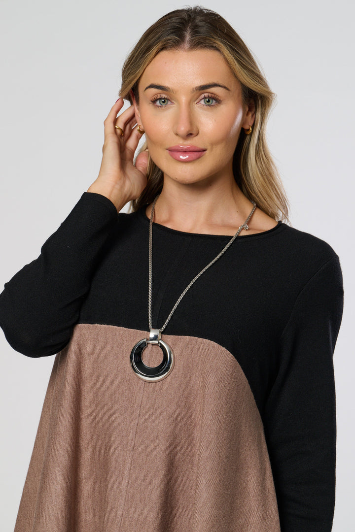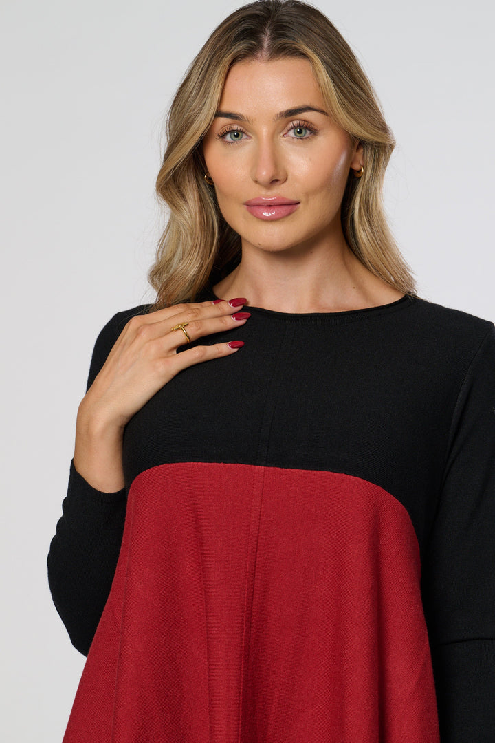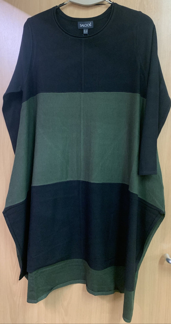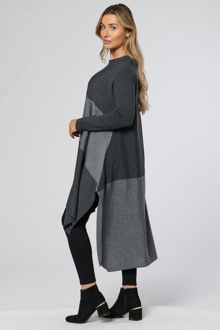 Long, block stripe knitted dress featuring long sleeves and high-low hemline.