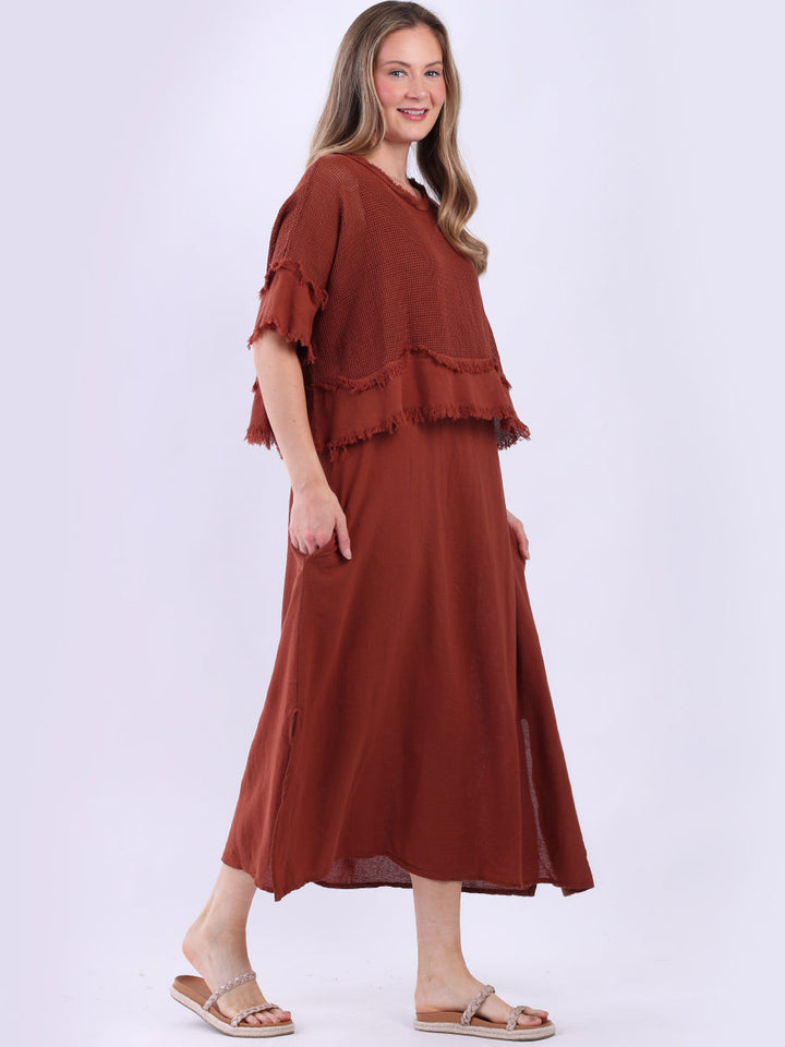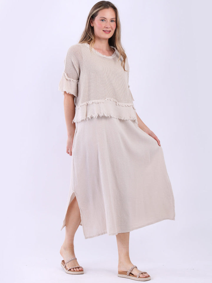 This made-in-Italy lagenlook 2 layered mesh net cotton dress is perfect for women who love to blend seasonal tones with playful details. Featuring mesh net bodice, raw edges, side slits and bell sleeves this dress is ideal for layering with cardigan or a light jacket as the fall approaches.