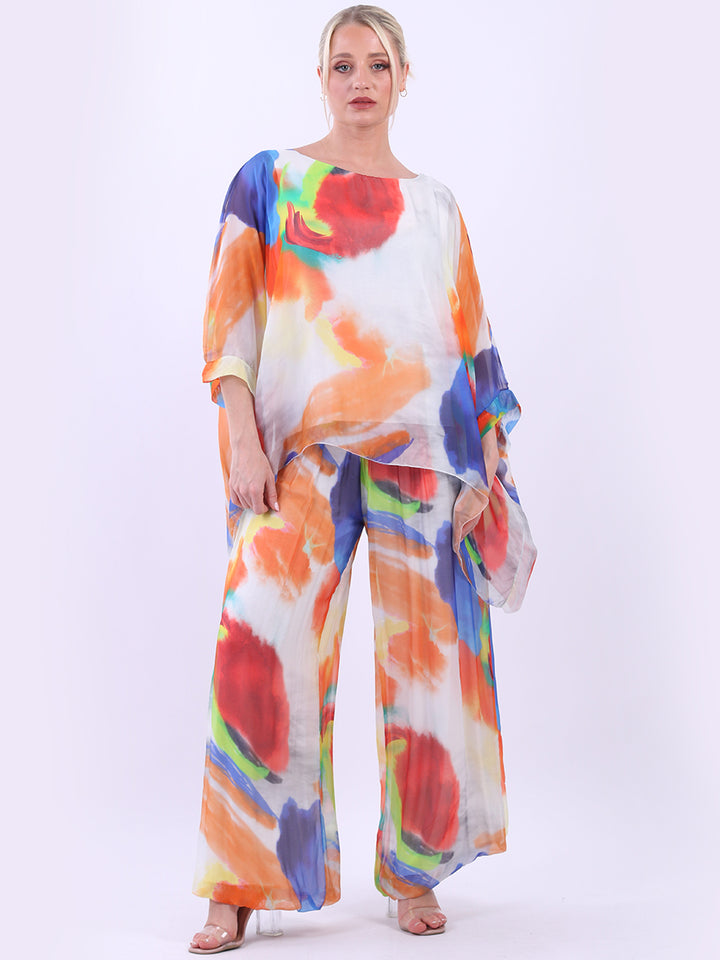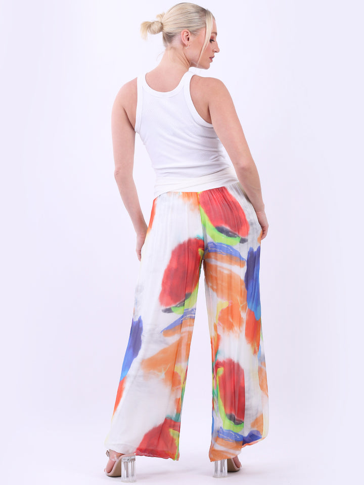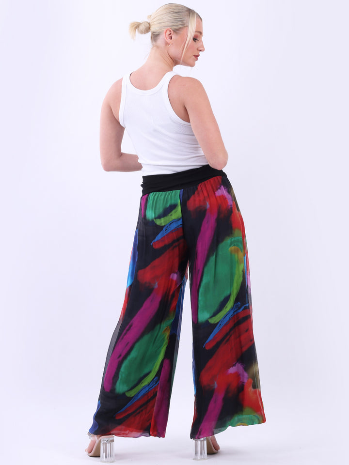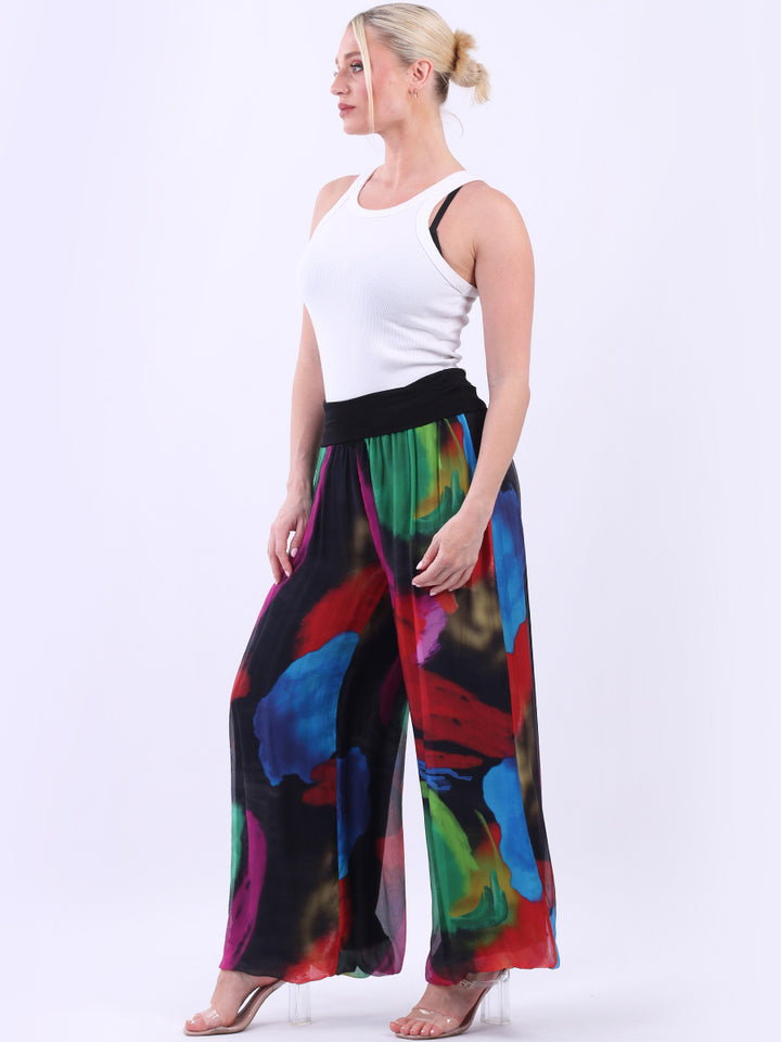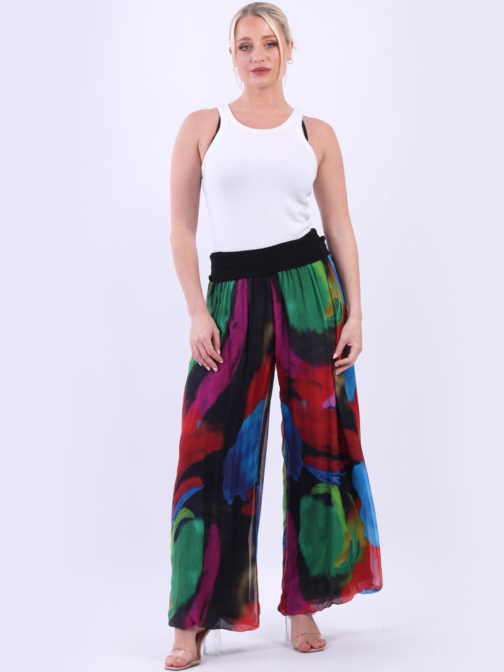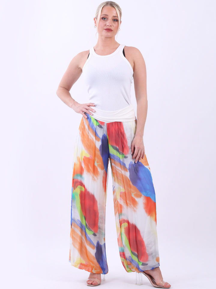 Vibrant and full of life with all the right styles that appeal to women wearers. Made in Italy with soft fabric blend the two layer palazzos are luxurious silk with classy tie and dye print, wide elastic waist band and wide leg finish. Layer with tank top and cotton cardigan by Redwholesale London.