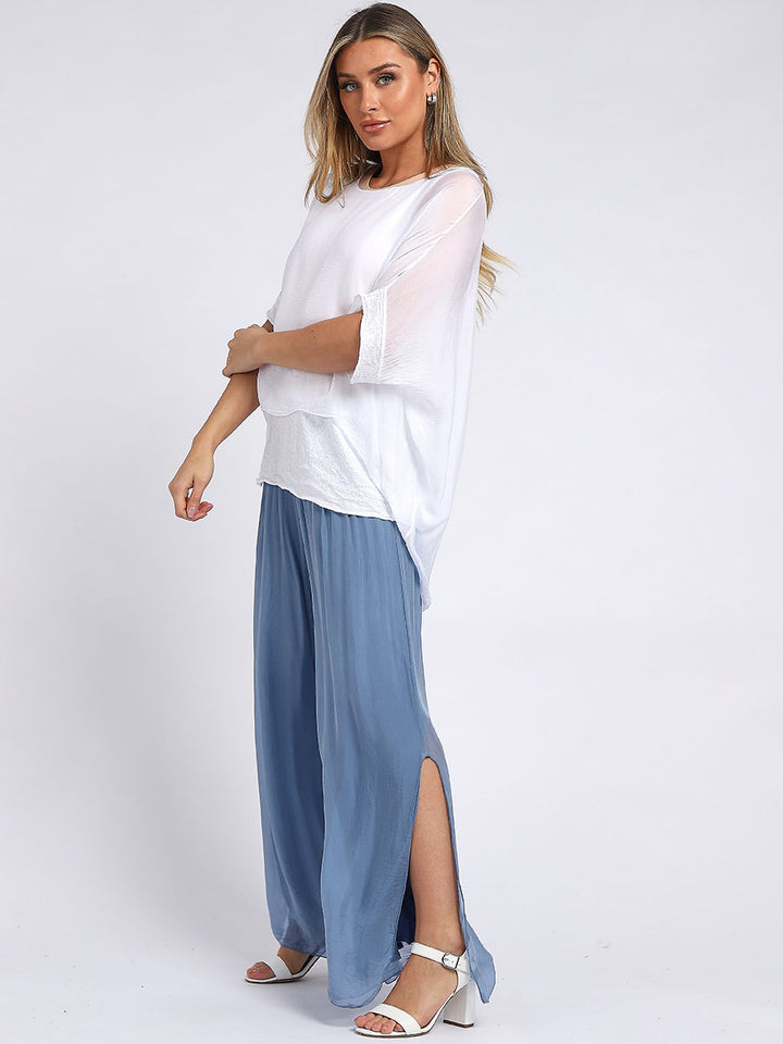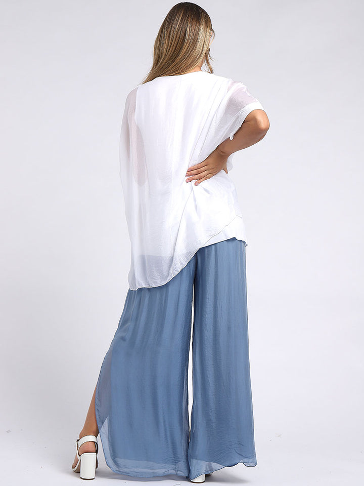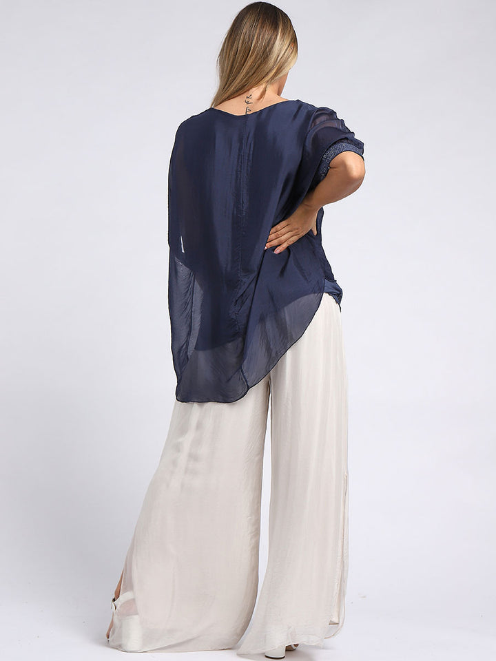 The beauty, luxury and sensuality of silk is a universal truth that none dares to defy! Women wearers first and foremost love is grace of silk with Redwholesale designed top is rich ok comforting features like plunging scoop neckline, baggy sleeves with sequin arms and under layer, dip hem and lagenlook fit. This goes perfect with sequin pants with shimmer for a perfect night out.