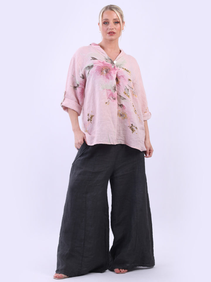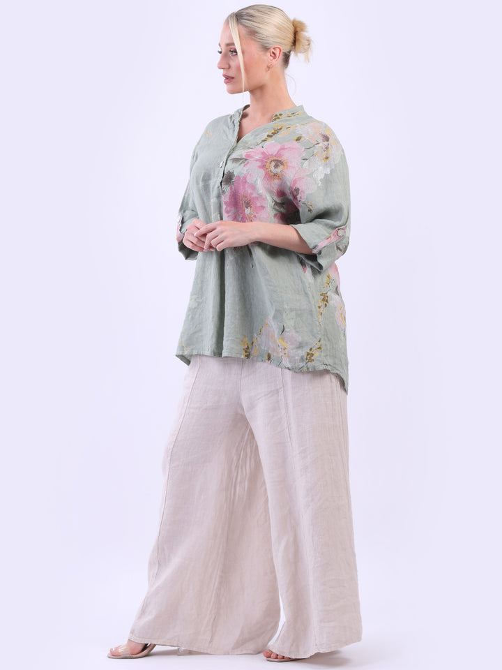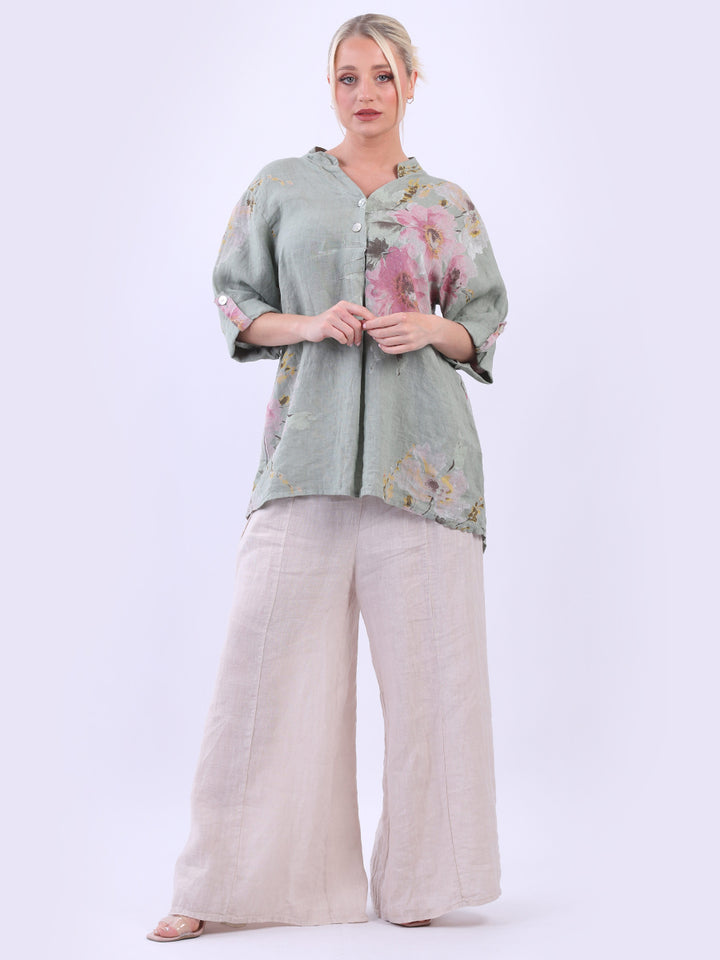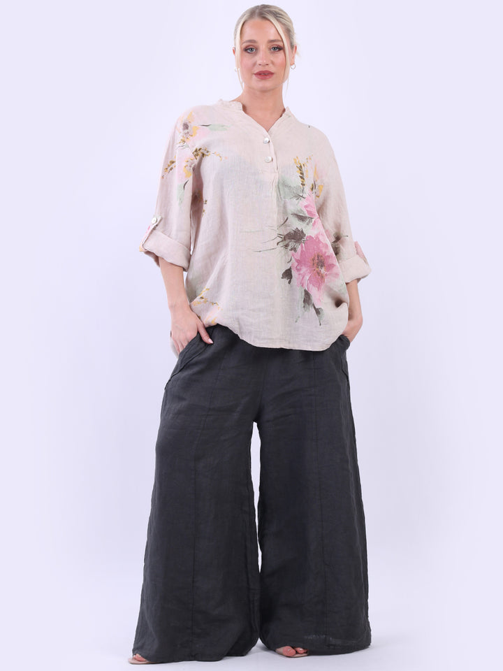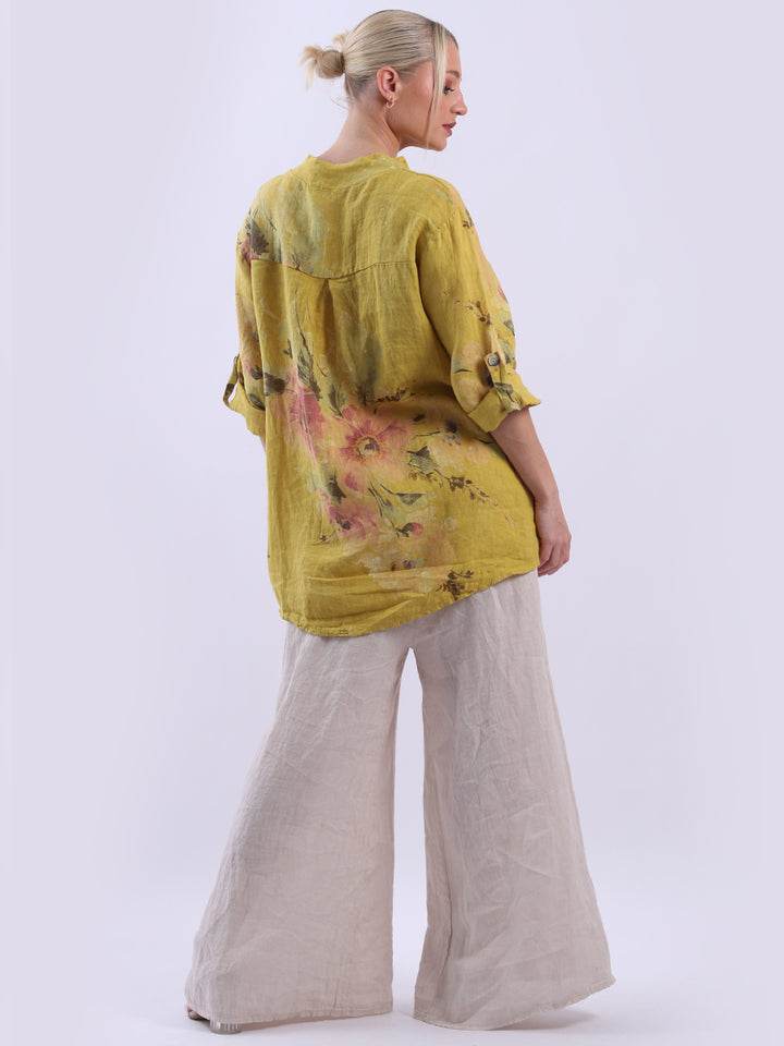 Attractive and ideal this classy looking fine linen top has all the right features that women wearers adore. Made in Italy with finest linen that is soft on skin and silk like the top has botanical fresh floral print, mandarin neckline with front button detailing, long rolled up sleeves and baggy plus size fit. Wear it as over all or as is with capri for chic finish