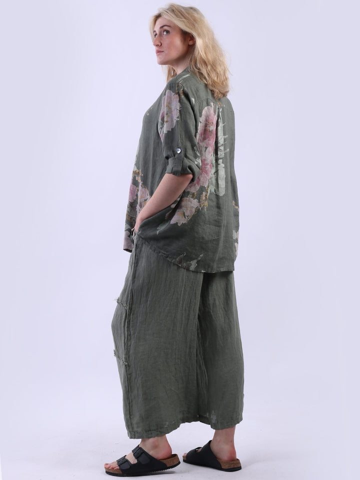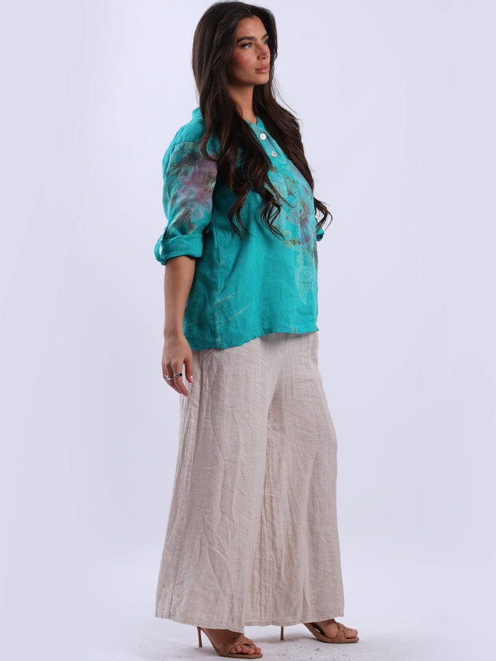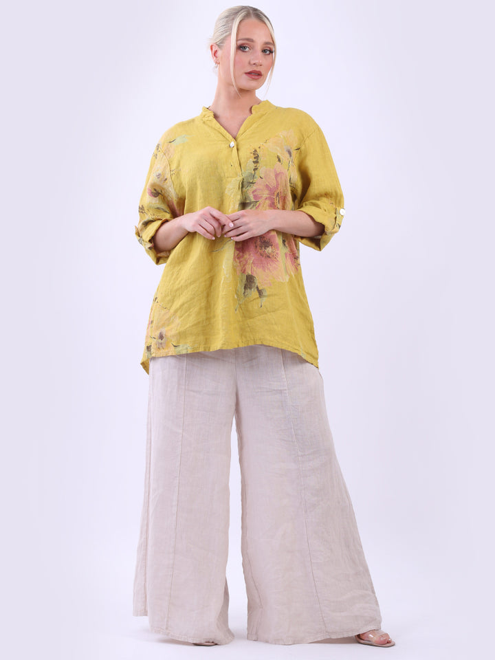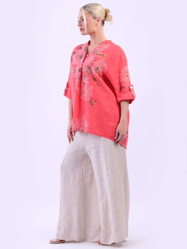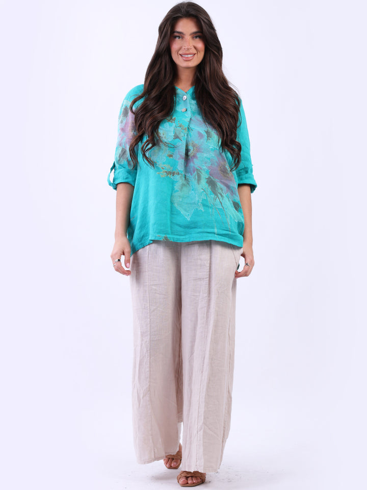 Attractive and ideal this classy looking fine linen top has all the right features that women wearers adore. Made in Italy with finest linen that is soft on skin and silk like the top has botanical fresh floral print, mandarin neckline with front button detailing, long rolled up sleeves and baggy plus size fit. Wear it as over all or as is with capri for chic finish