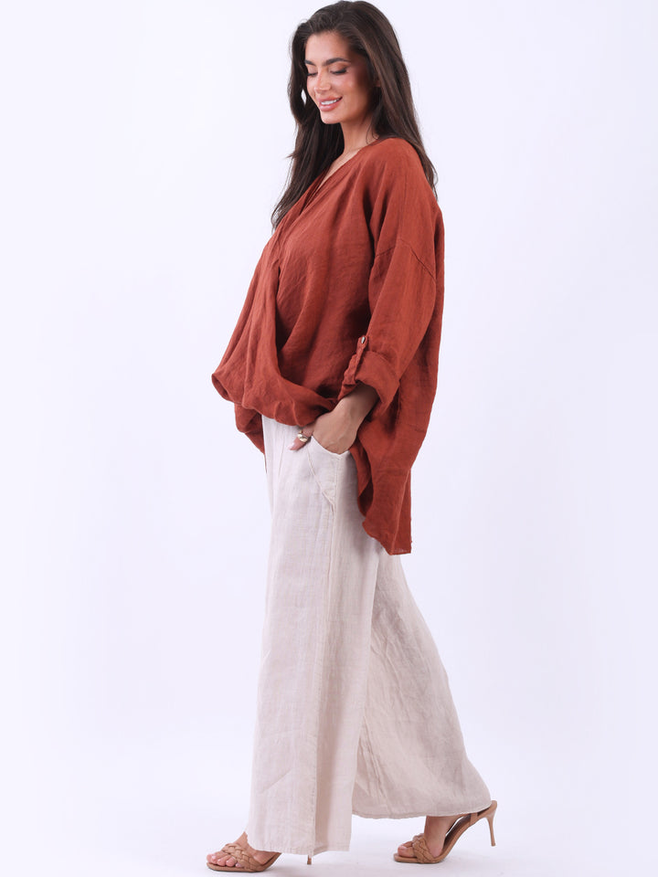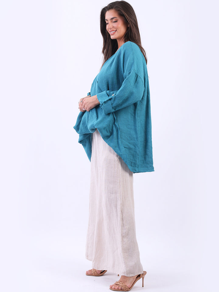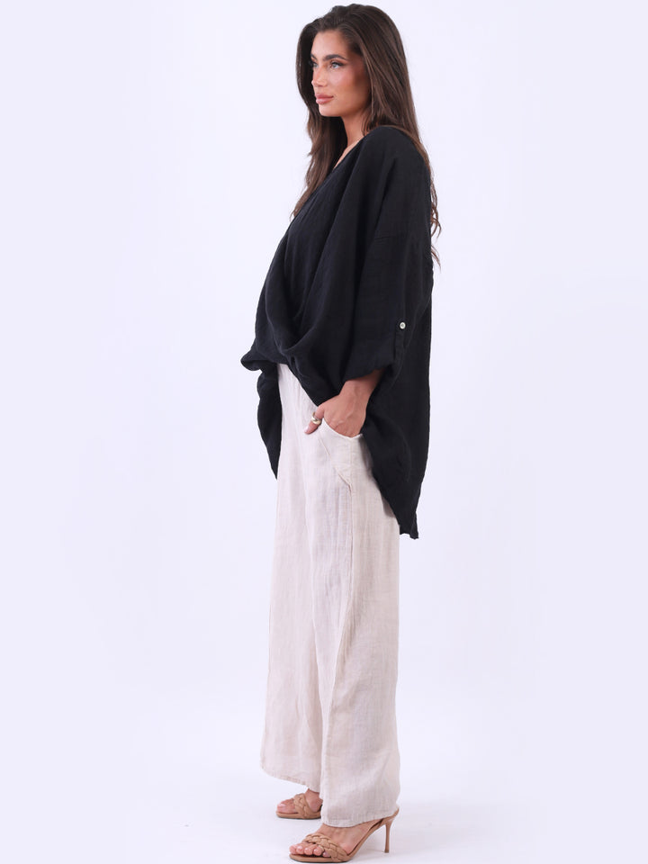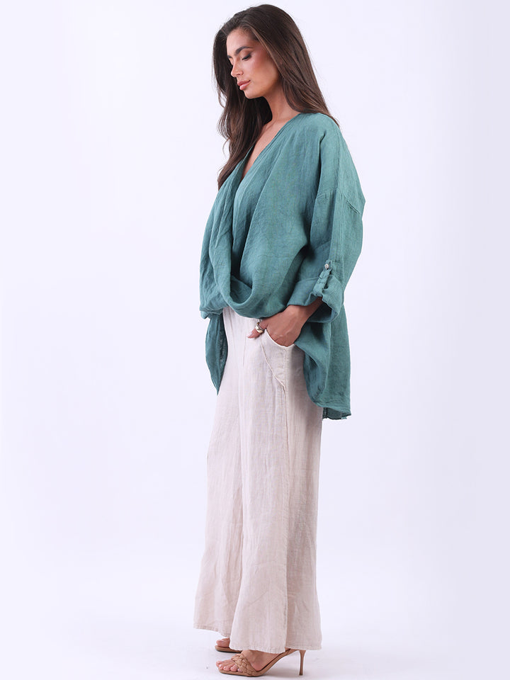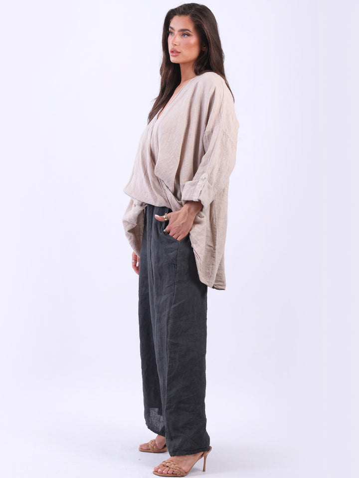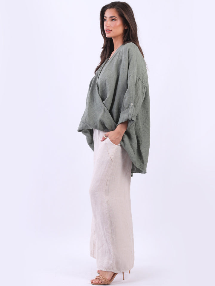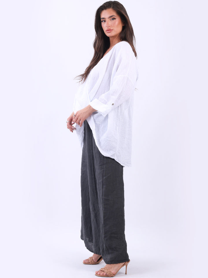 Perfect and ideal for summer and spring this is the look that will make women wearers love dressing up. Made in Italy with finest linen the top has lush V-neckline, baggy plus size and button up sleeves. The top can be used as layering or be worn as is with leather pants and boots for a chic finish.