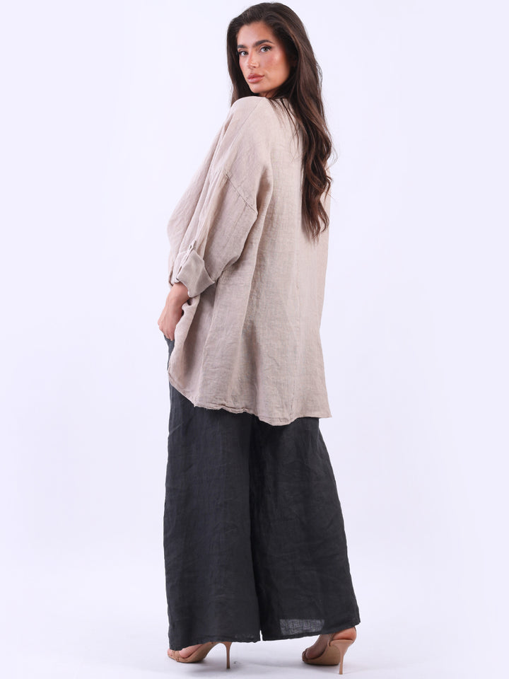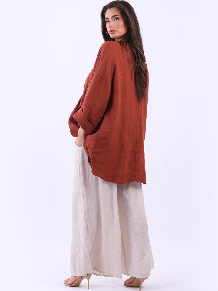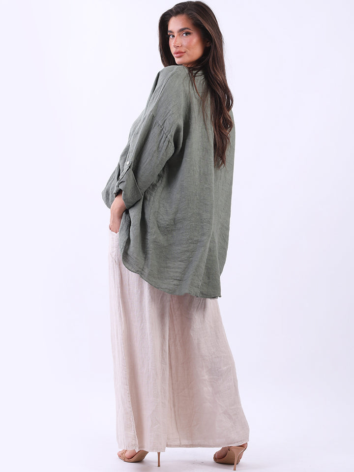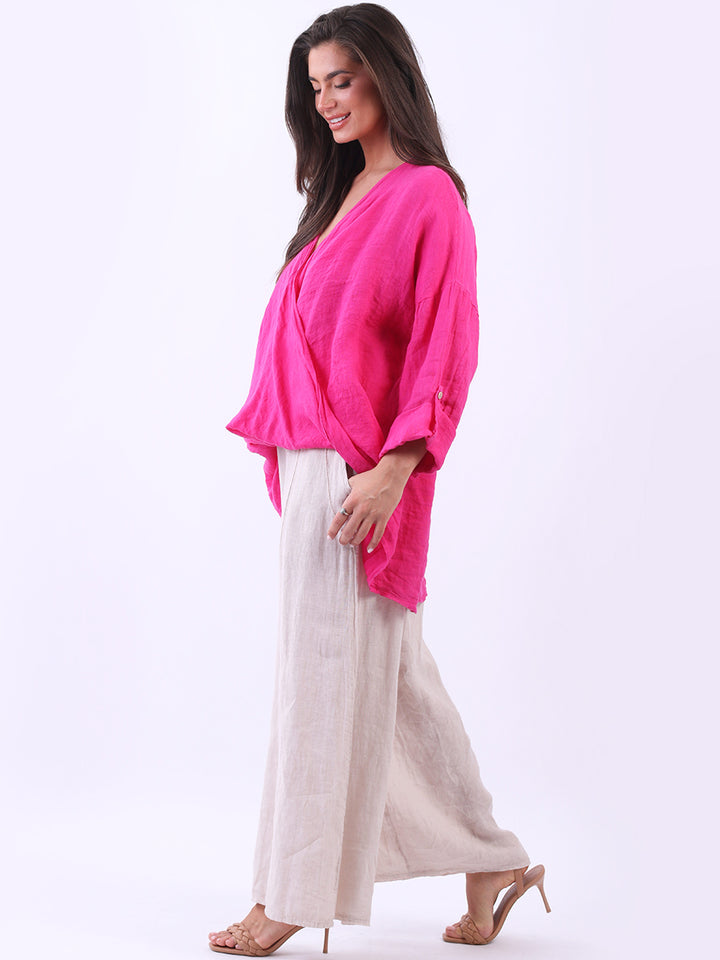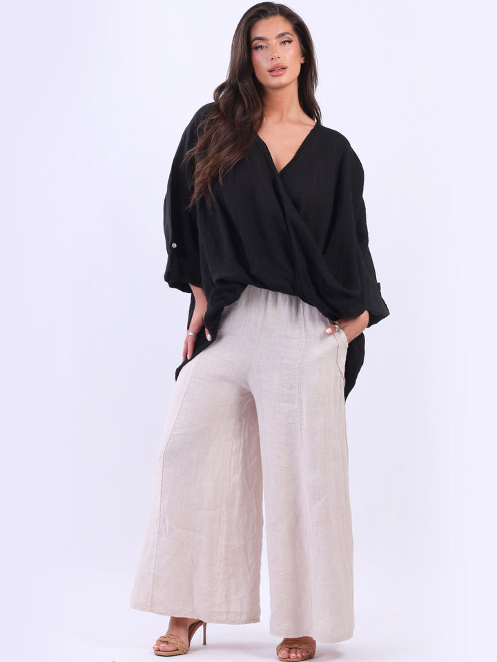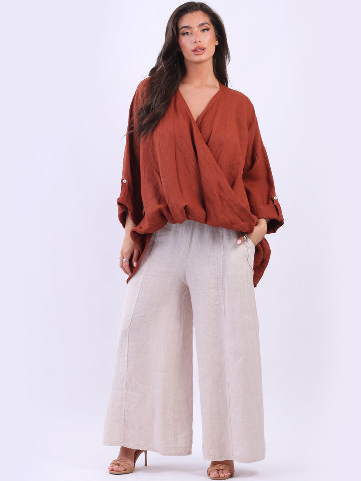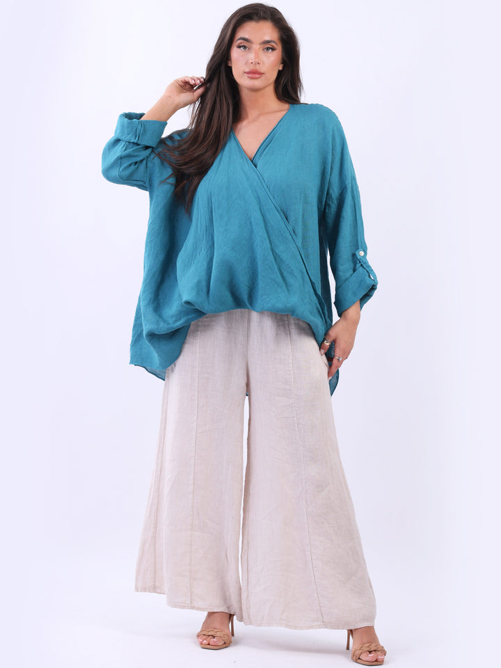 Perfect and ideal for summer and spring this is the look that will make women wearers love dressing up. Made in Italy with finest linen the top has lush V-neckline, baggy plus size and button up sleeves. The top can be used as layering or be worn as is with leather pants and boots for a chic finish.
