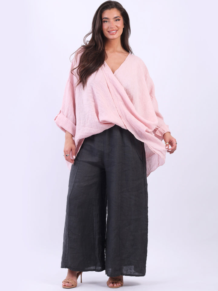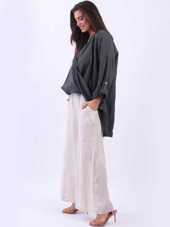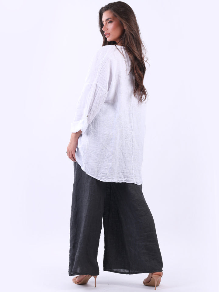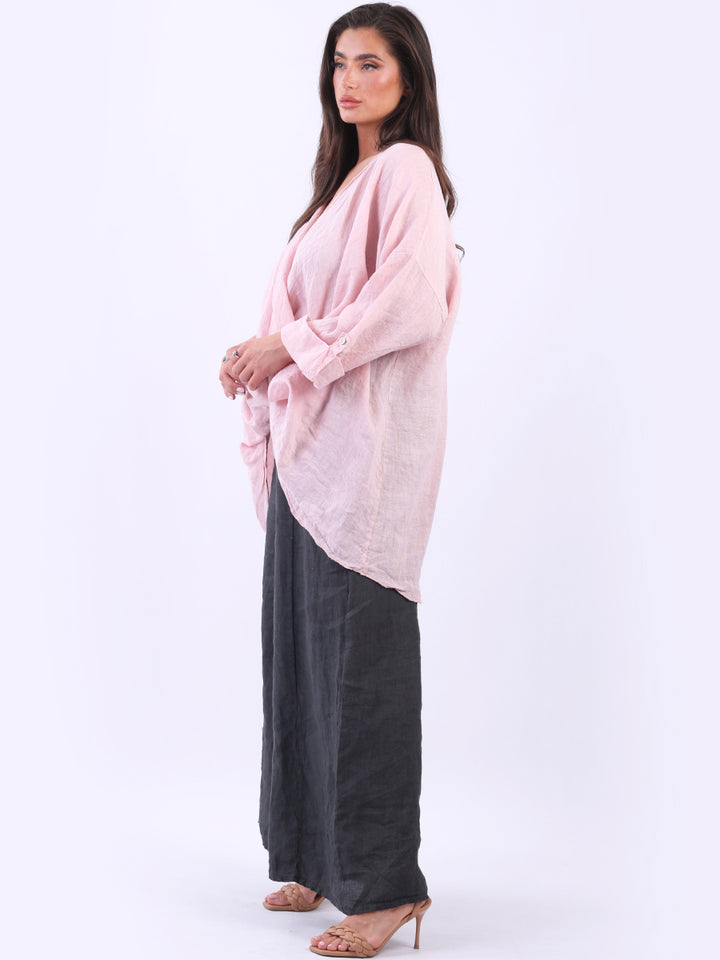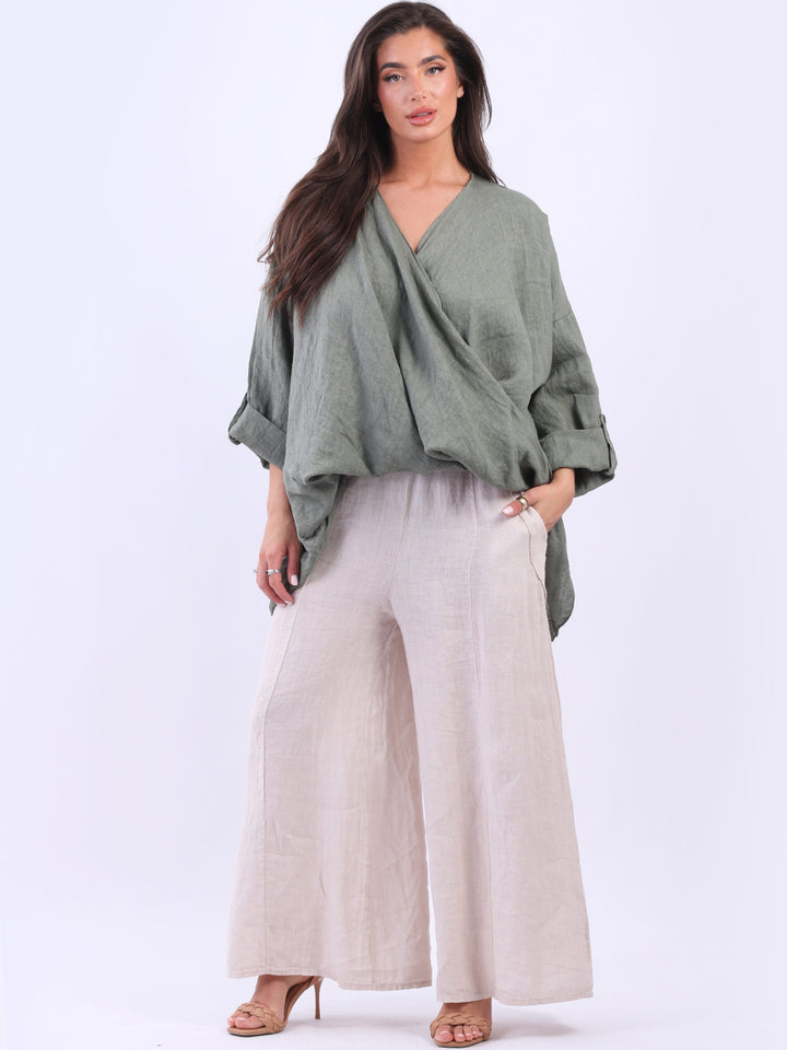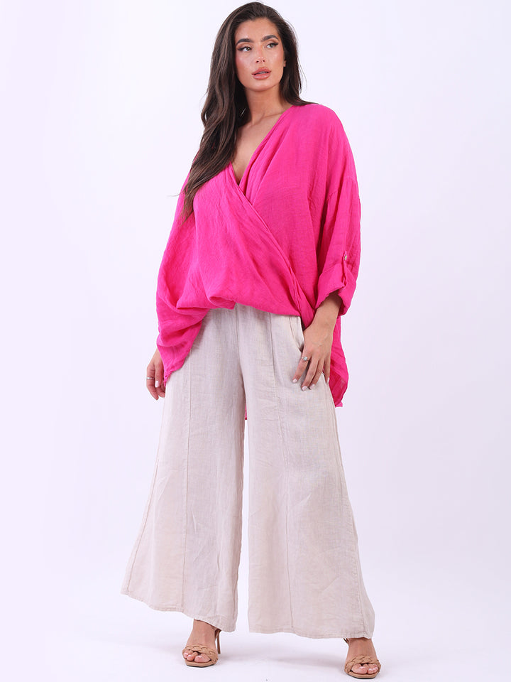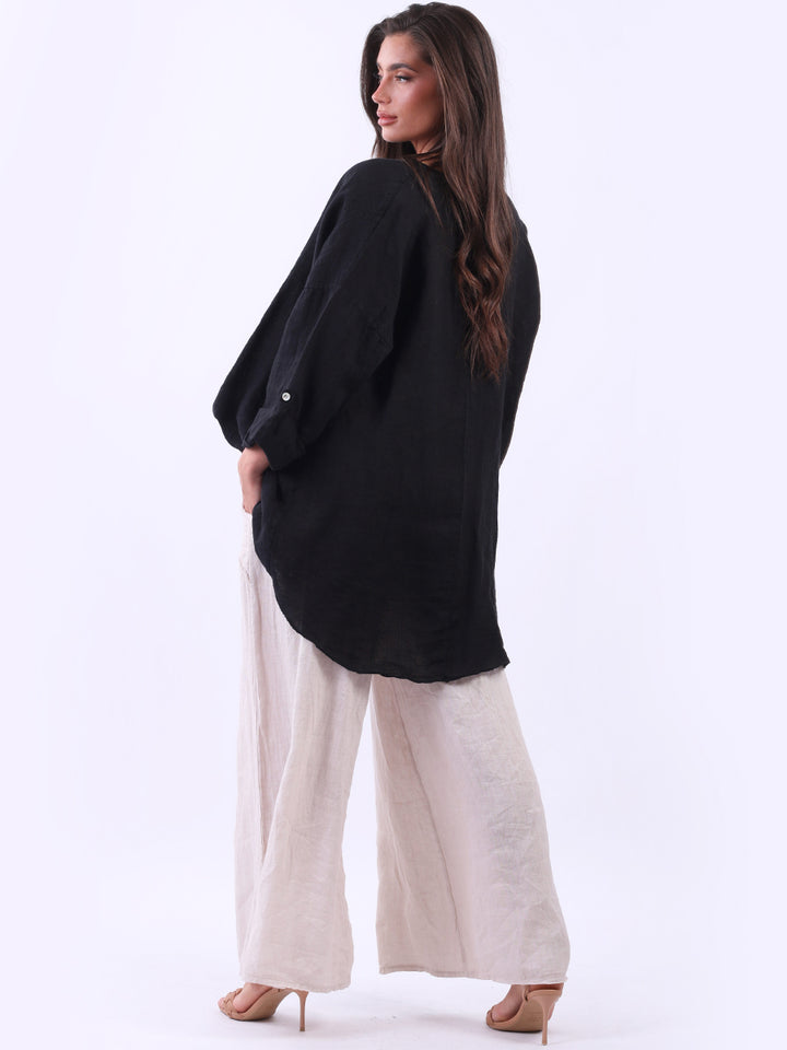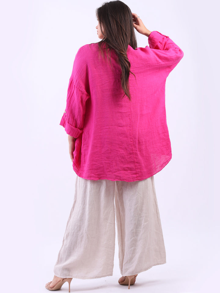 Perfect and ideal for summer and spring this is the look that will make women wearers love dressing up. Made in Italy with finest linen the top has lush V-neckline, baggy plus size and button up sleeves. The top can be used as layering or be worn as is with leather pants and boots for a chic finish.