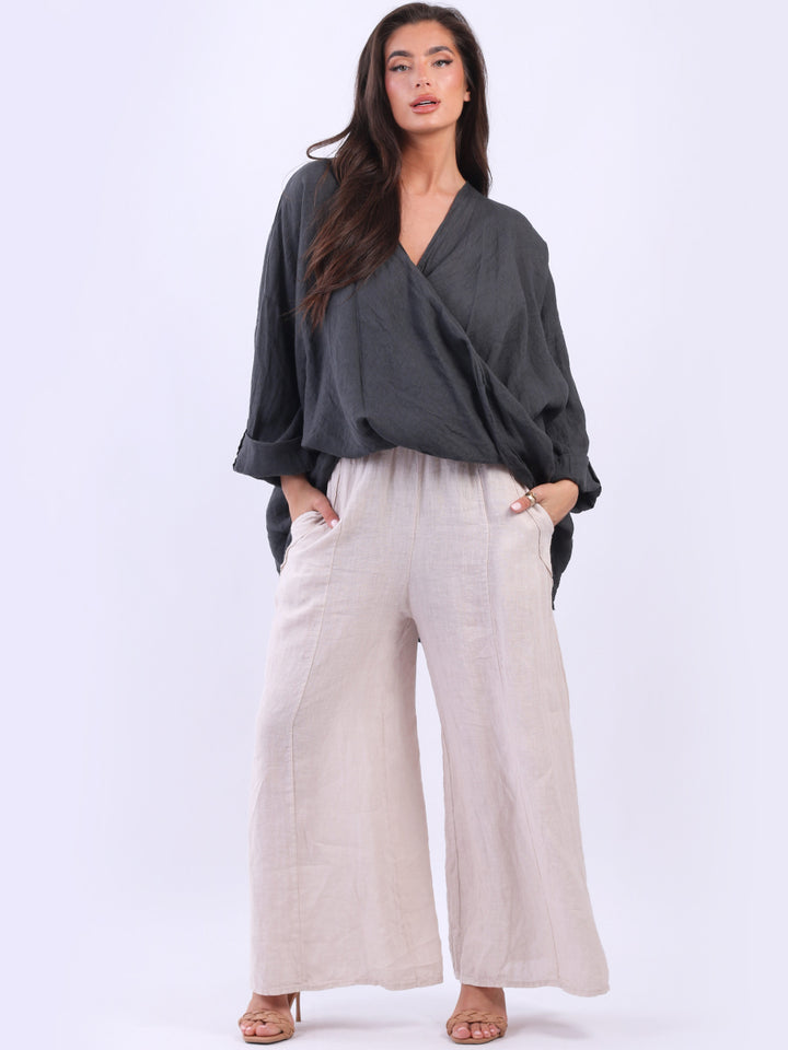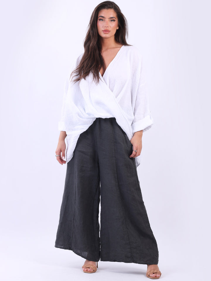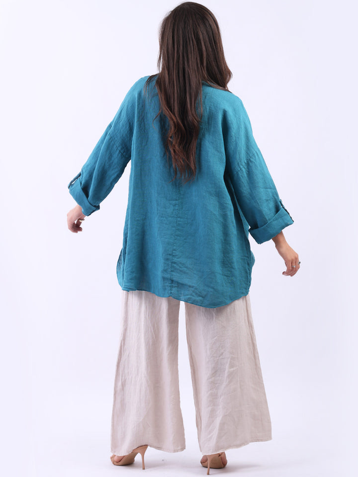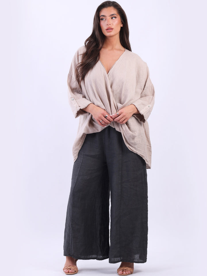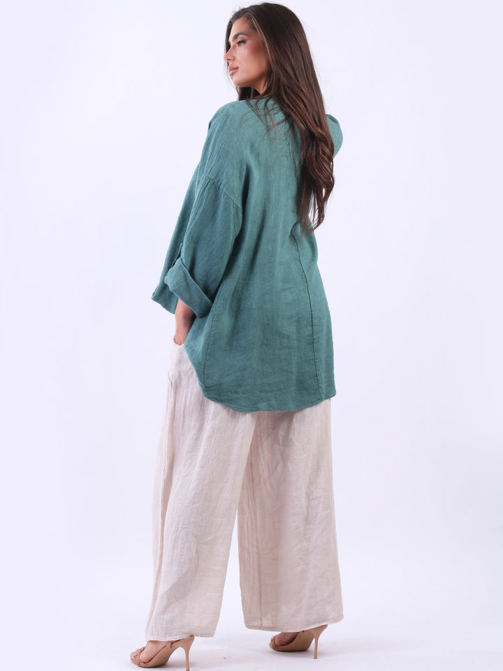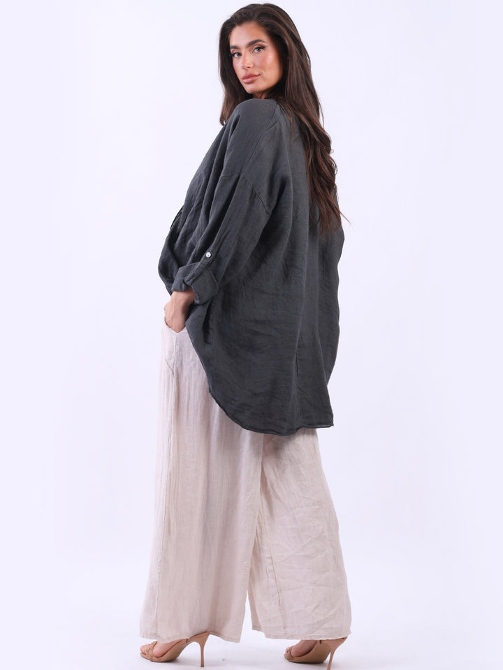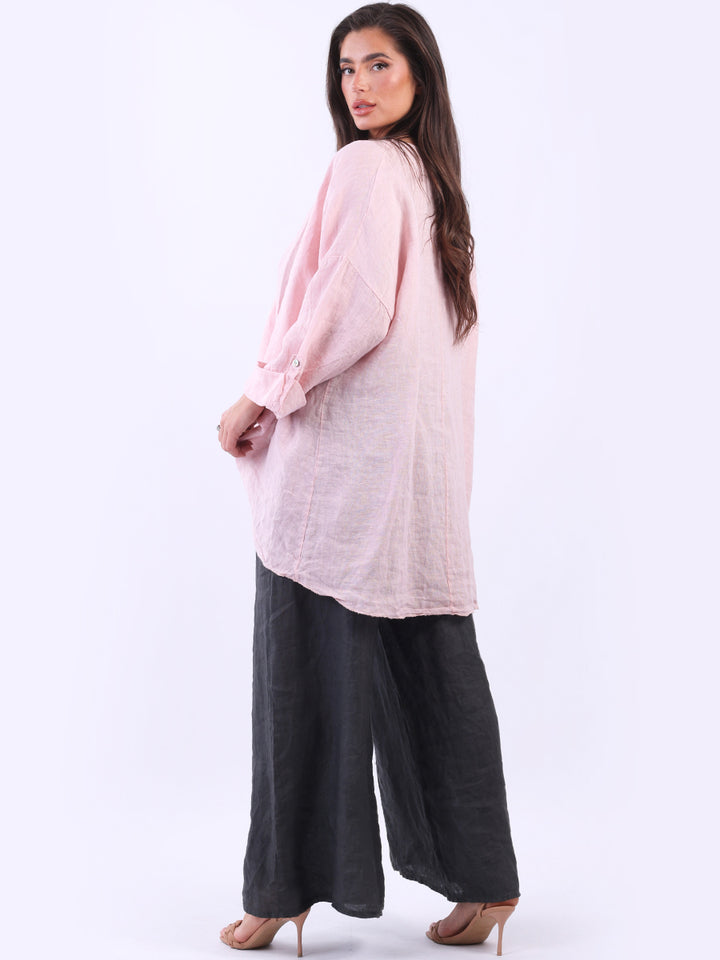 Perfect and ideal for summer and spring this is the look that will make women wearers love dressing up. Made in Italy with finest linen the top has lush V-neckline, baggy plus size and button up sleeves. The top can be used as layering or be worn as is with leather pants and boots for a chic finish.
