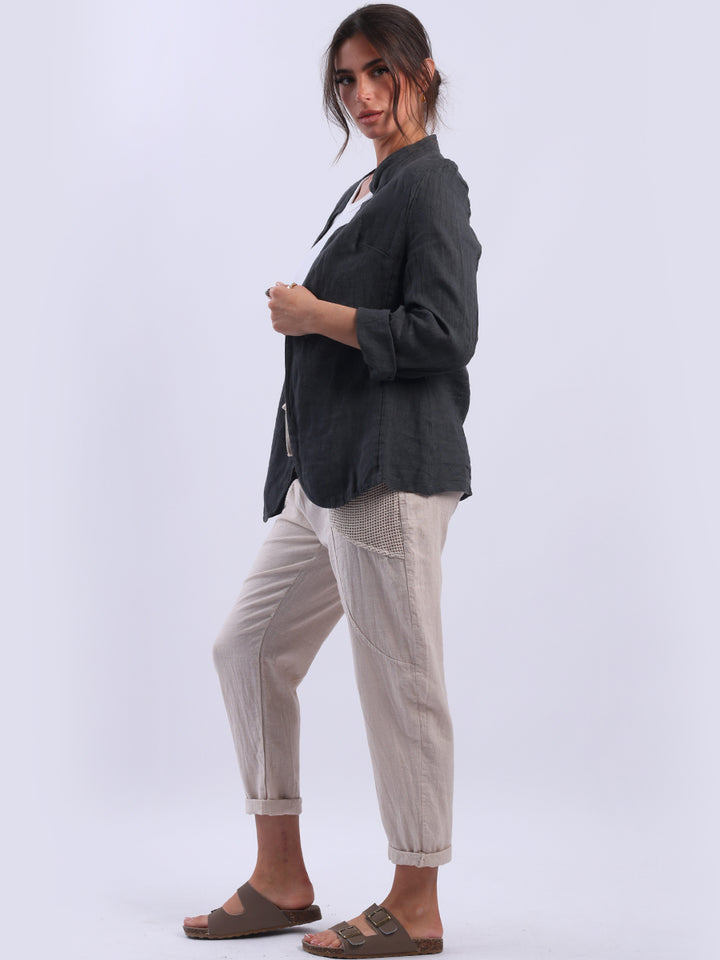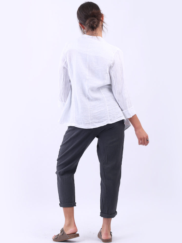 Laid back and comfy that is in high demand among women wearers. Made in Italy with high quality lino and features that are on-trend like front open, long rolled up sleeves and baggy plus size fit. Wear it as is over wide leg pants and coat to work with high heels.