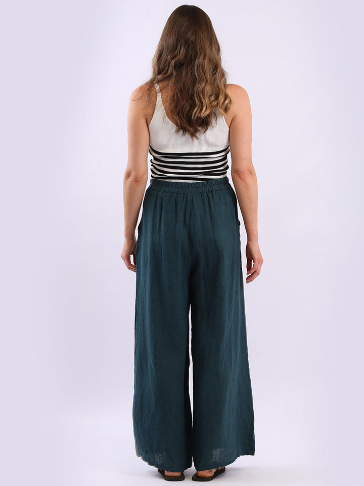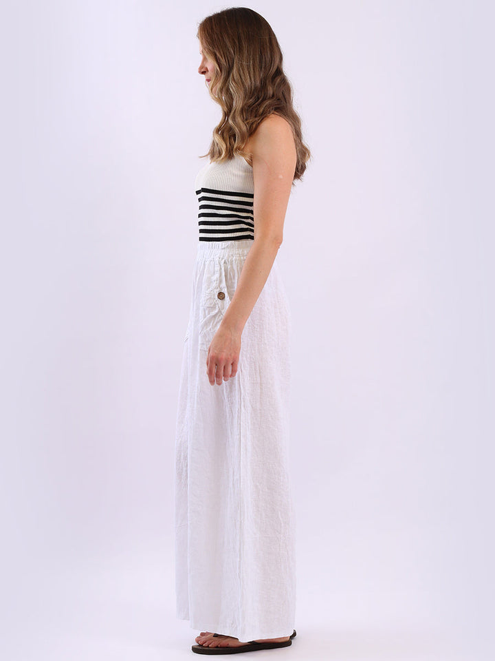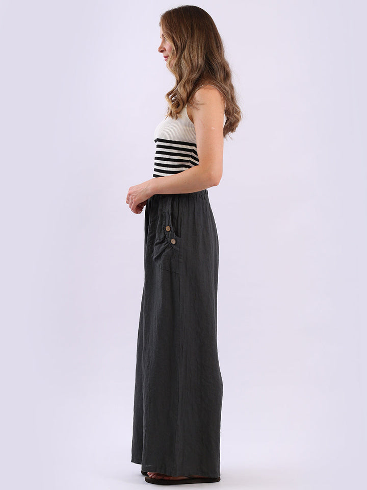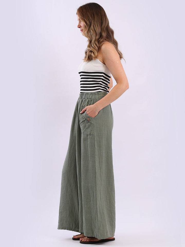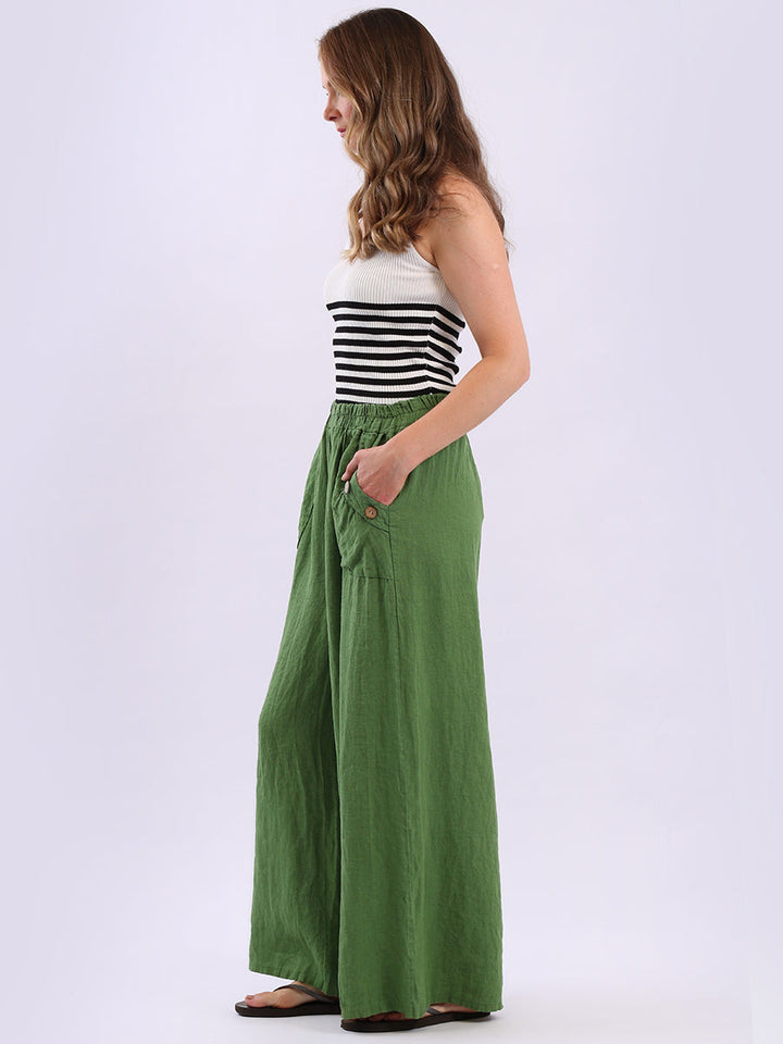 Crafted in Italy and designed with plus-size wearers in mind, these linen palazzo trousers are a staple for easy, everyday fashion. Featuring an elasticated waistband, roomy fit, and functional side pockets with eye-catching button details, they deliver both comfort and style. Ideal for summer stock, lightweight, breathable, and perfect for laid-back looks.