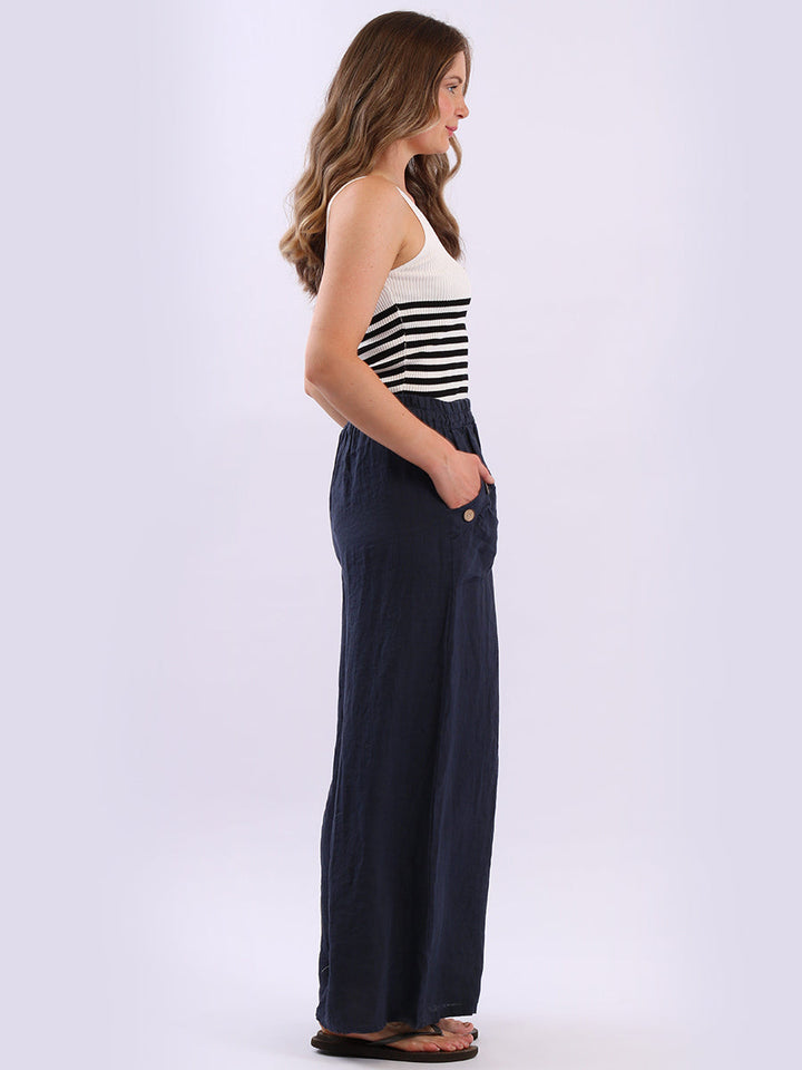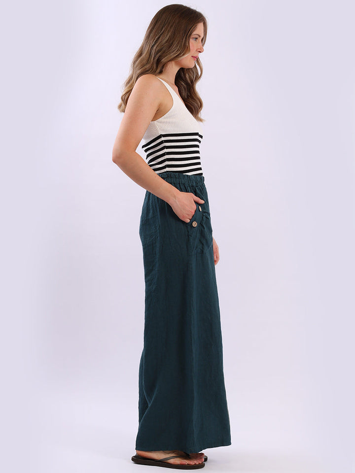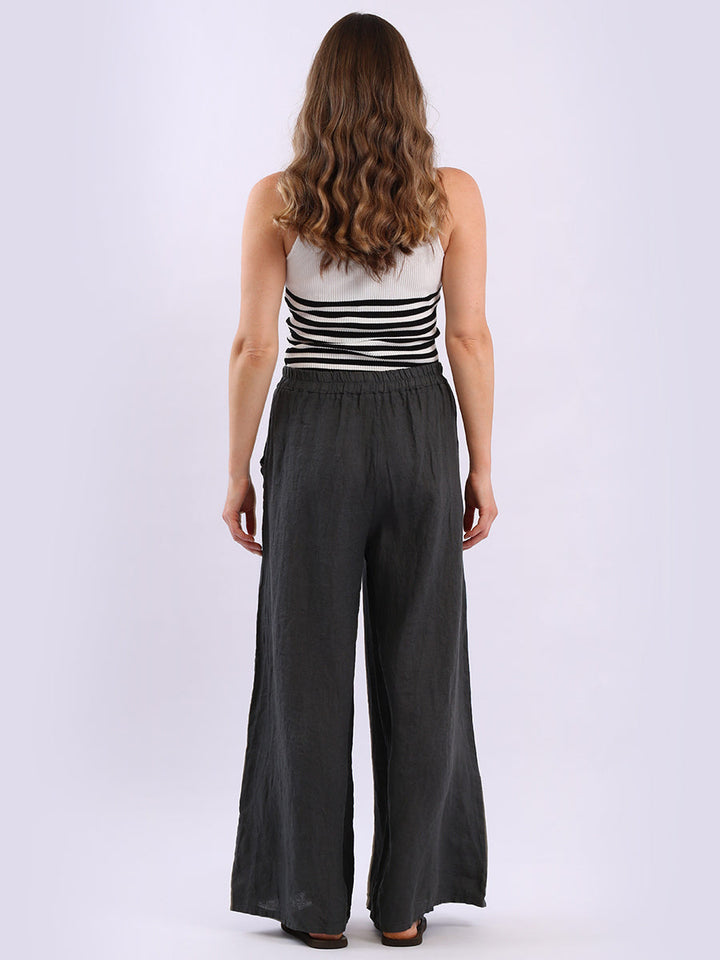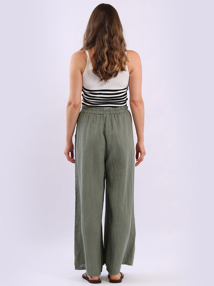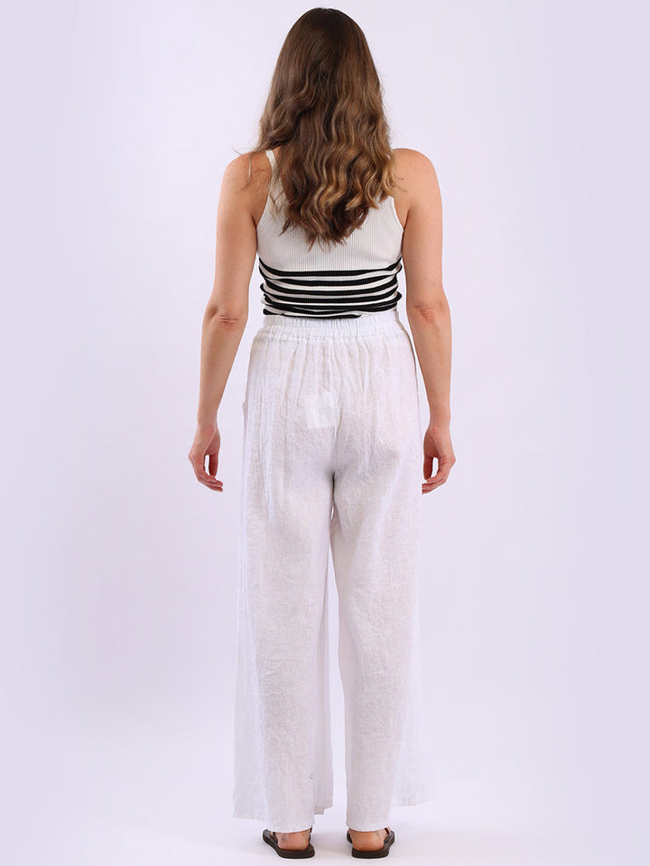 Crafted in Italy and designed with plus-size wearers in mind, these linen palazzo trousers are a staple for easy, everyday fashion. Featuring an elasticated waistband, roomy fit, and functional side pockets with eye-catching button details, they deliver both comfort and style. Ideal for summer stock, lightweight, breathable, and perfect for laid-back looks.