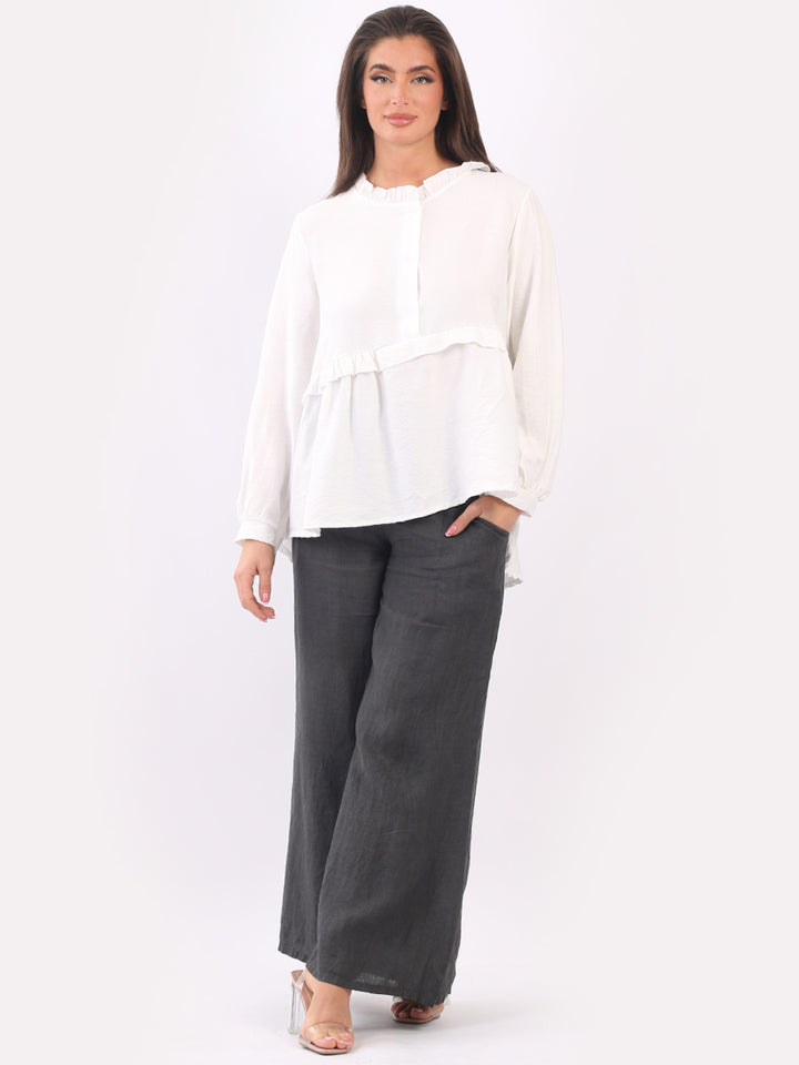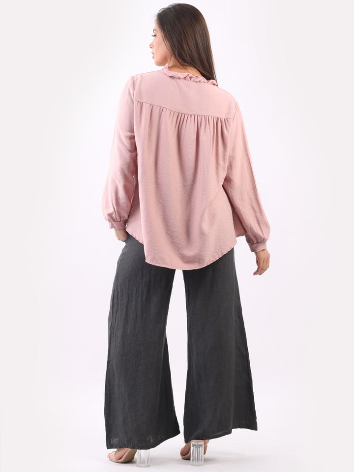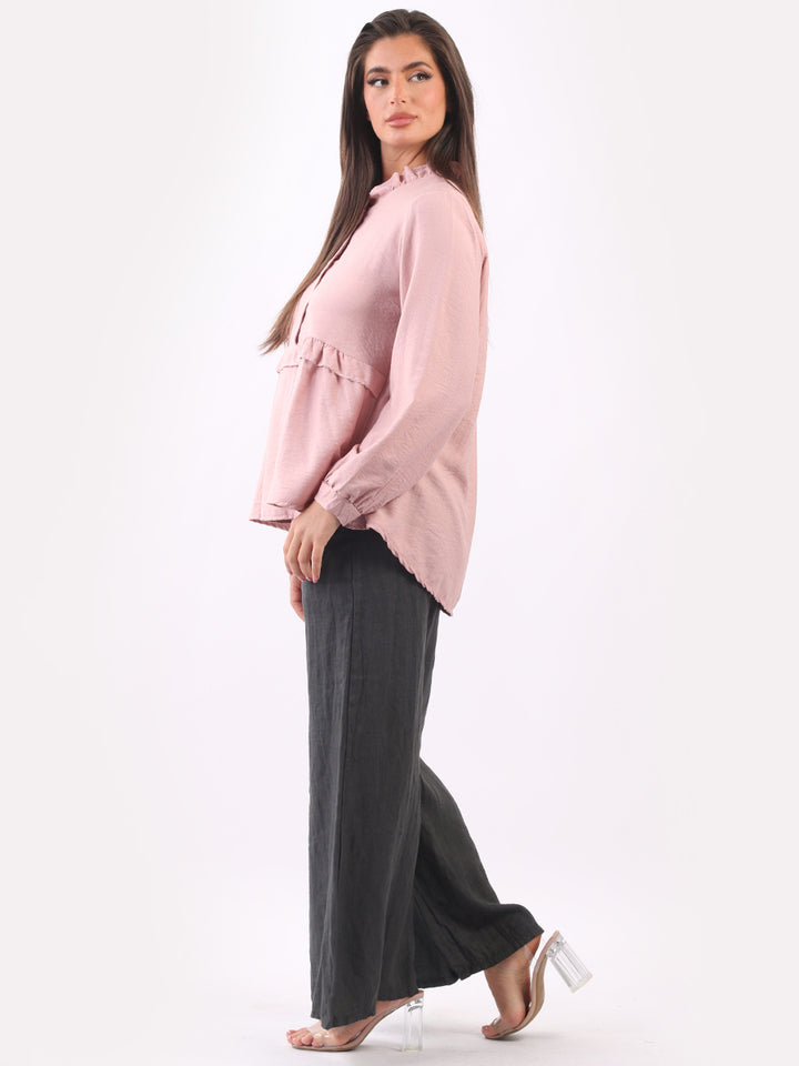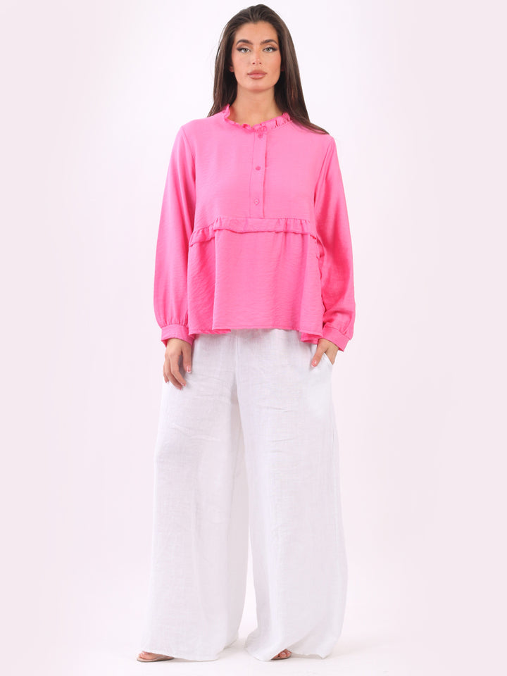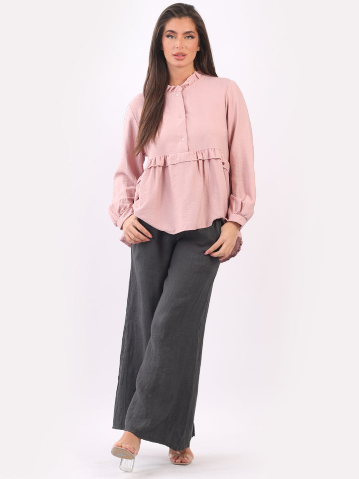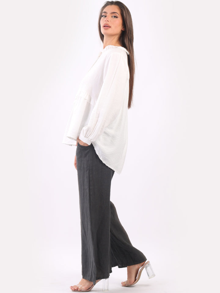 classy and nostalgic this is the magical look that is all hype and craze this season. Made in Italy with finest soft cozy fabric, the eye-catching features like stunning ruffle style neckline with front button details, baggy fit with shirred style waist for a sleek touch, long sleeves and neutral tones makes it ideal for everyday wear from casual to work. Just toss in Redwholesale wide leg formal pants and high heels for a chic finish
