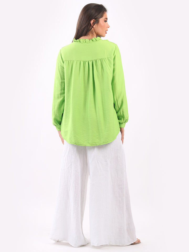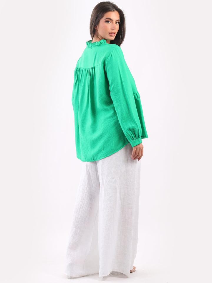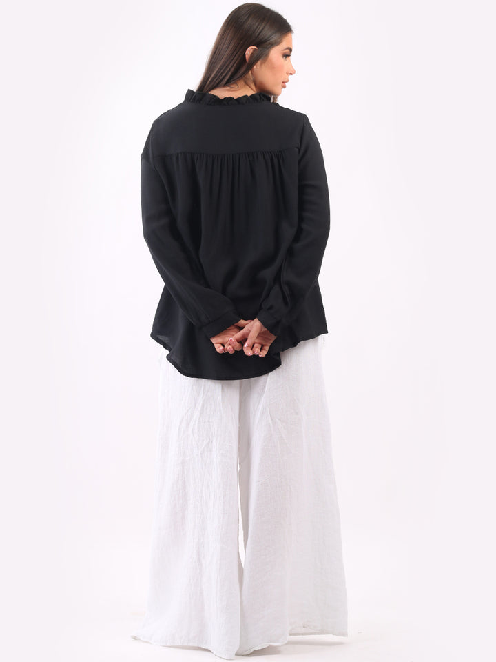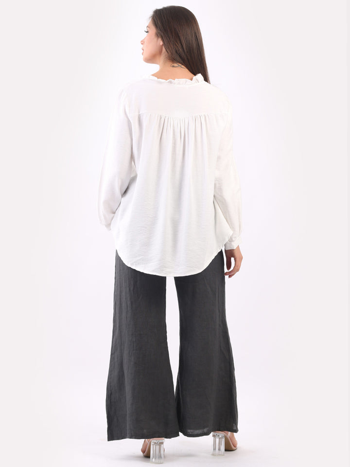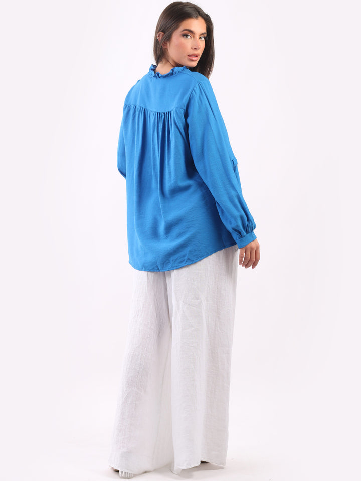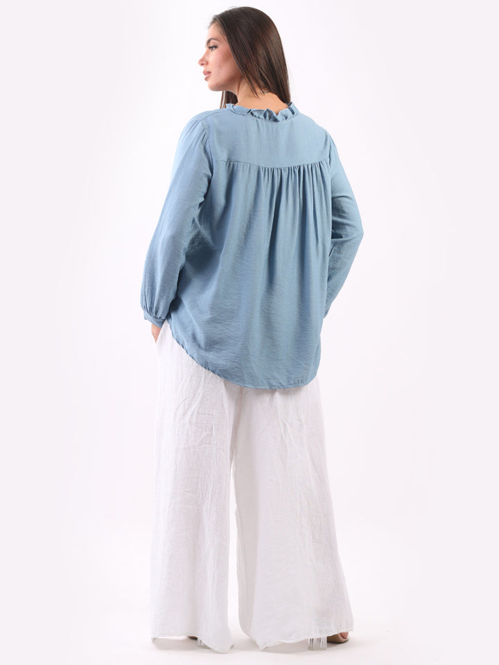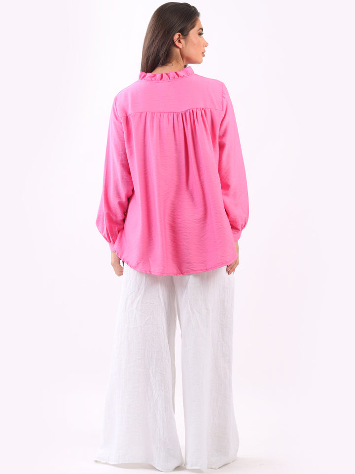 classy and nostalgic this is the magical look that is all hype and craze this season. Made in Italy with finest soft cozy fabric, the eye-catching features like stunning ruffle style neckline with front button details, baggy fit with shirred style waist for a sleek touch, long sleeves and neutral tones makes it ideal for everyday wear from casual to work. Just toss in Redwholesale wide leg formal pants and high heels for a chic finish